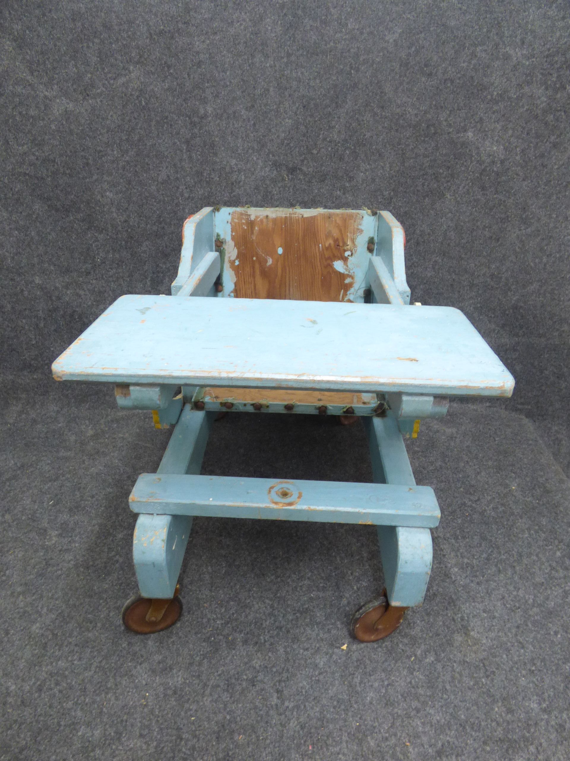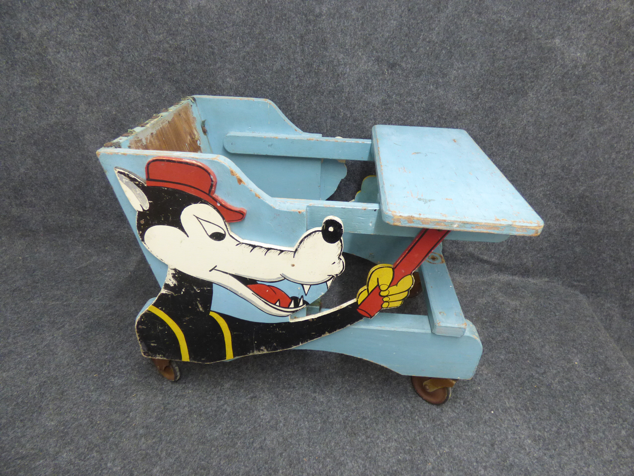 A vintage wooden child’s walker or highchair on wheels primarily light blue in colour with a graphic of a cartoon wolf in black, white, and red on both side panels. 52cm long