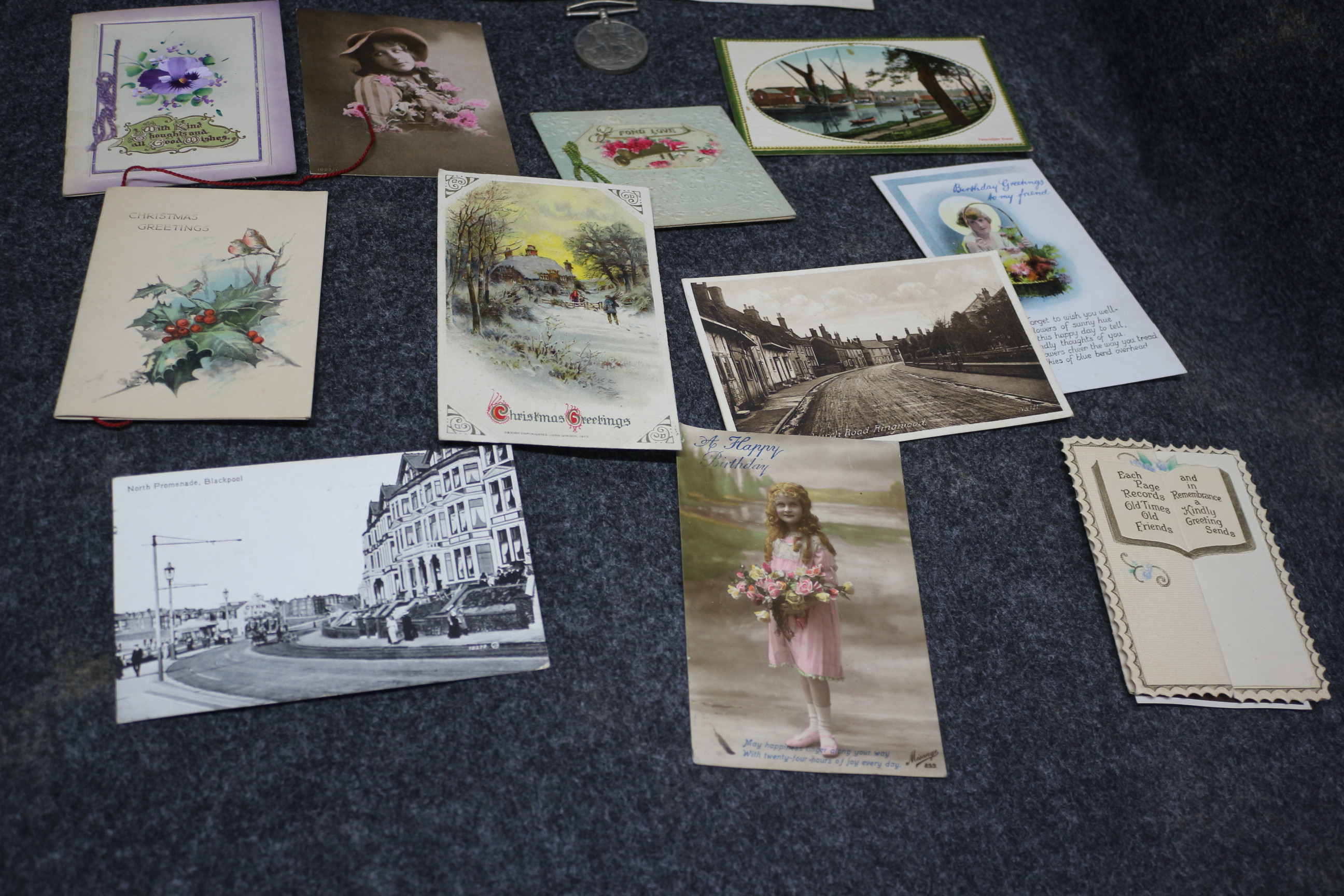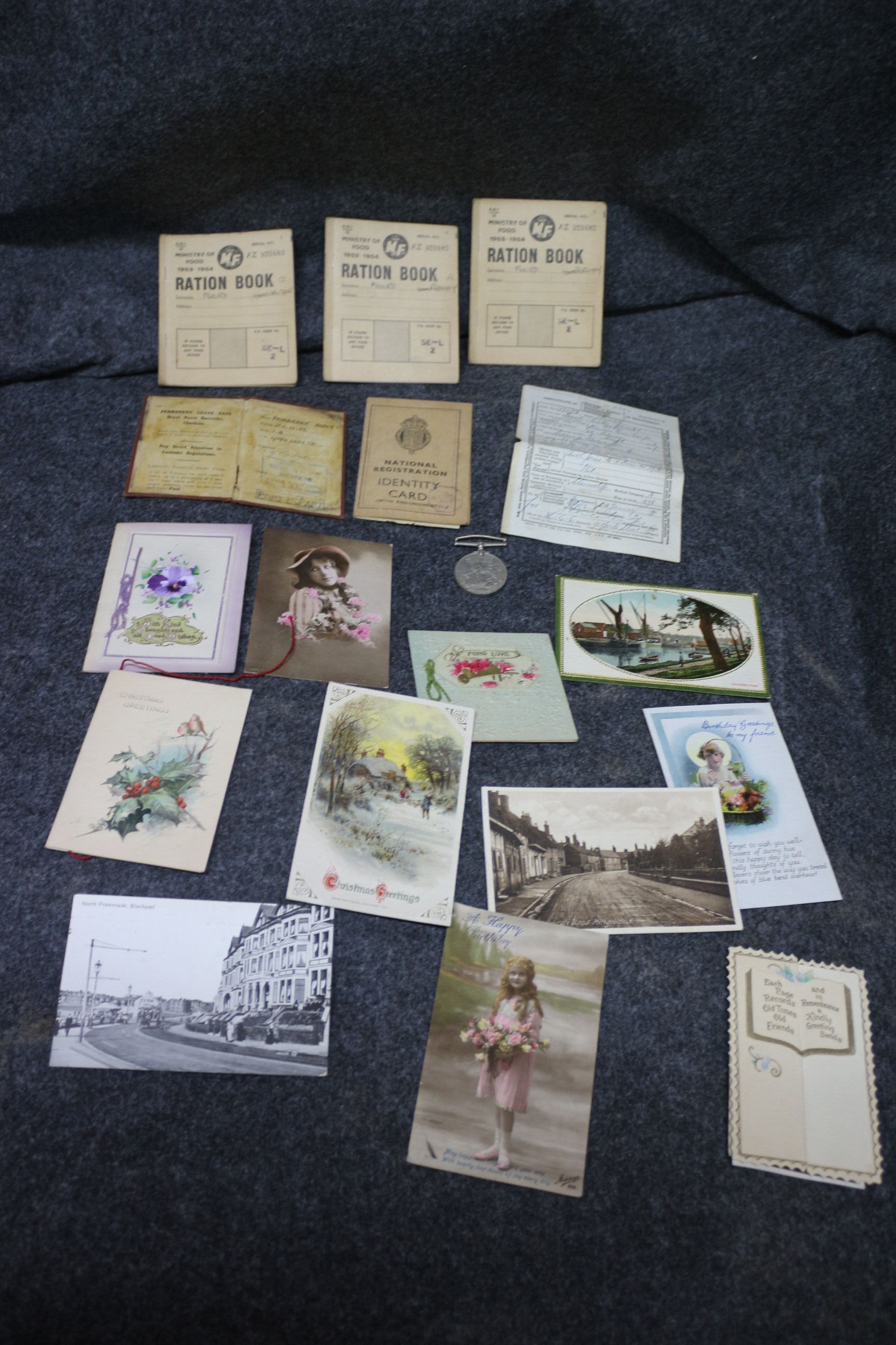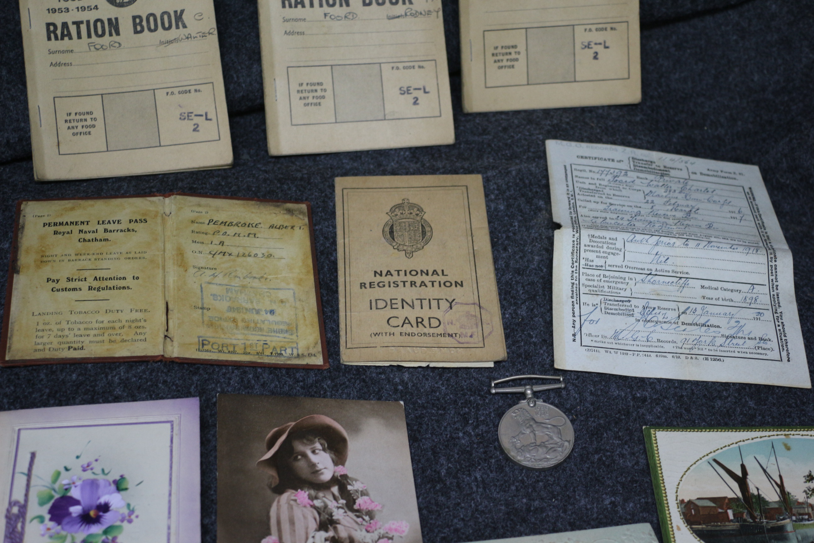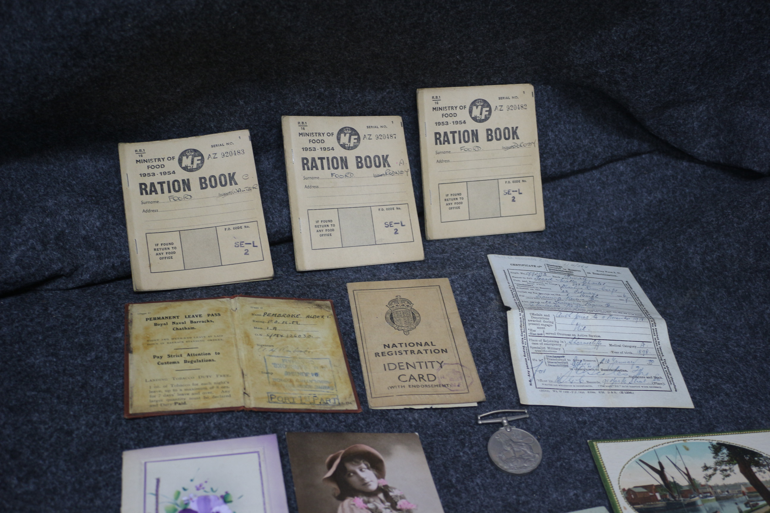 A collection of vintage paper ephemera featuring three 1953-1954 Ministry of Food ration books, a National Registration identity card, a Royal Naval Barracks permanent leave pass, various illustrated greeting cards, and a silver-toned medal.