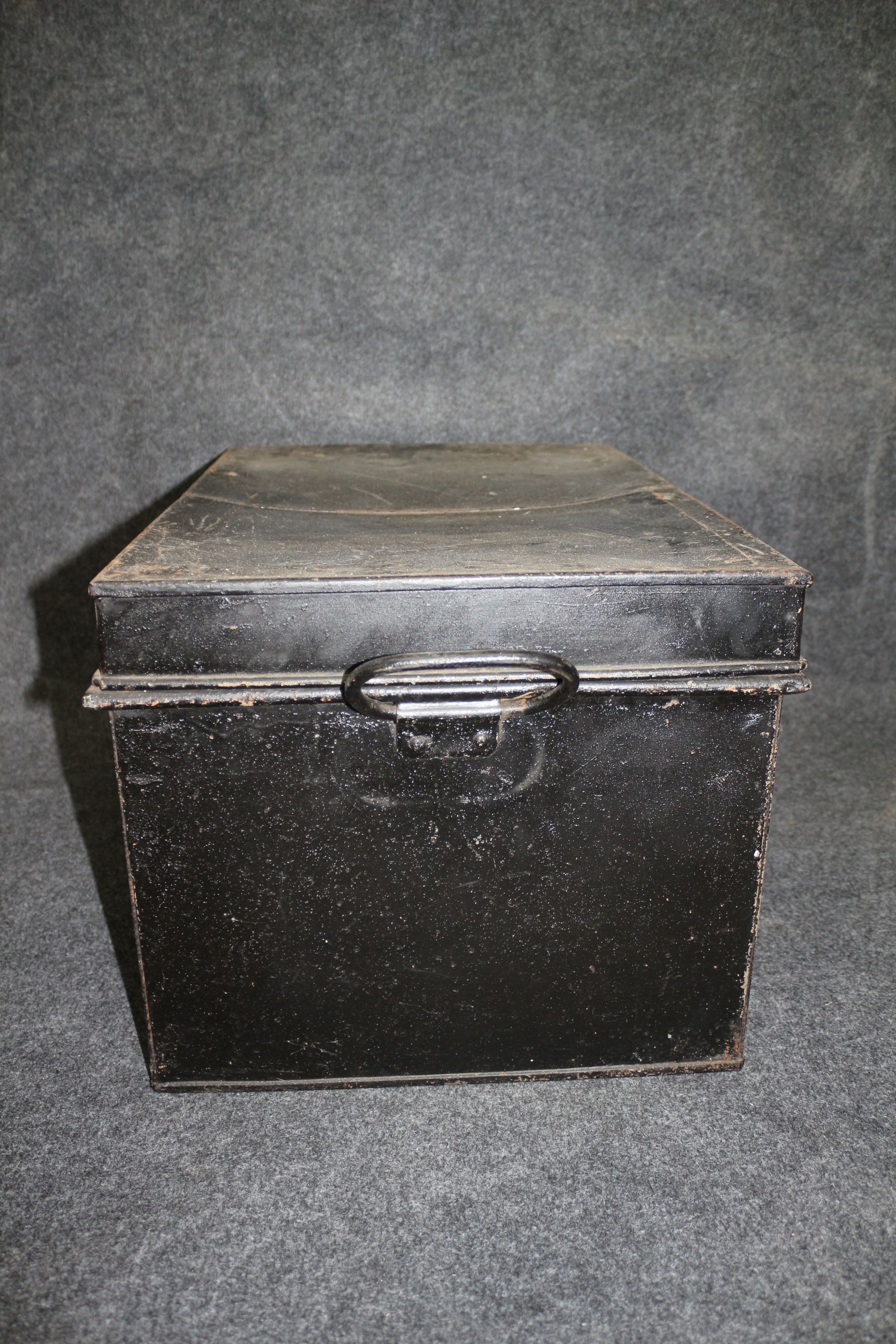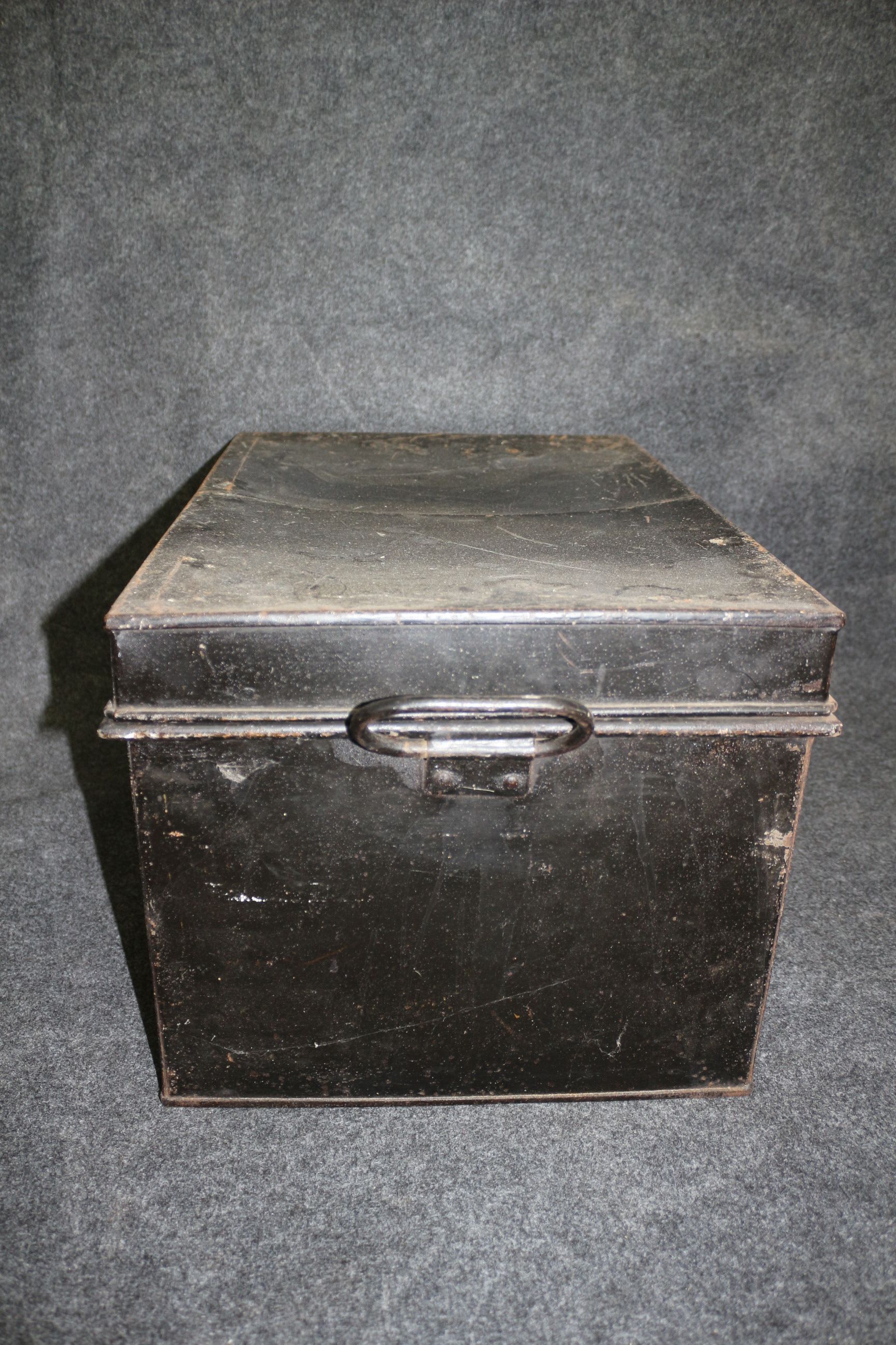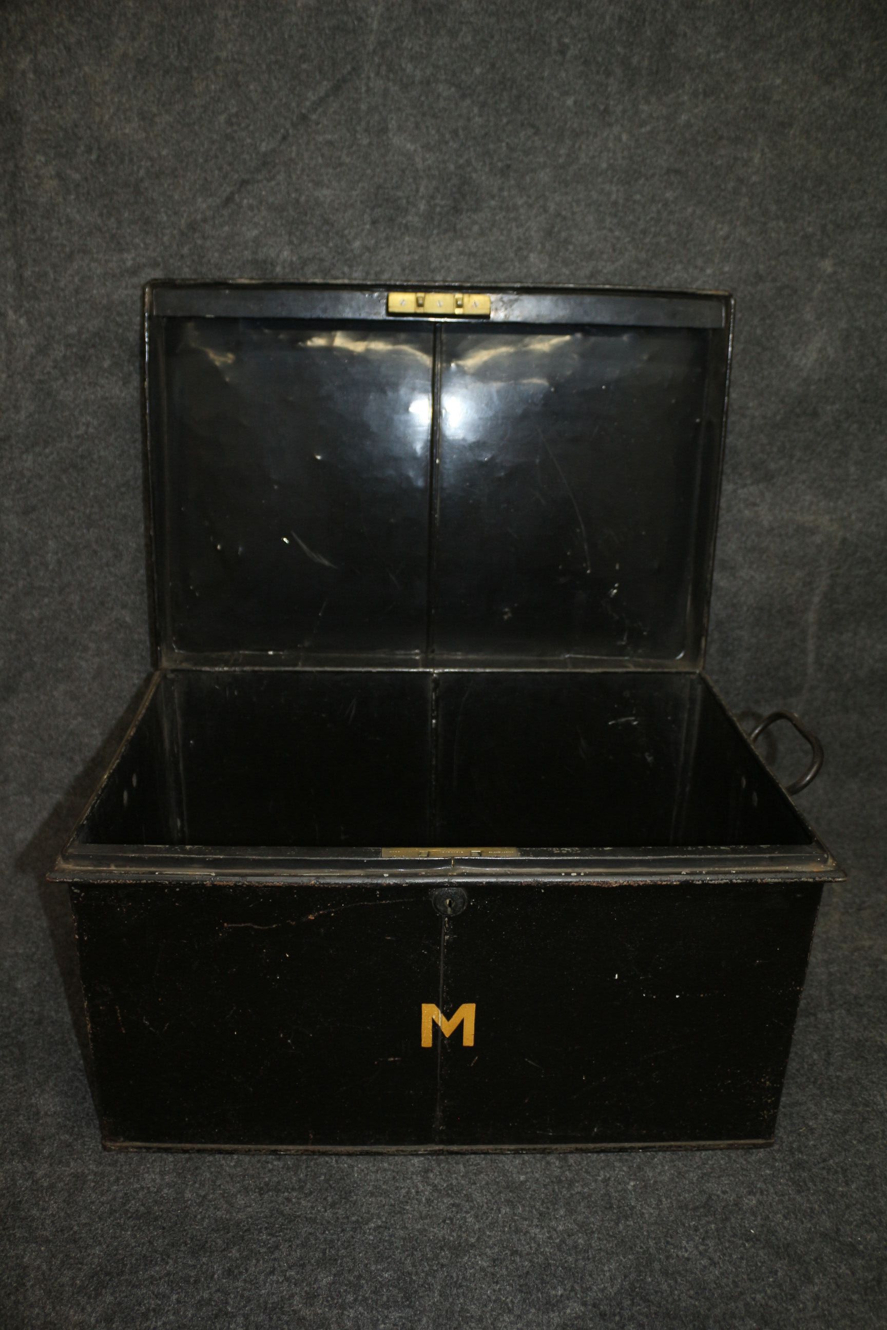 A black metal deed box featuring a hinged lid, side carry handles, and a prominent yellow letter M on the front face. 30cm tall, 51x35cm