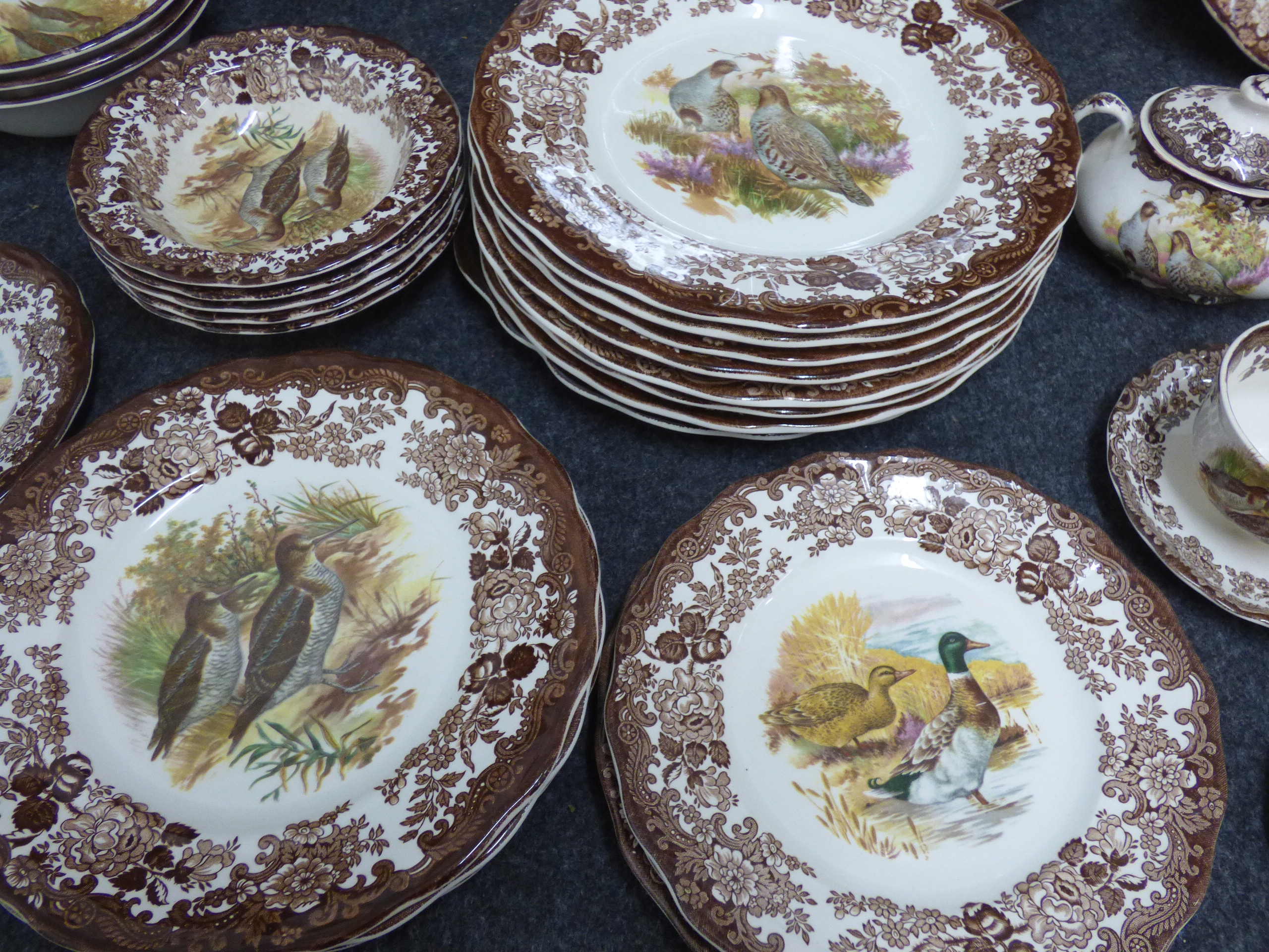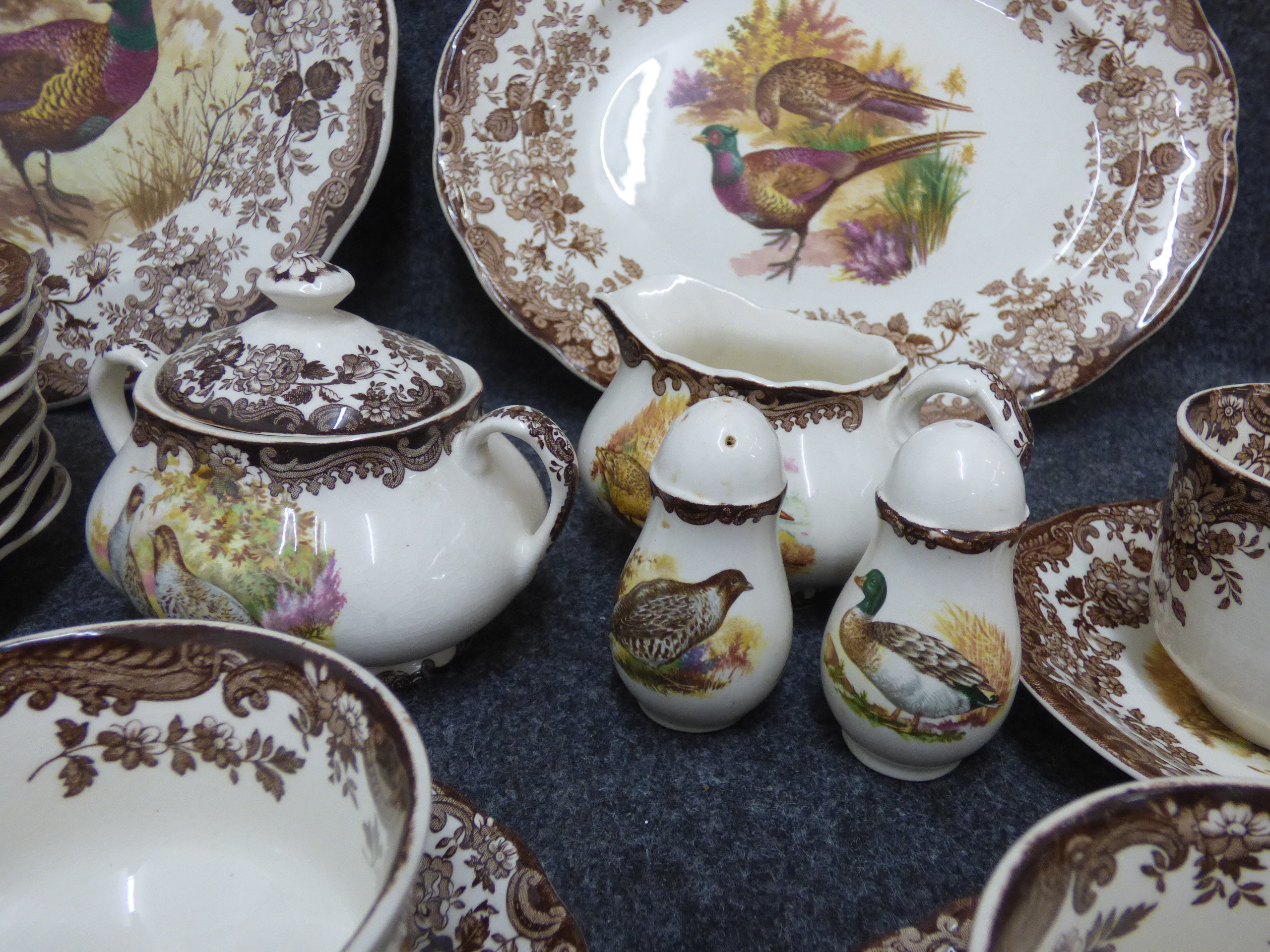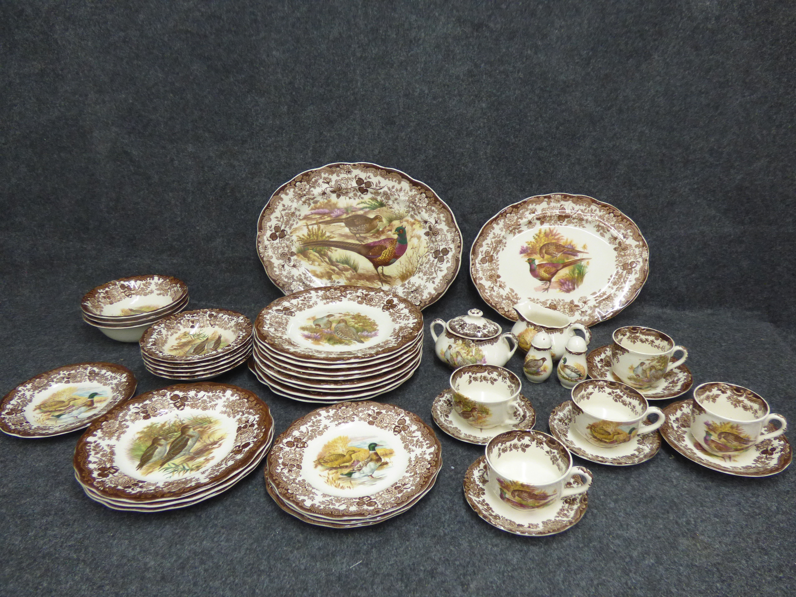 A collection of cream-coloured porcelain dinnerware and tea service items featuring brown floral borders and multi-coloured bird illustrations including platters, plates, bowls, and teacups. Various amounts of each