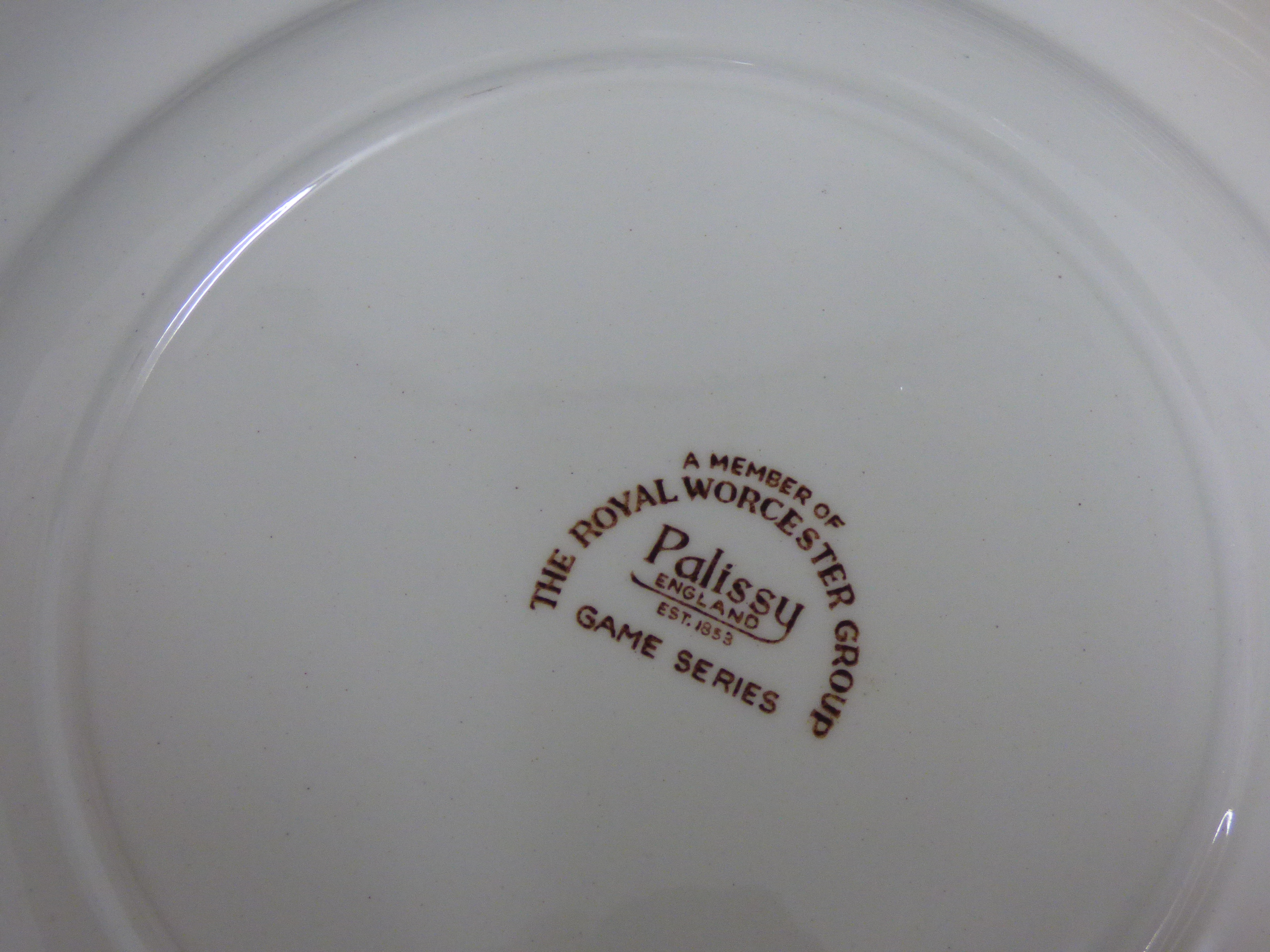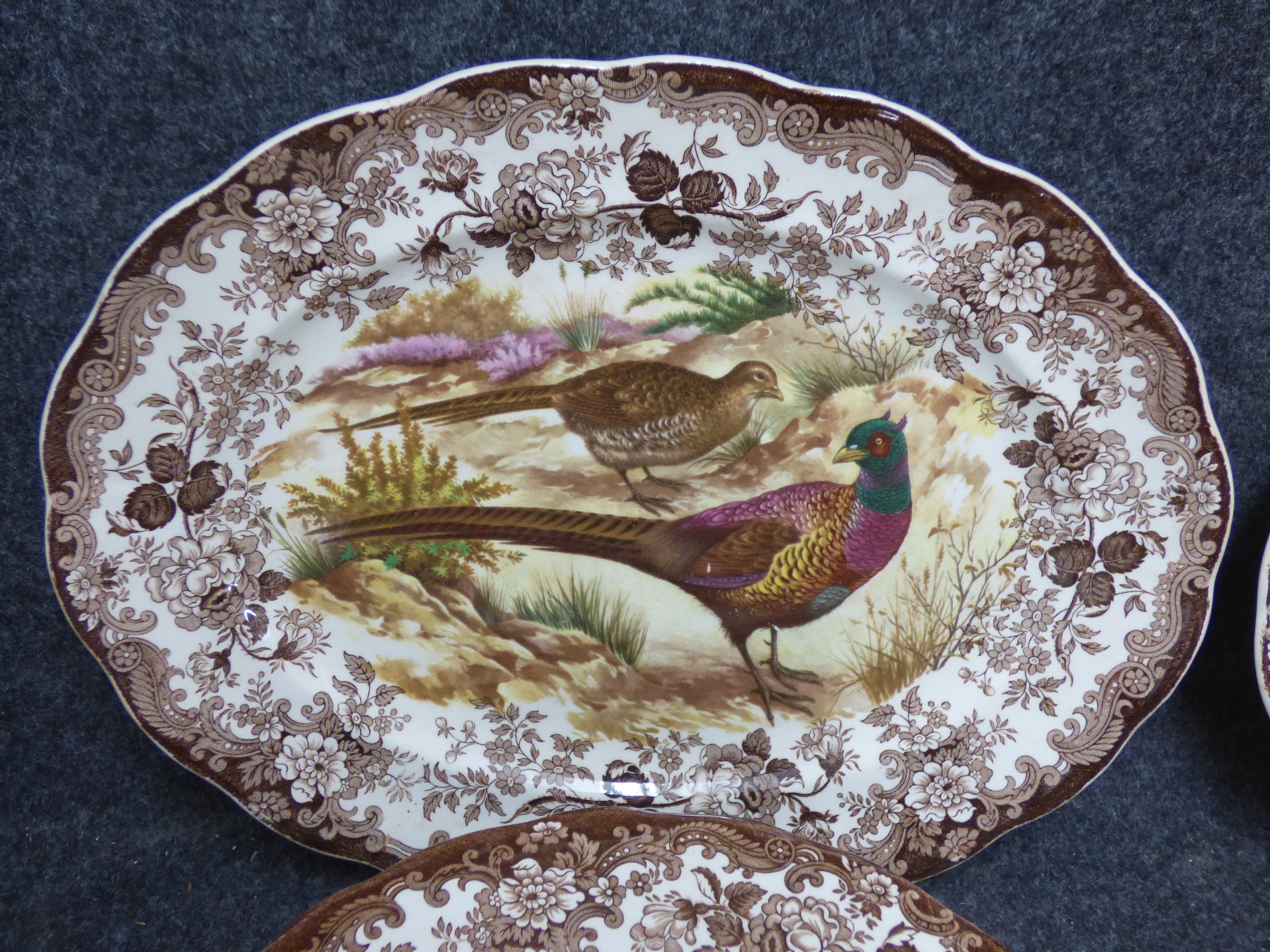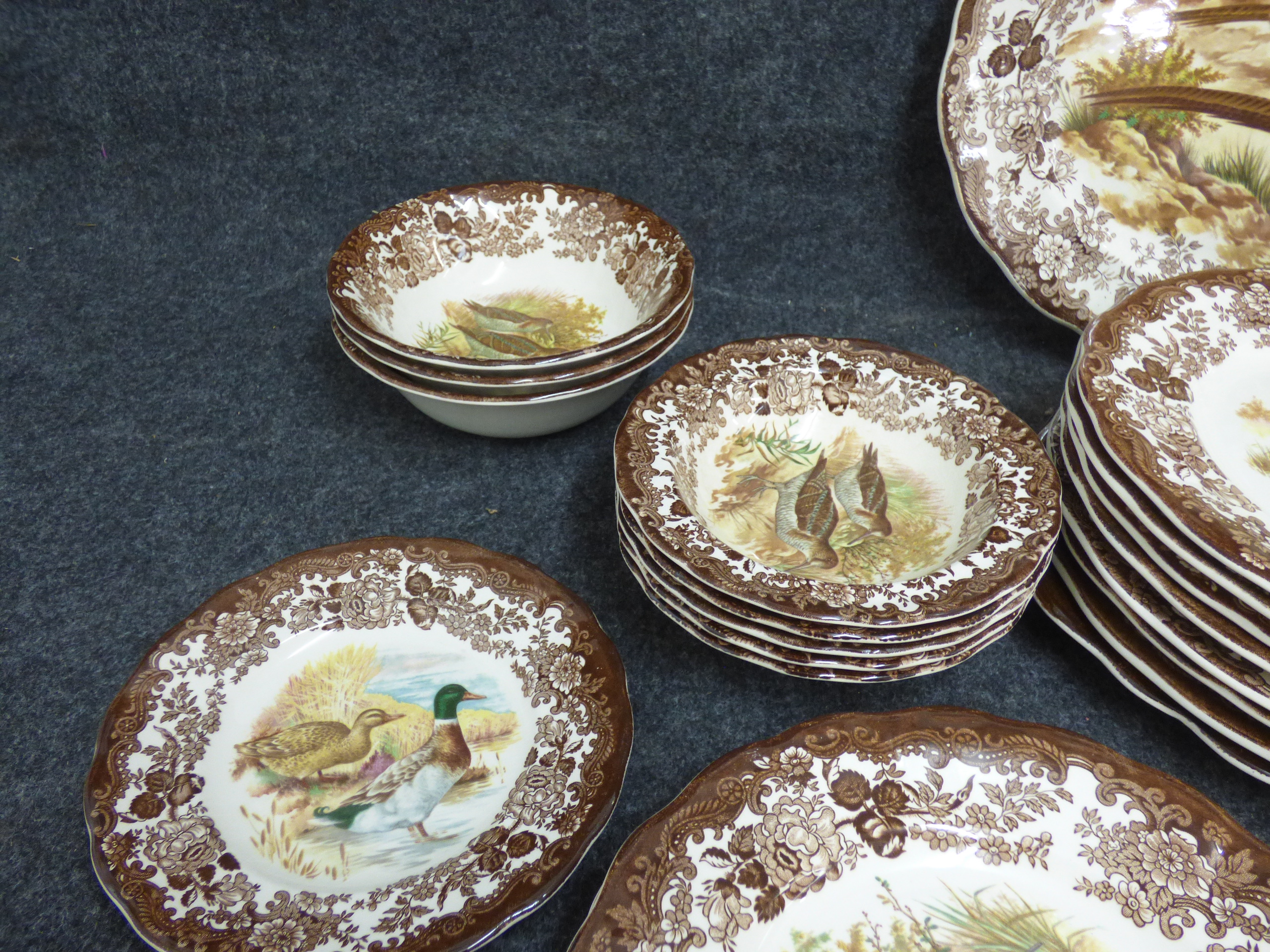 A collection of cream-coloured porcelain dinnerware and tea service items featuring brown floral borders and multi-coloured bird illustrations including platters, plates, bowls, and teacups. Various amounts of each