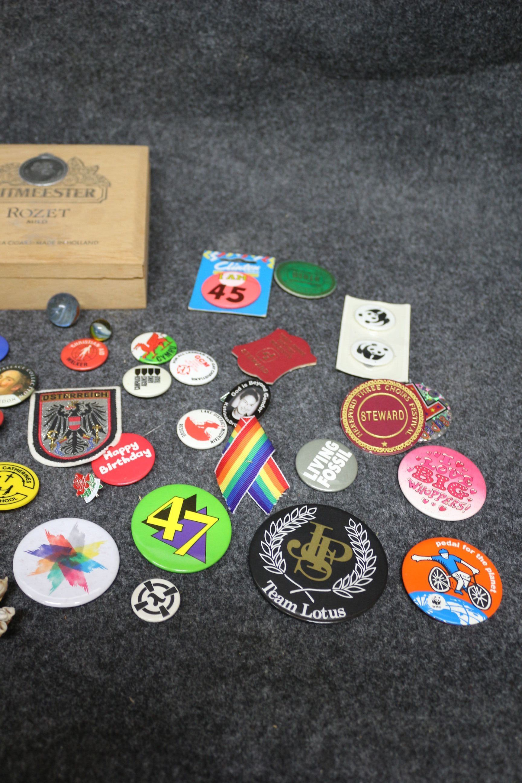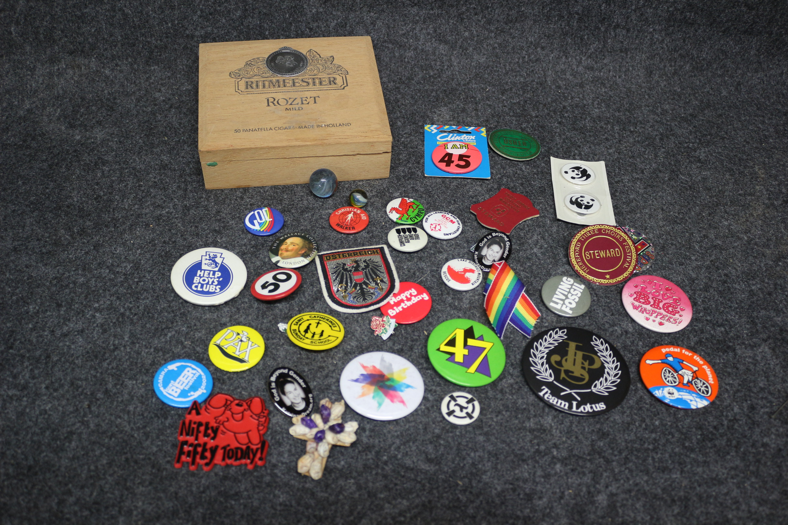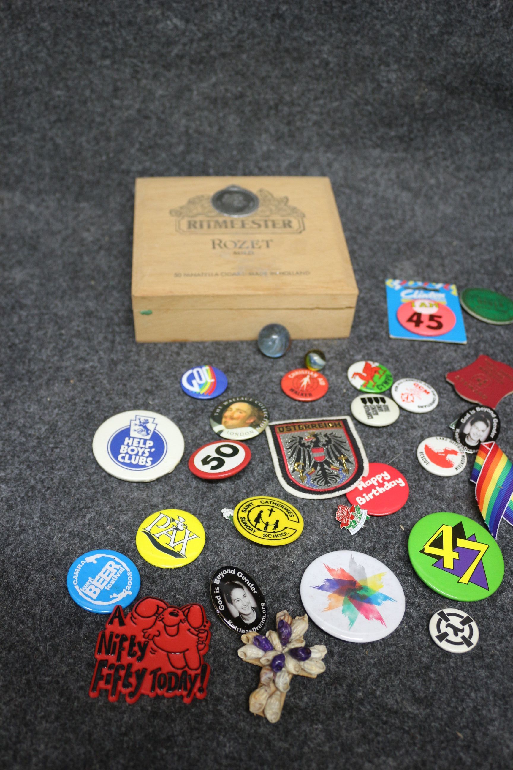 A collection of items including a Ritmeester Rozet Mild wooden cigar box, various pin badges, an Osterreich embroidered patch, marbles, and a shell-decorated cross.