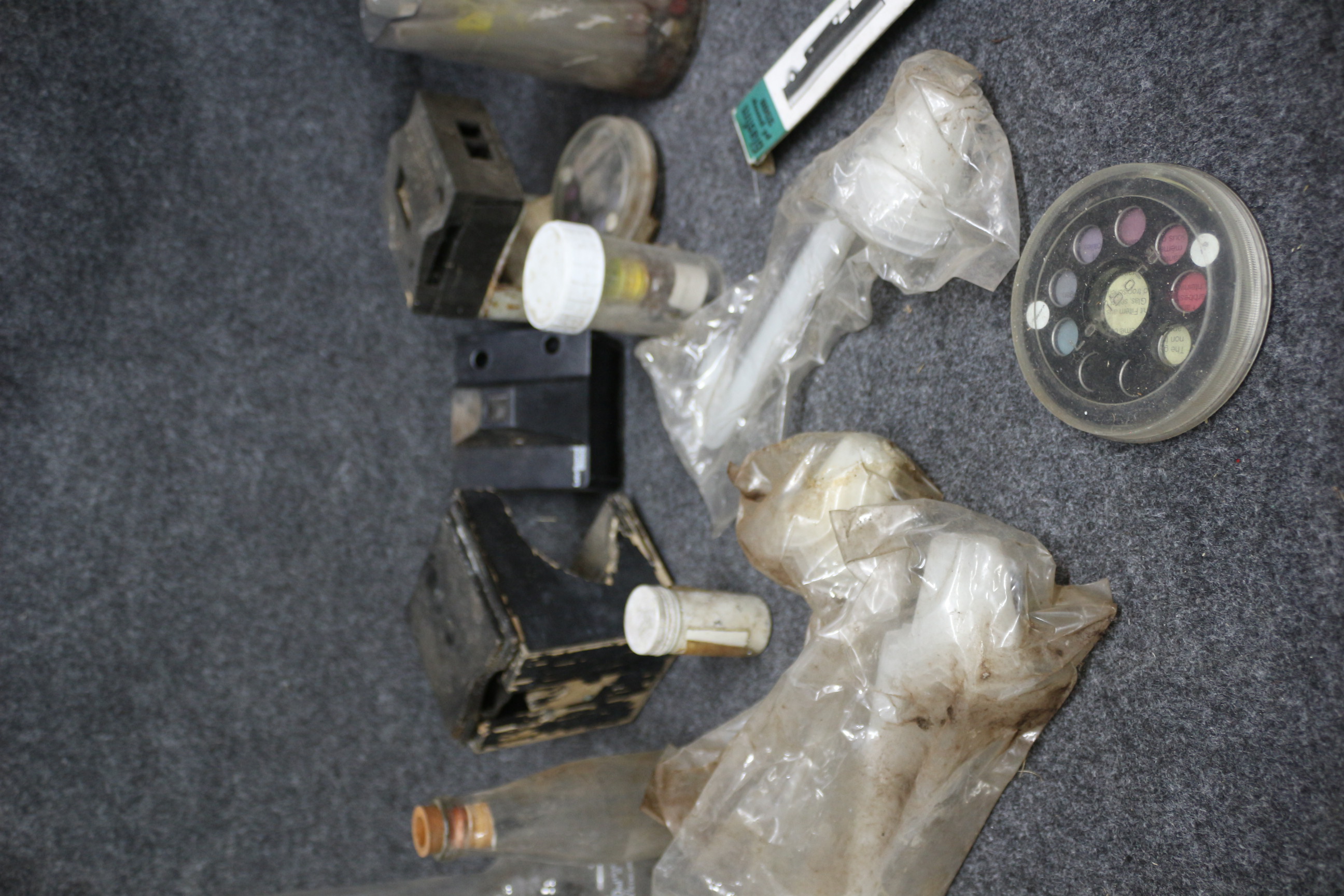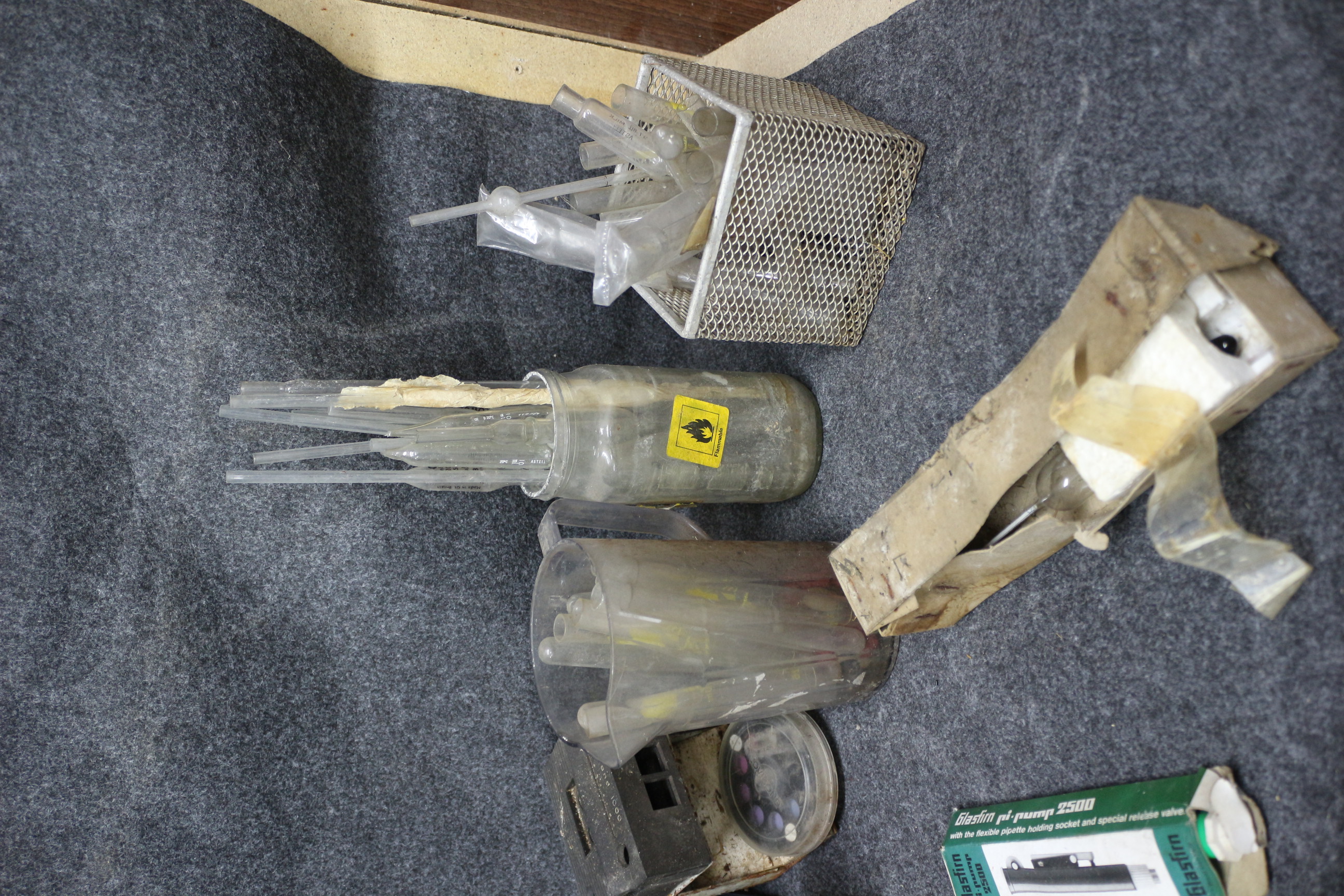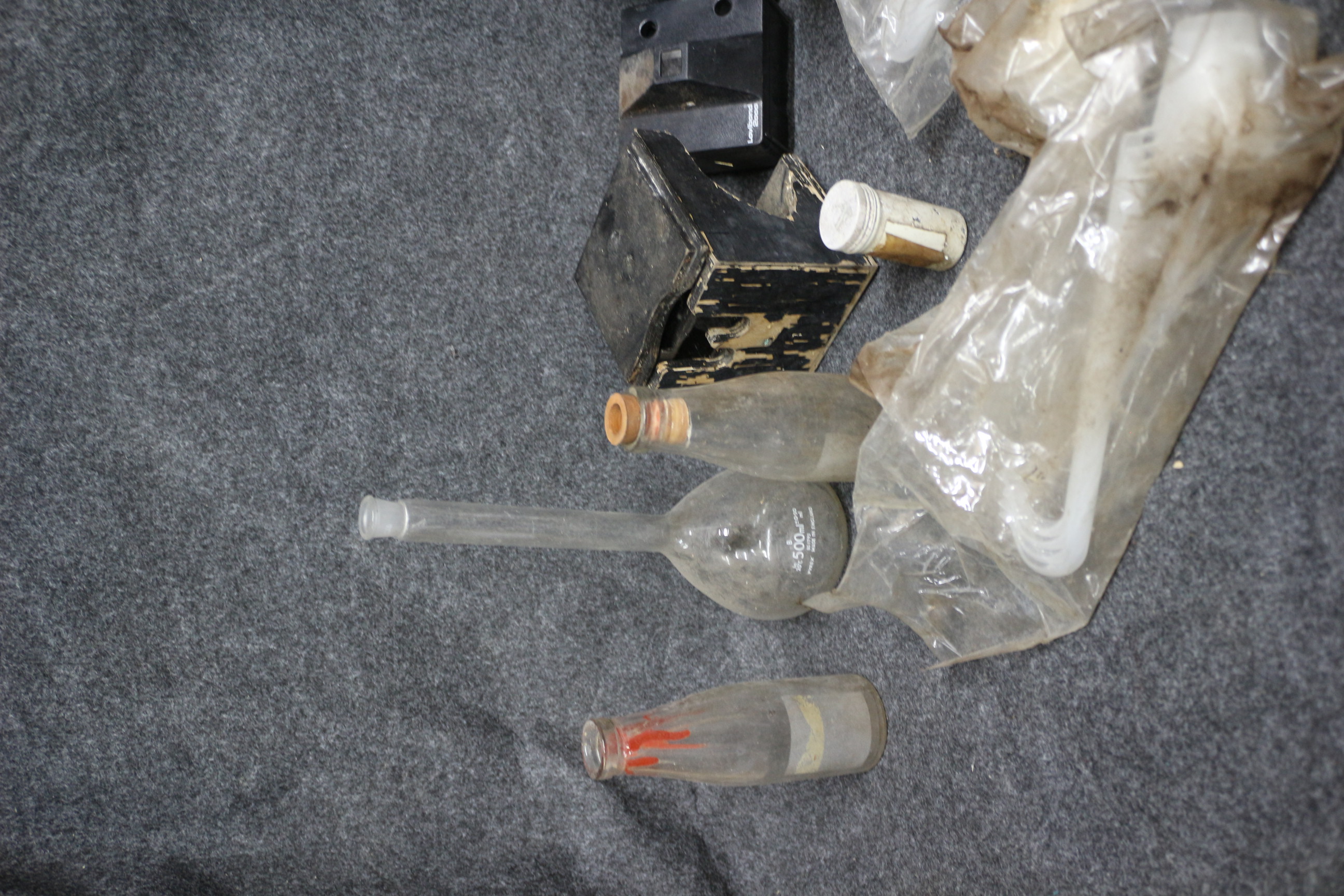 A collection of laboratory equipment including a 500ml flask, a Lovibond 2000 device, a Glasfirm pi-pump 2500, and various pipettes and test tubes.