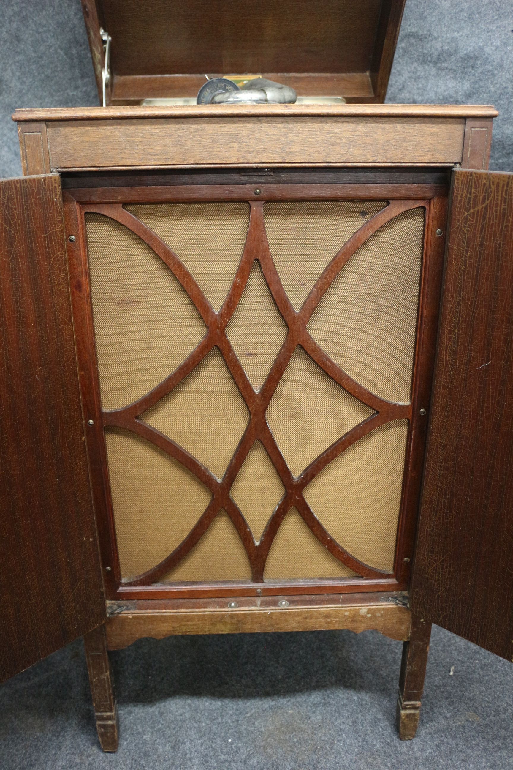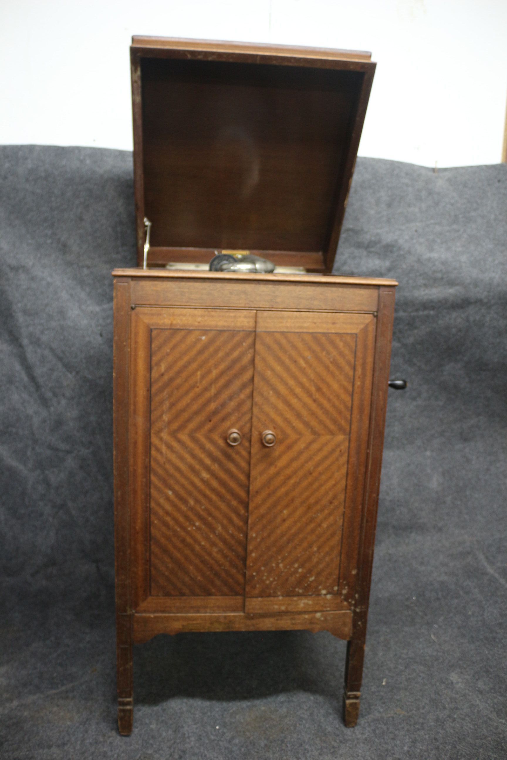 A brown wooden floor-standing gramophone featuring chevron-patterned doors, a No. 5A reproducer, and a Parlophone record on the turntable.