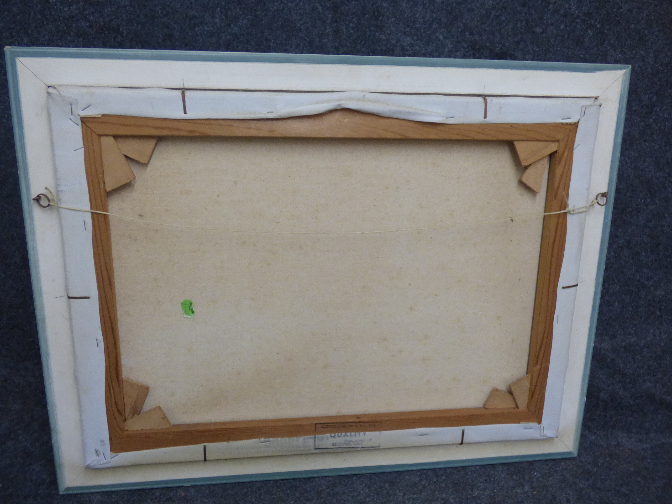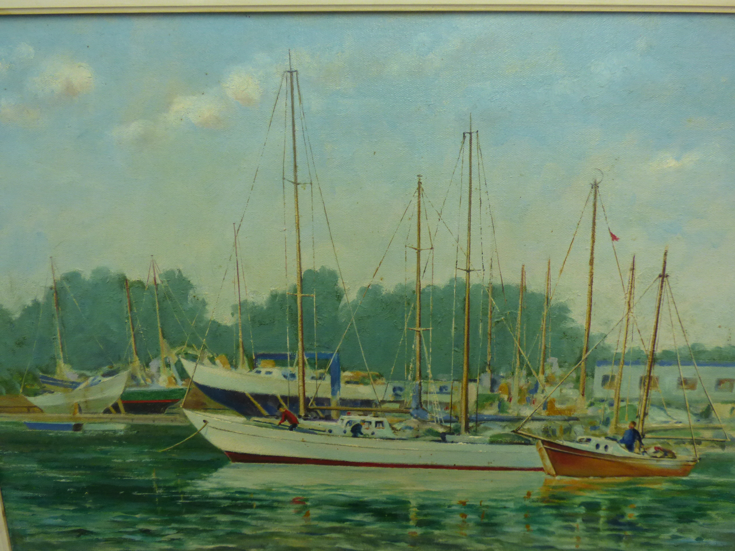A framed oil on canvas painting depicting several sailboats in a harbour, signed Roland A. Lander and dated 1978 in the lower right corner. 63x48cm