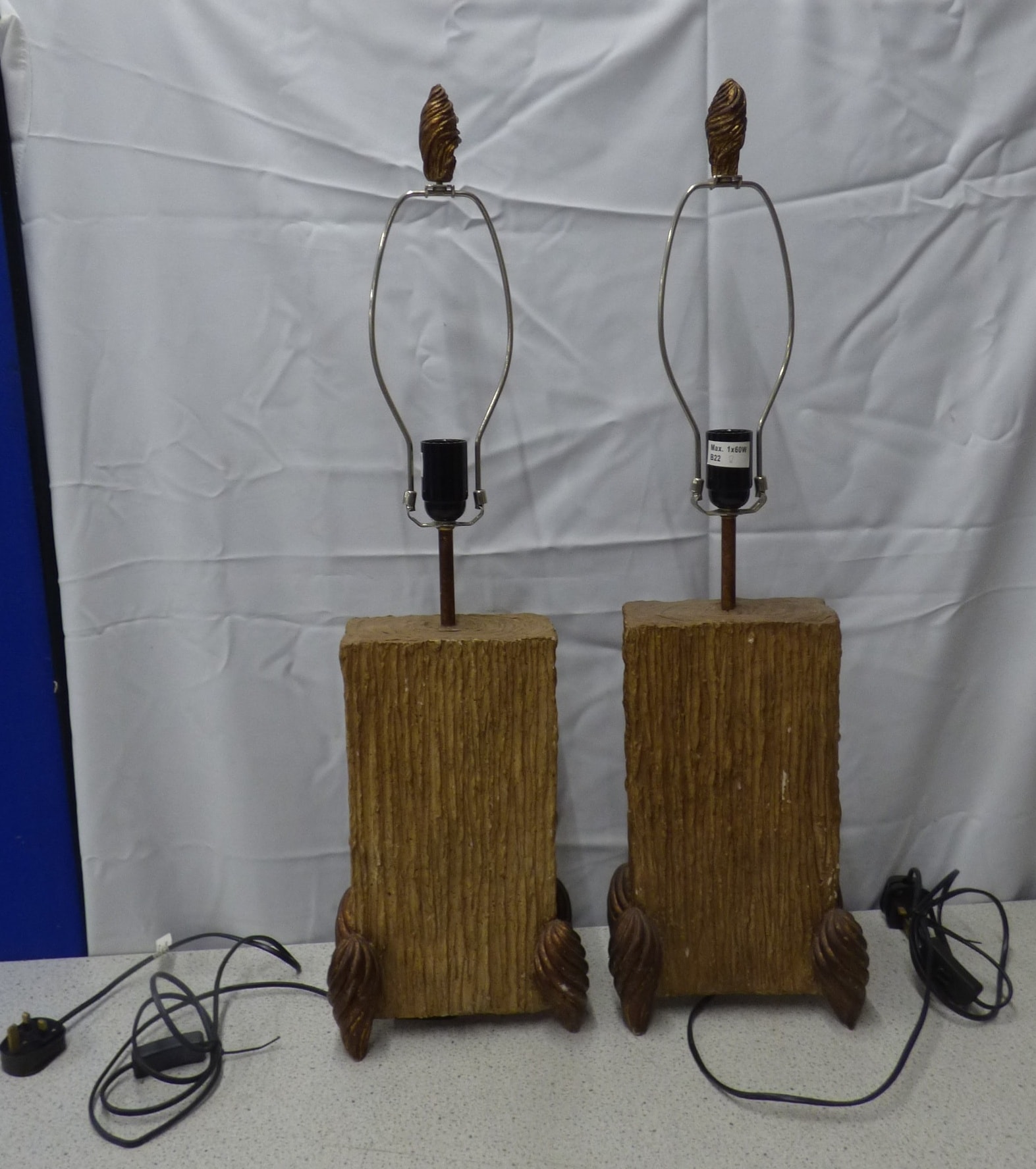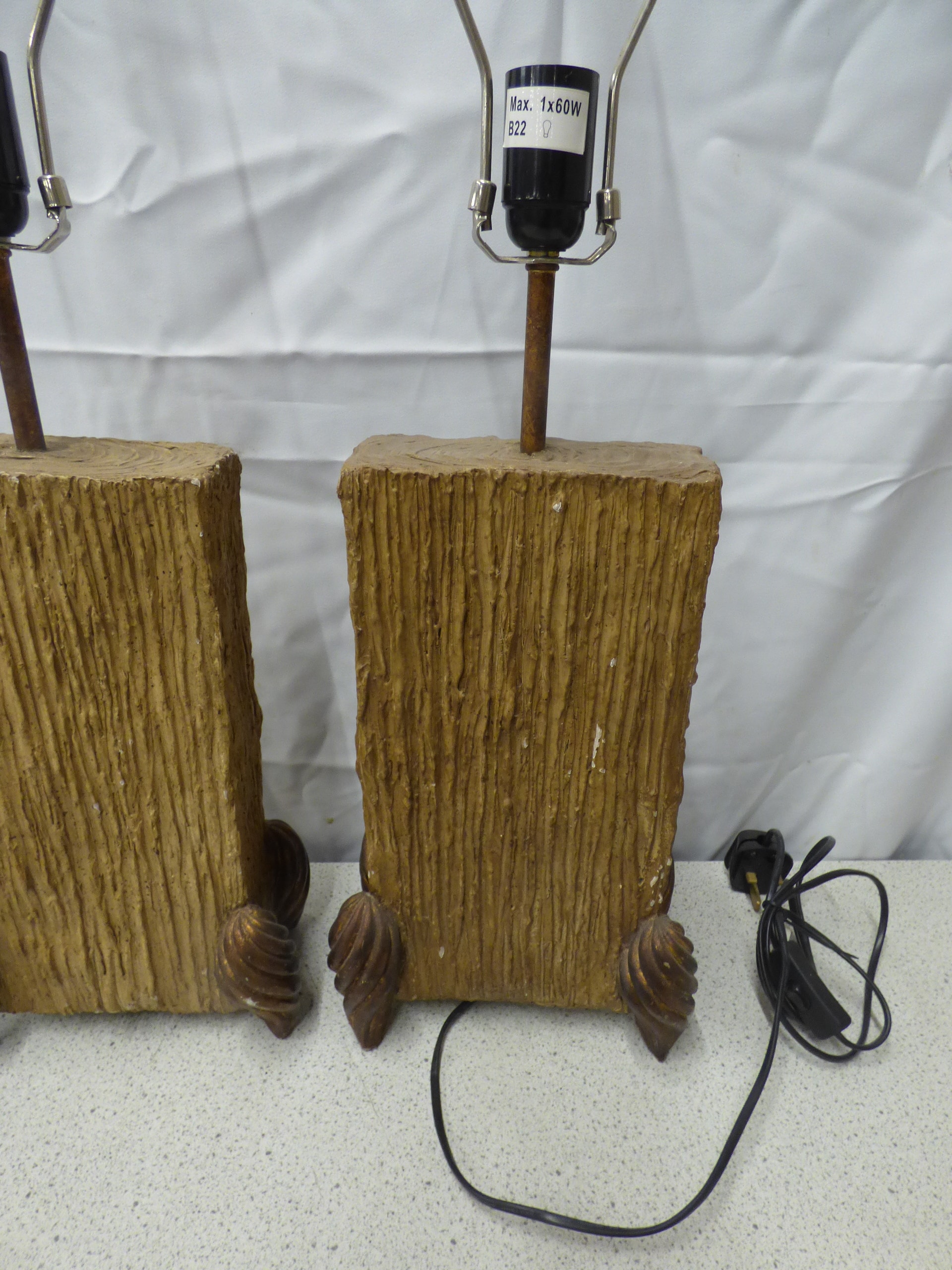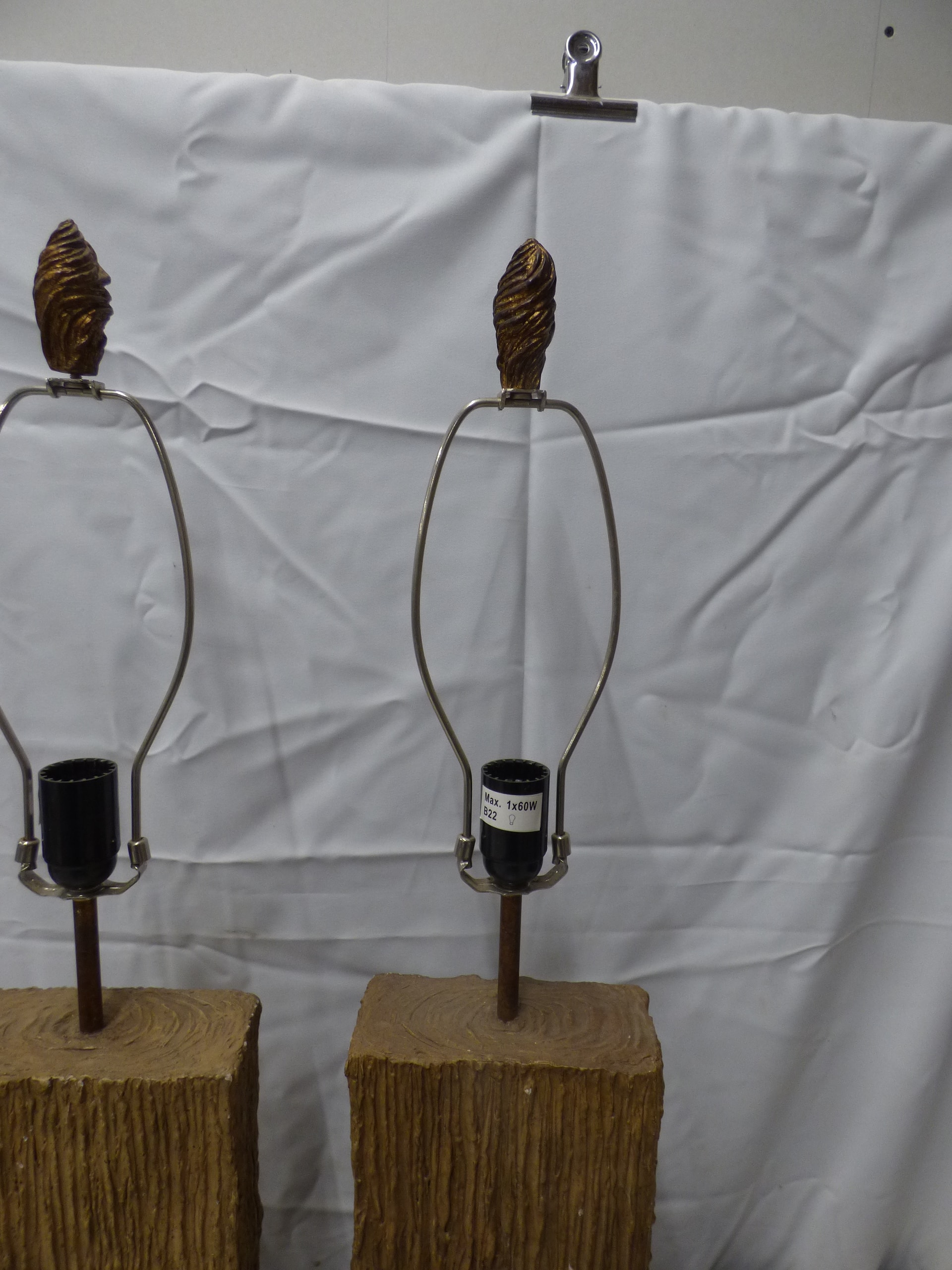 A pair of tan/light brown table lamps with bark affect, model TA1105 by FLAMBEAU UK, dated 2006.4.10, each with a socket labelled ‘Max. 1x60W B22’. 81.5cm to top. Untested
