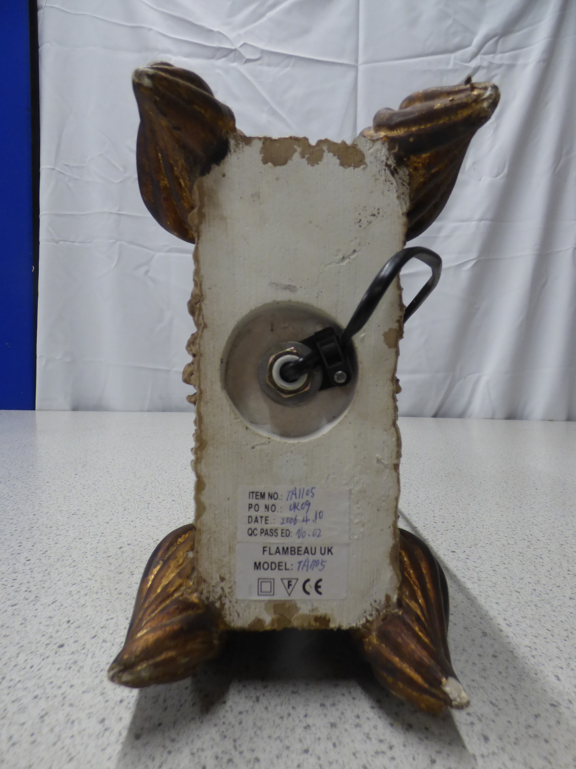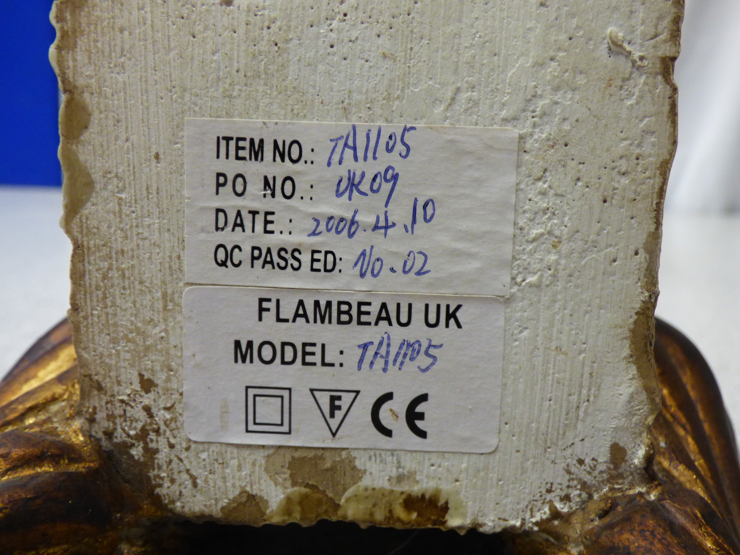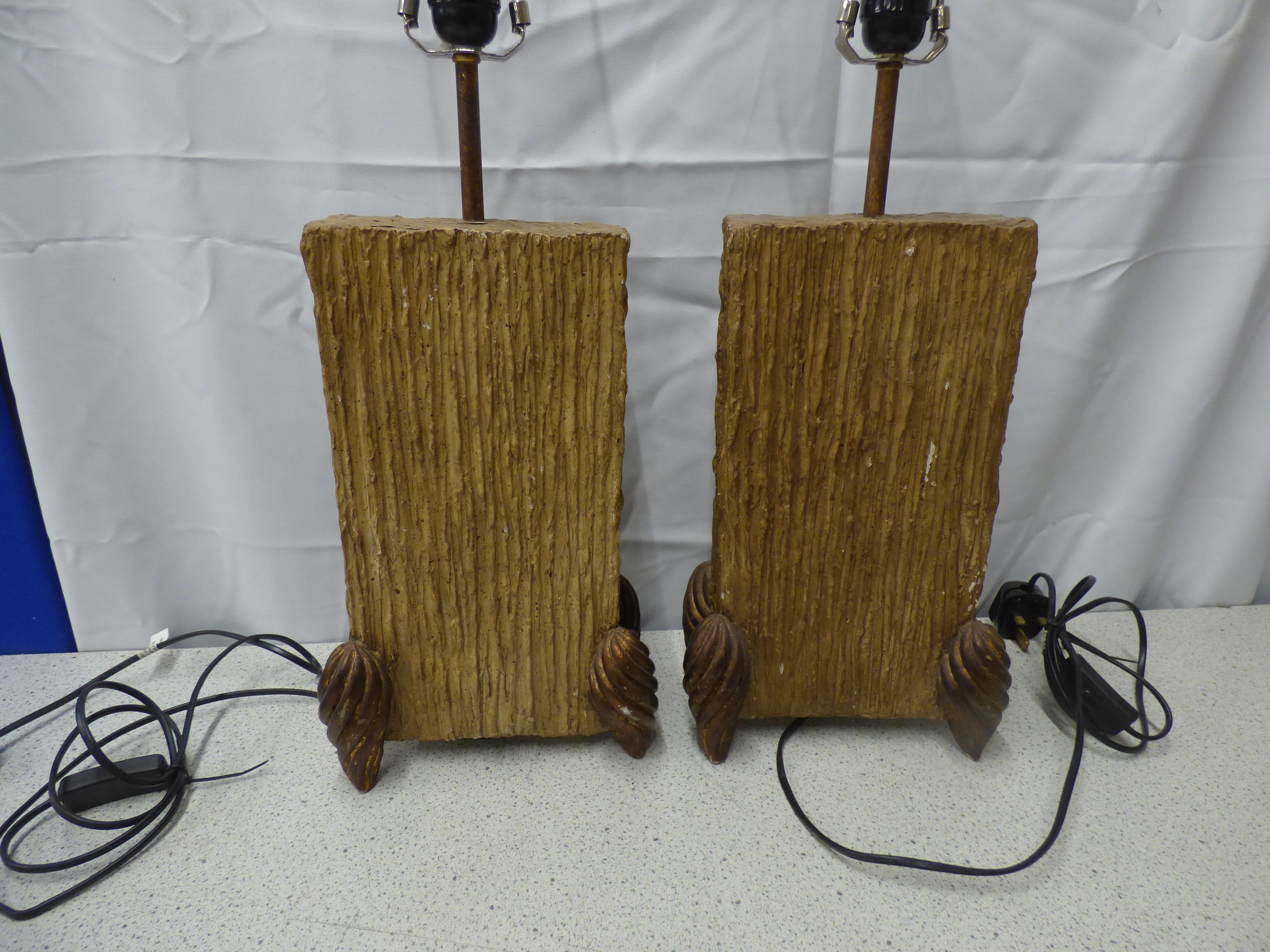 A pair of tan/light brown table lamps with bark affect, model TA1105 by FLAMBEAU UK, dated 2006.4.10, each with a socket labelled ‘Max. 1x60W B22’. 81.5cm to top. Untested