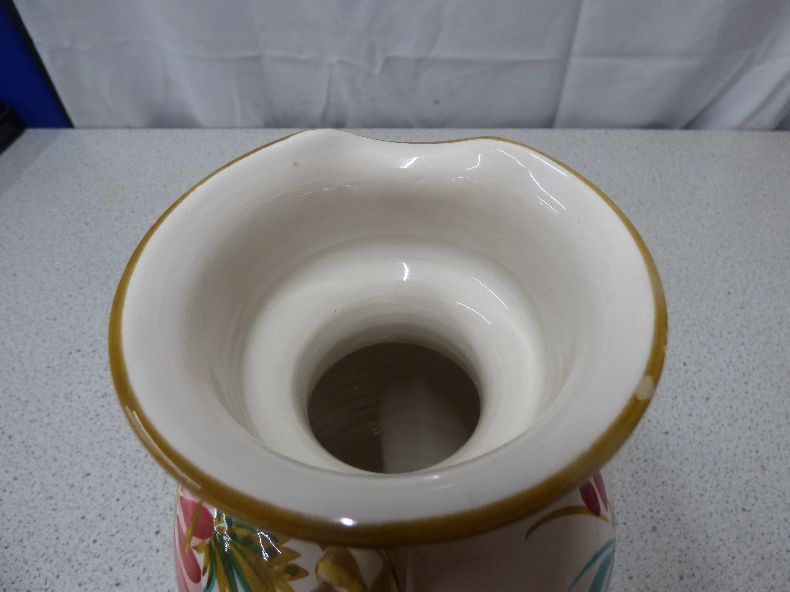 A white ceramic pitcher with a braided brown/gold handle and rim, decorated with multi-coloured floral and leaf patterns in shades of red, yellow, green, teal, and brown, inscribed on the base with ‘Ray’ and ‘3/51’. 27cm tall. Small chips on rim, handle AF.