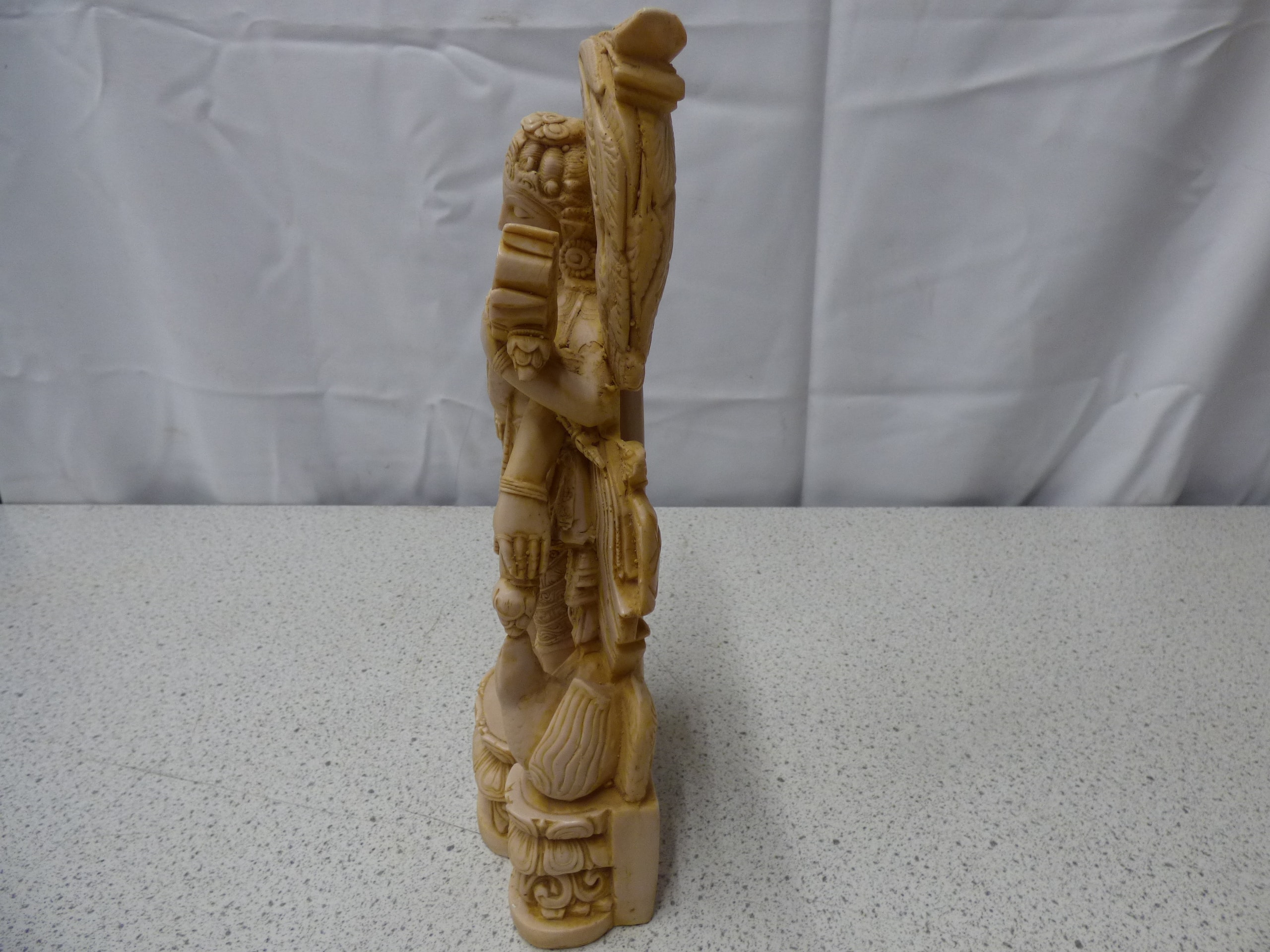A creamy beige or ivory-coloured statue depicting the Hindu goddess Saraswati, goddess of knowledge, music, art and wisdom, playing a veena, with no visible labels or inscriptions. 29cm tall