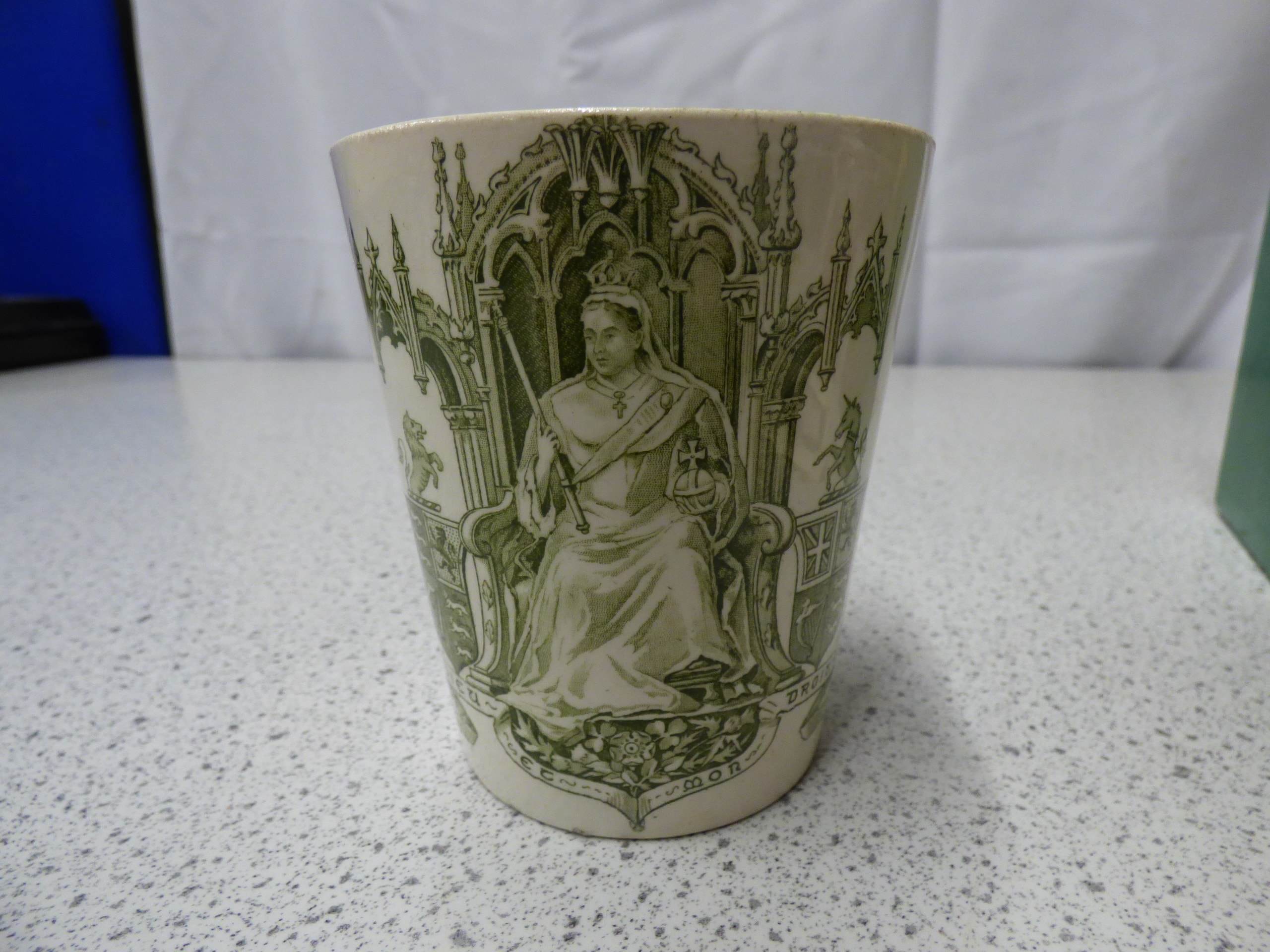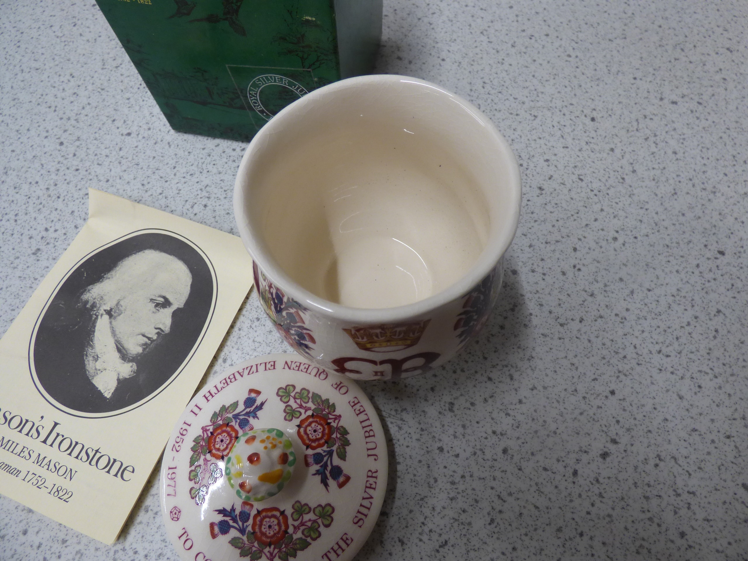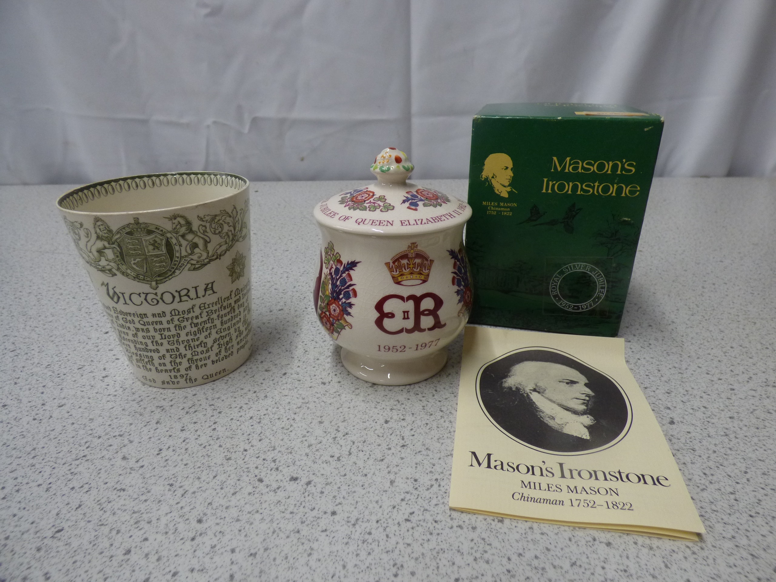2 Rare China Pieces, A cream and green Doulton Burslem “Victoria R.I. Diamond Jubilee” beaker and a multi-coloured Mason’s Ironstone “Royal Silver Jubilee Queen Elizabeth II 1952-1977” lidded pot, complete with its branded box and pamphlet.