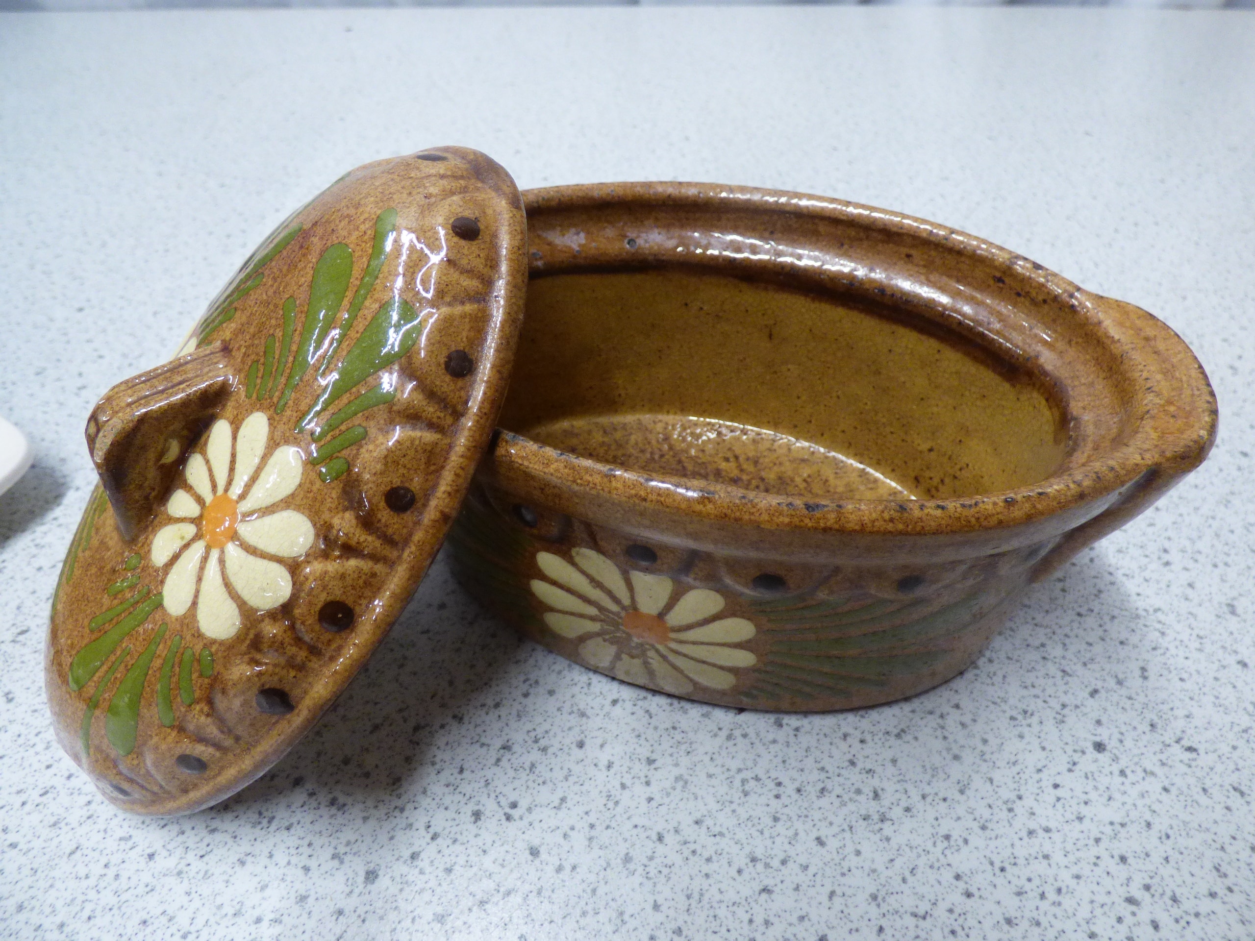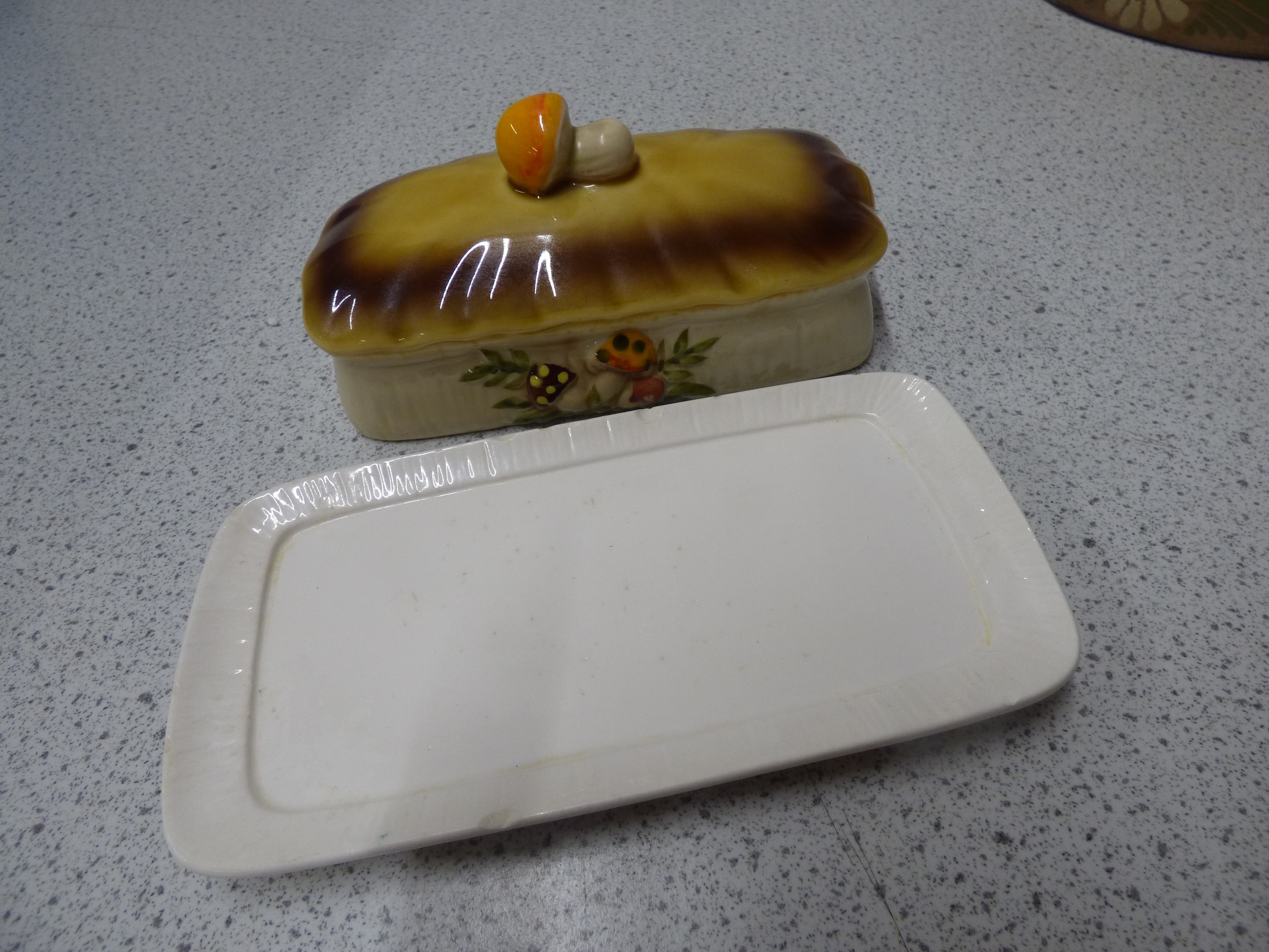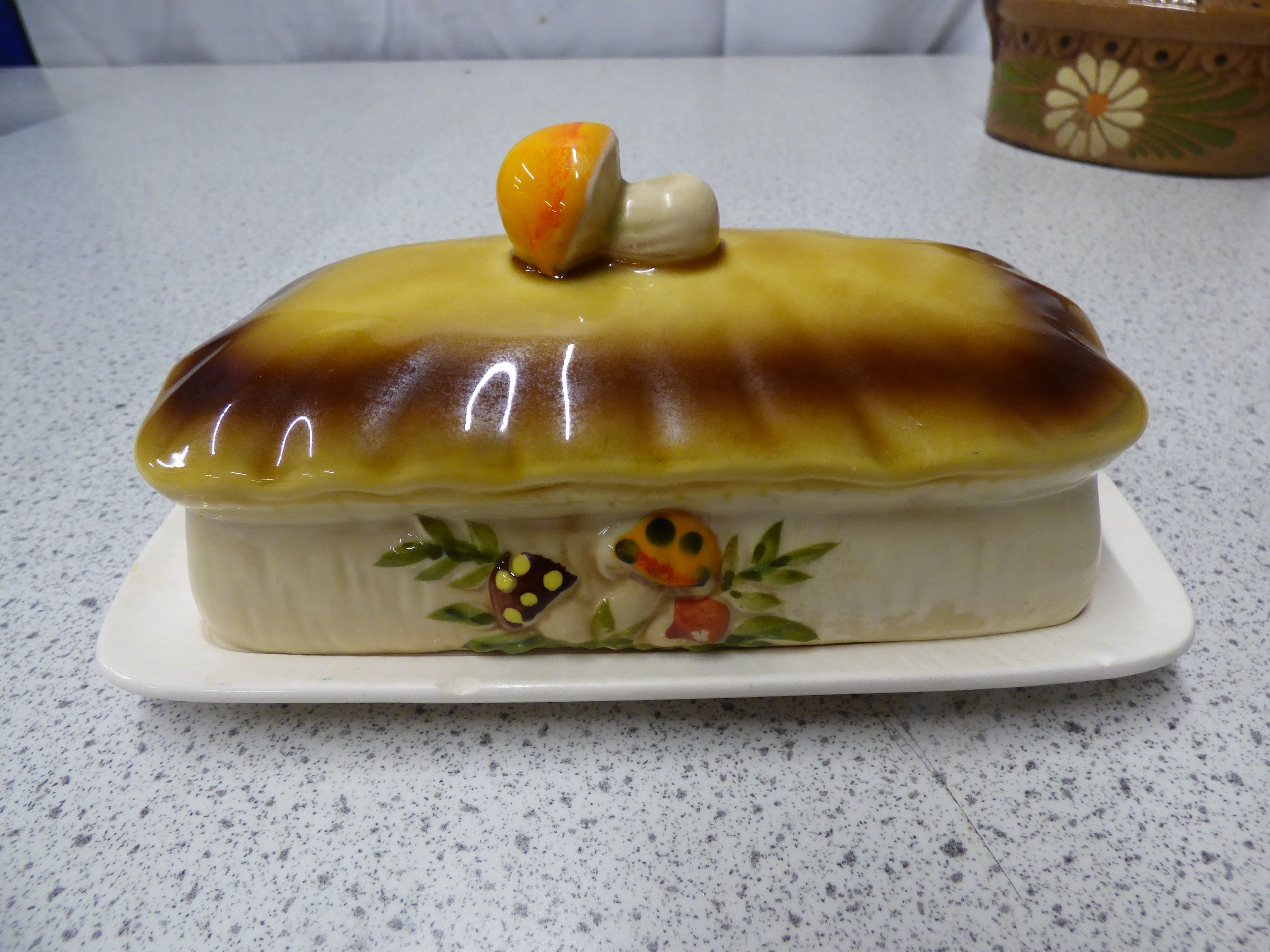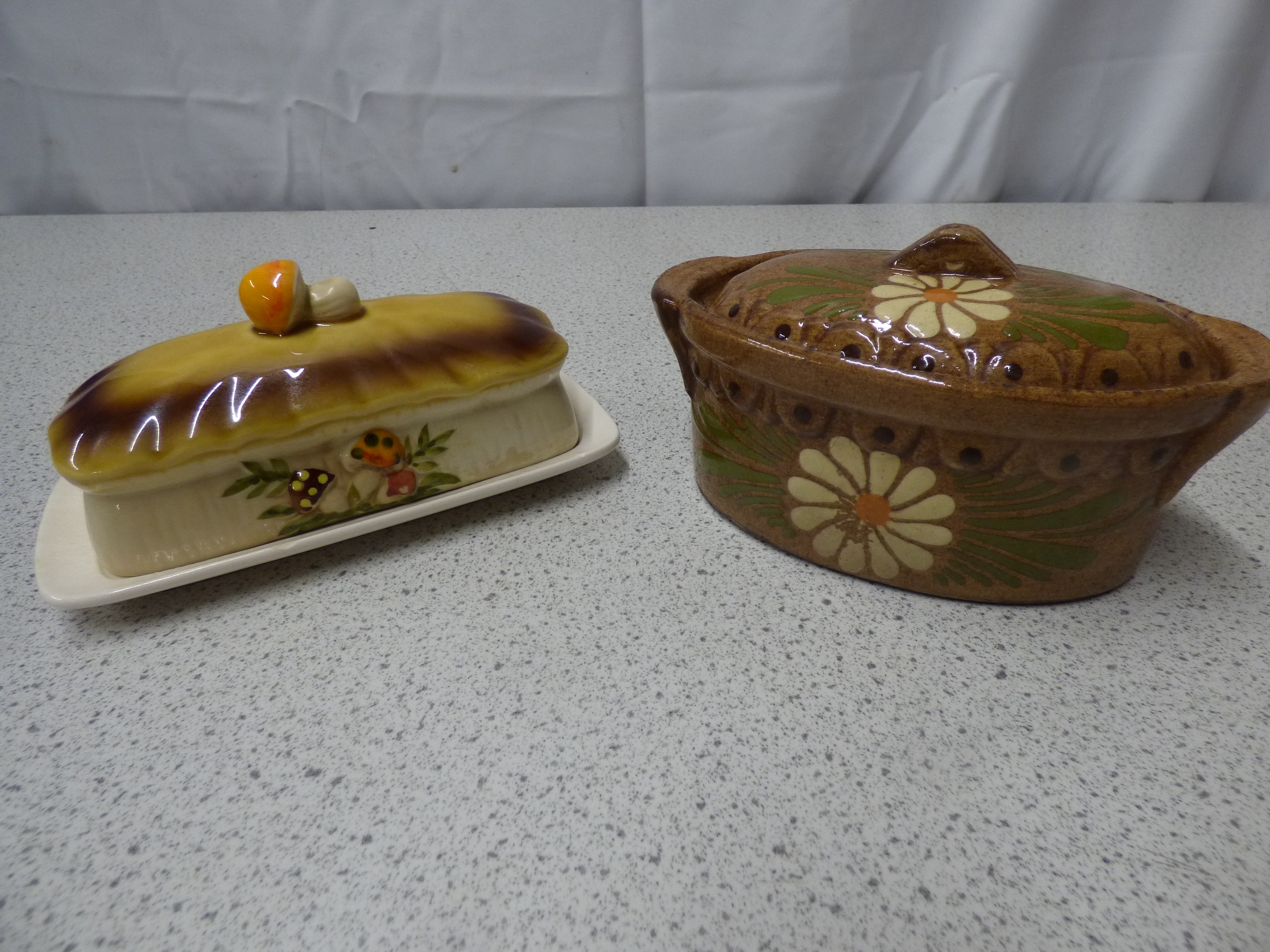 A cream-coloured 70s Sears and Roebuck Merry Mushroom ceramic butter dish with a yellow-brown mushroom-decorated lid and tray, which has a raised “M” mark on its underside, and a brown ceramic hand painted covered casserole dish decorated with white and yellow daisies and green leaves.