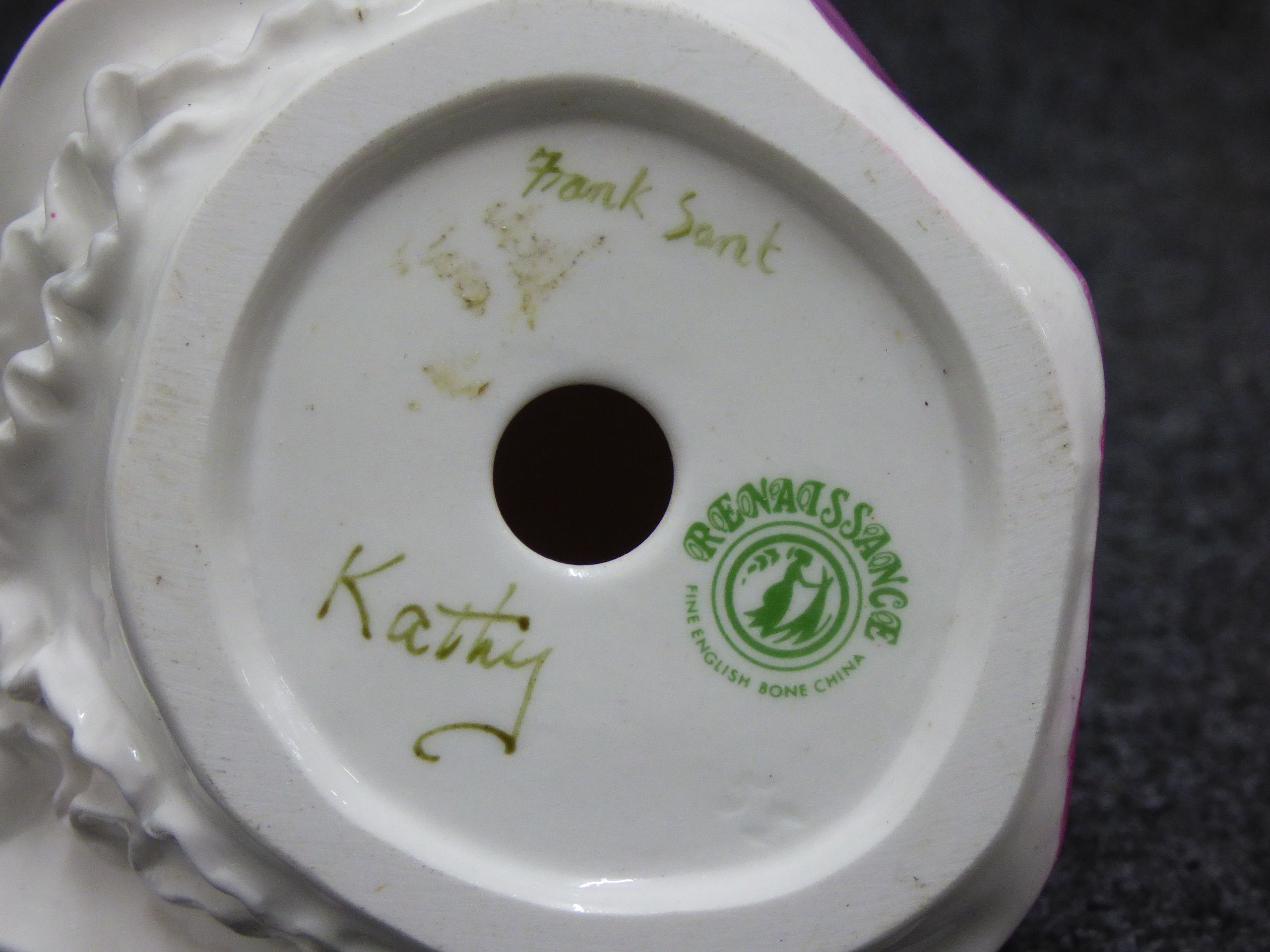 A fine English bone china figurine of a woman named Kathy wearing a purple dress and yellow shawl, with a base marked Renaissance and inscribed Frank Sant. 17cm tall