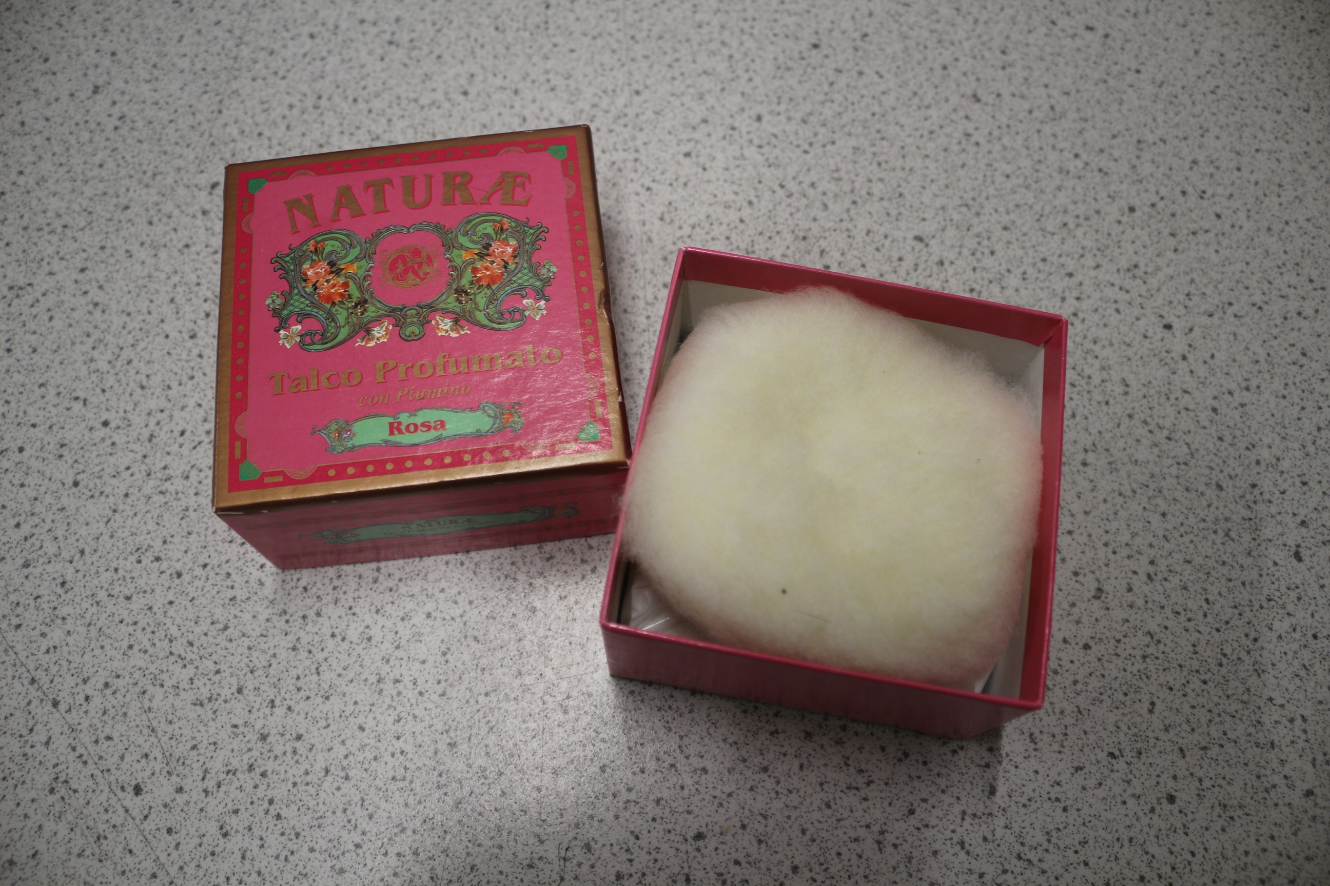 This lot includes small personal care items and accessories comprising one pink ‘NATURAE Talco Profumato Rosa’ talcum powder box, seven clear glass perfume/aftershave bottles (two with liquid including ‘Cussons Imperial Leather’ and one empty ‘Noel’), eight small soap bars or boxes (brands include ‘Lux’, ‘Dove’, ‘Camay’, ‘Noel Savon Parfumé’, ‘Tief’, and ‘Speick Seife’), a silver-toned floral compact, a white ‘SCRUBB’S AMMONIA’ container, and nine assorted hair clips/barrettes in various colours and designs.