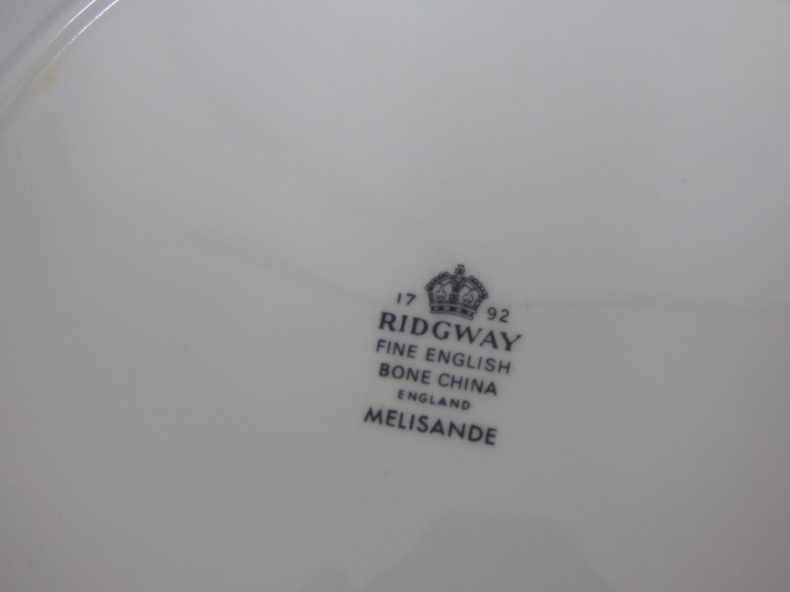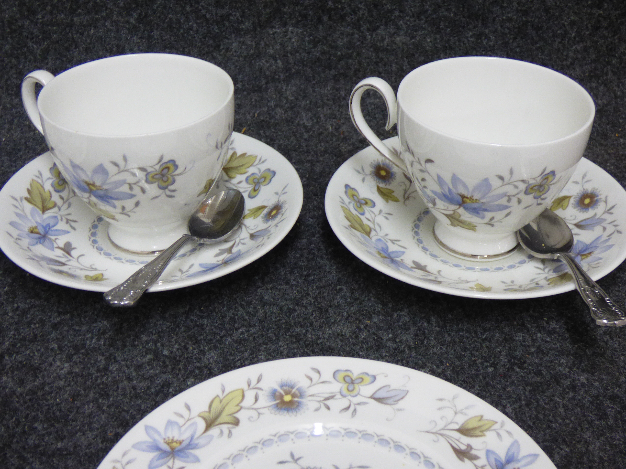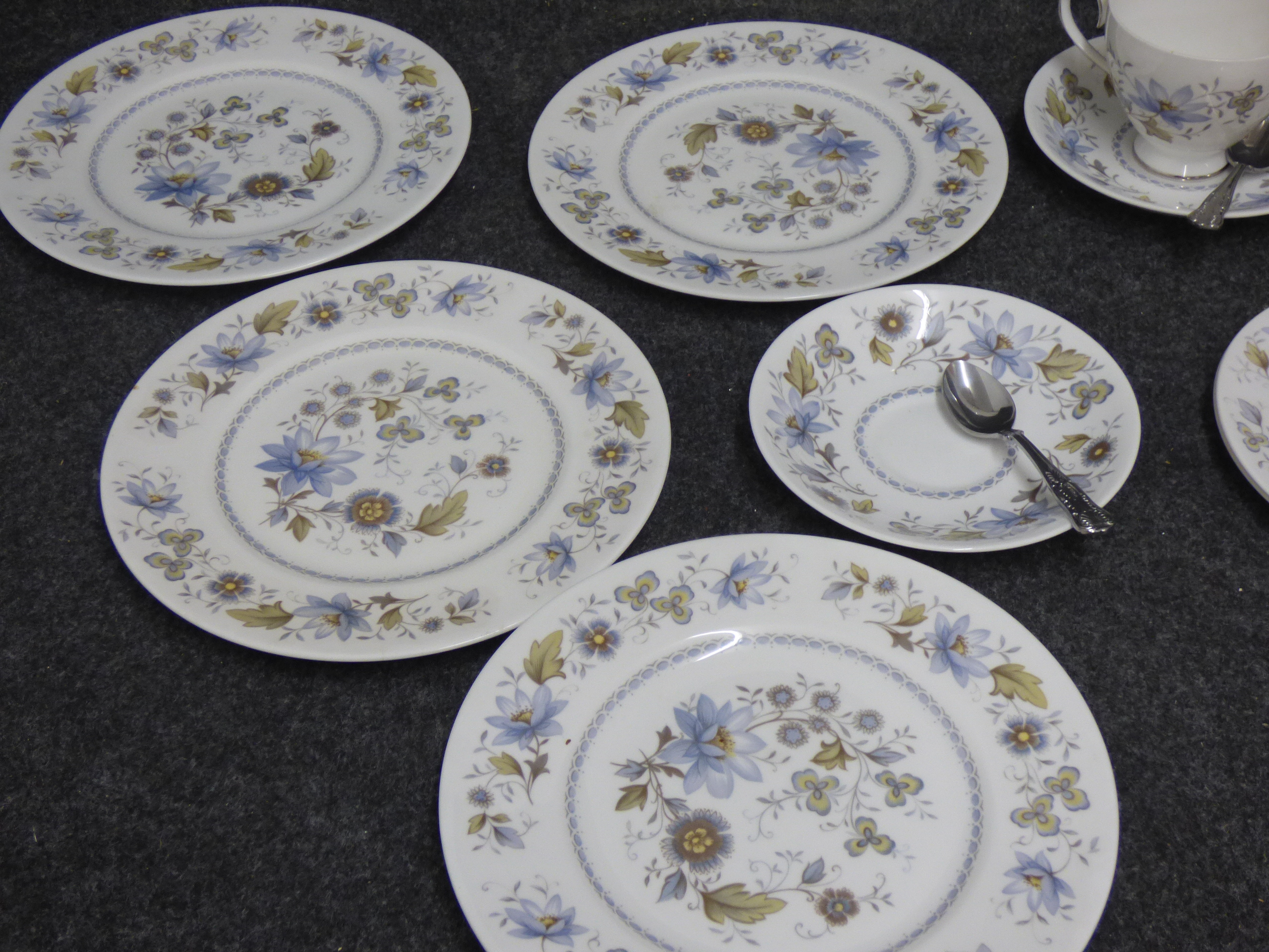 A collection of white bone china tableware featuring the Melisande blue and yellow floral pattern, including several plates, multiple saucers, cups, and stainless steel spoons.