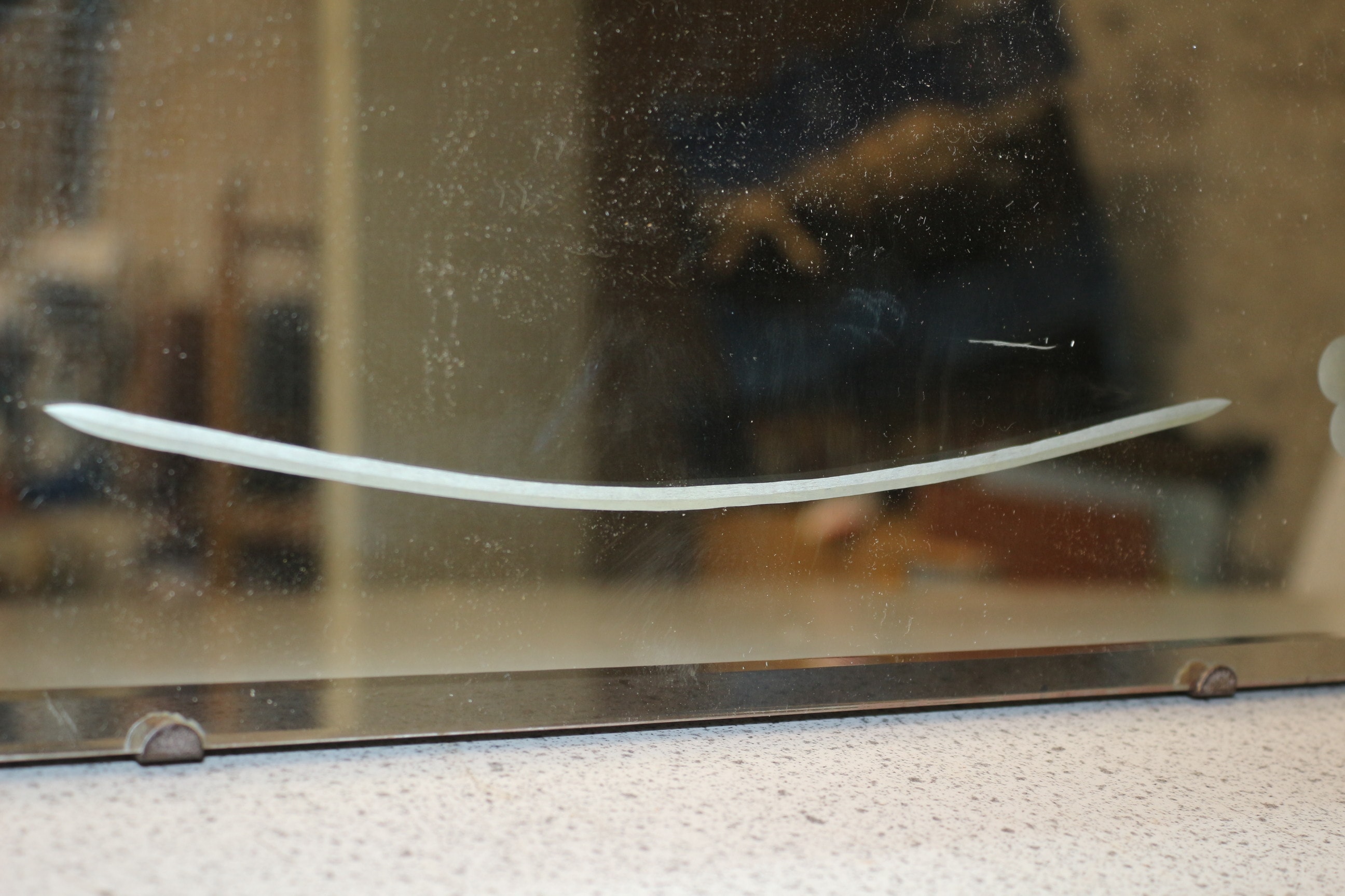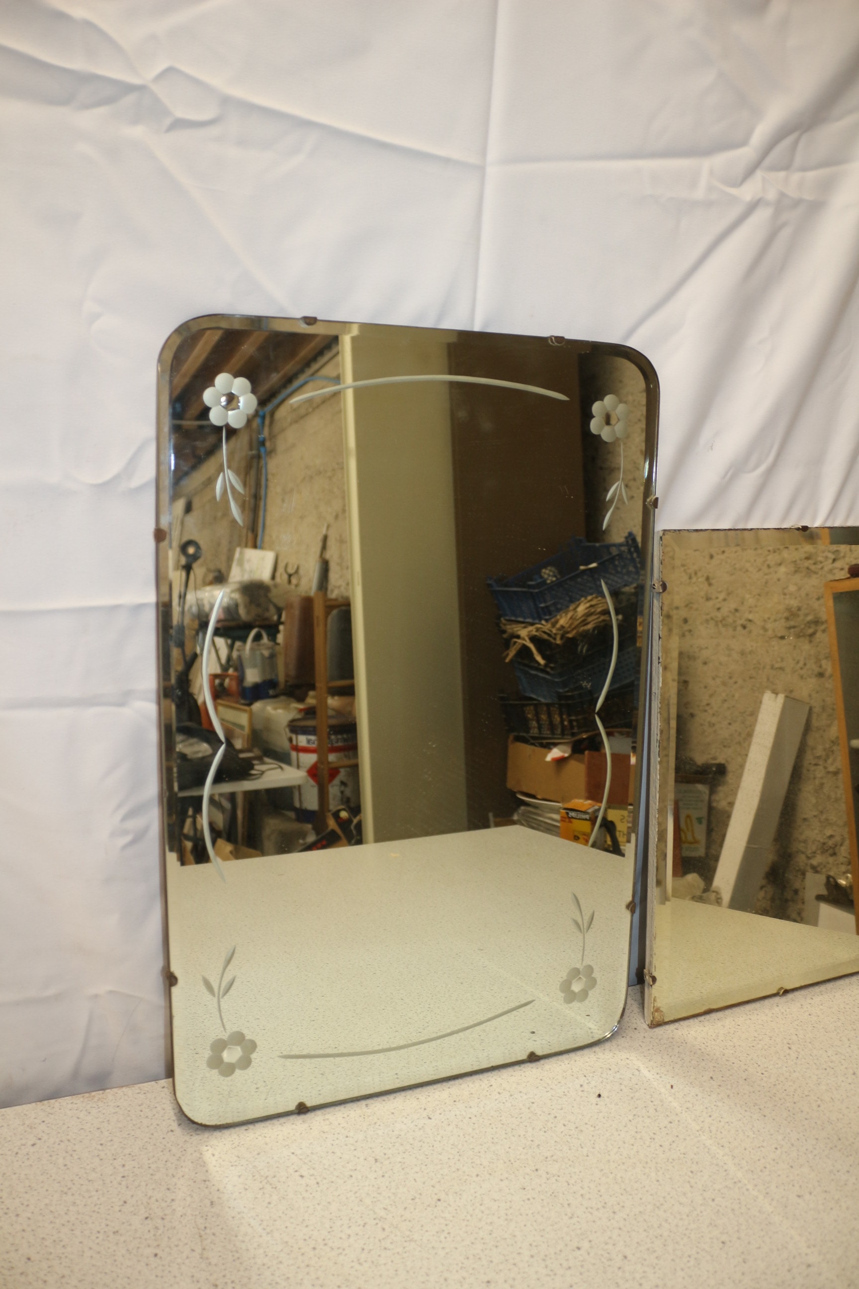 Two rectangular silver/clear mirrors, one etched with white floral and scroll designs, the other plain. Largest 61x41cm