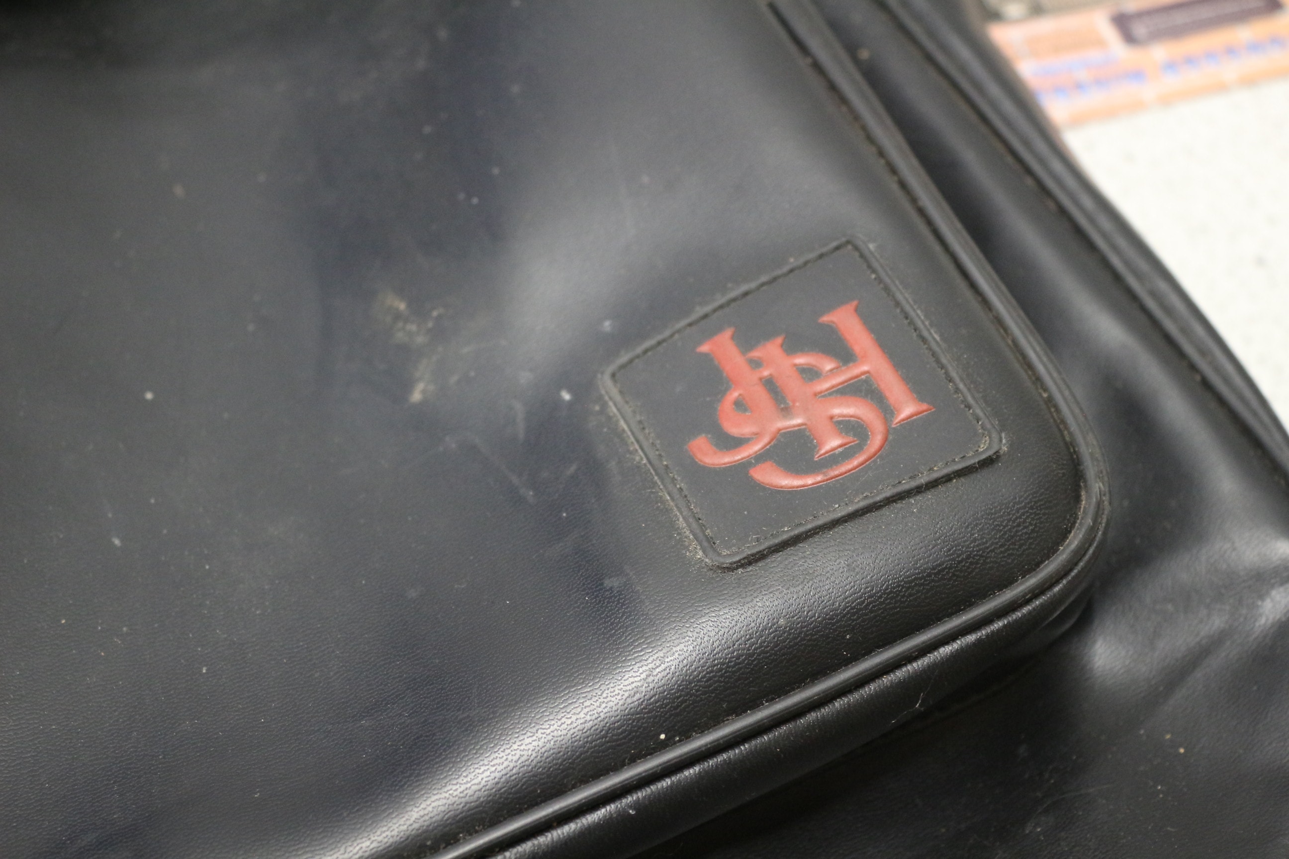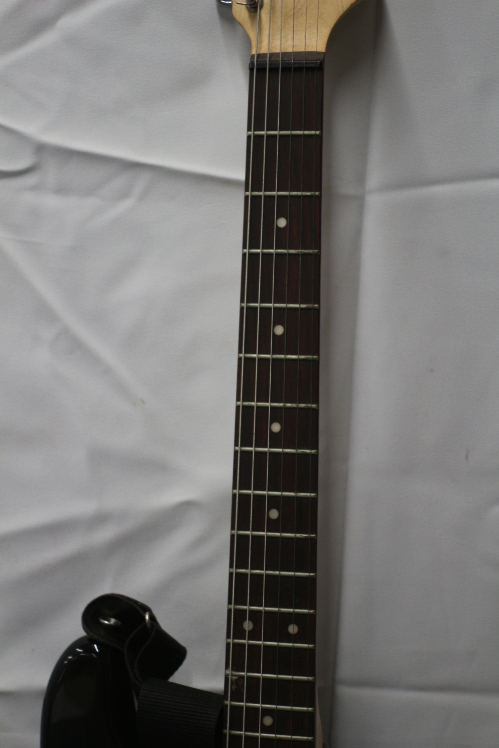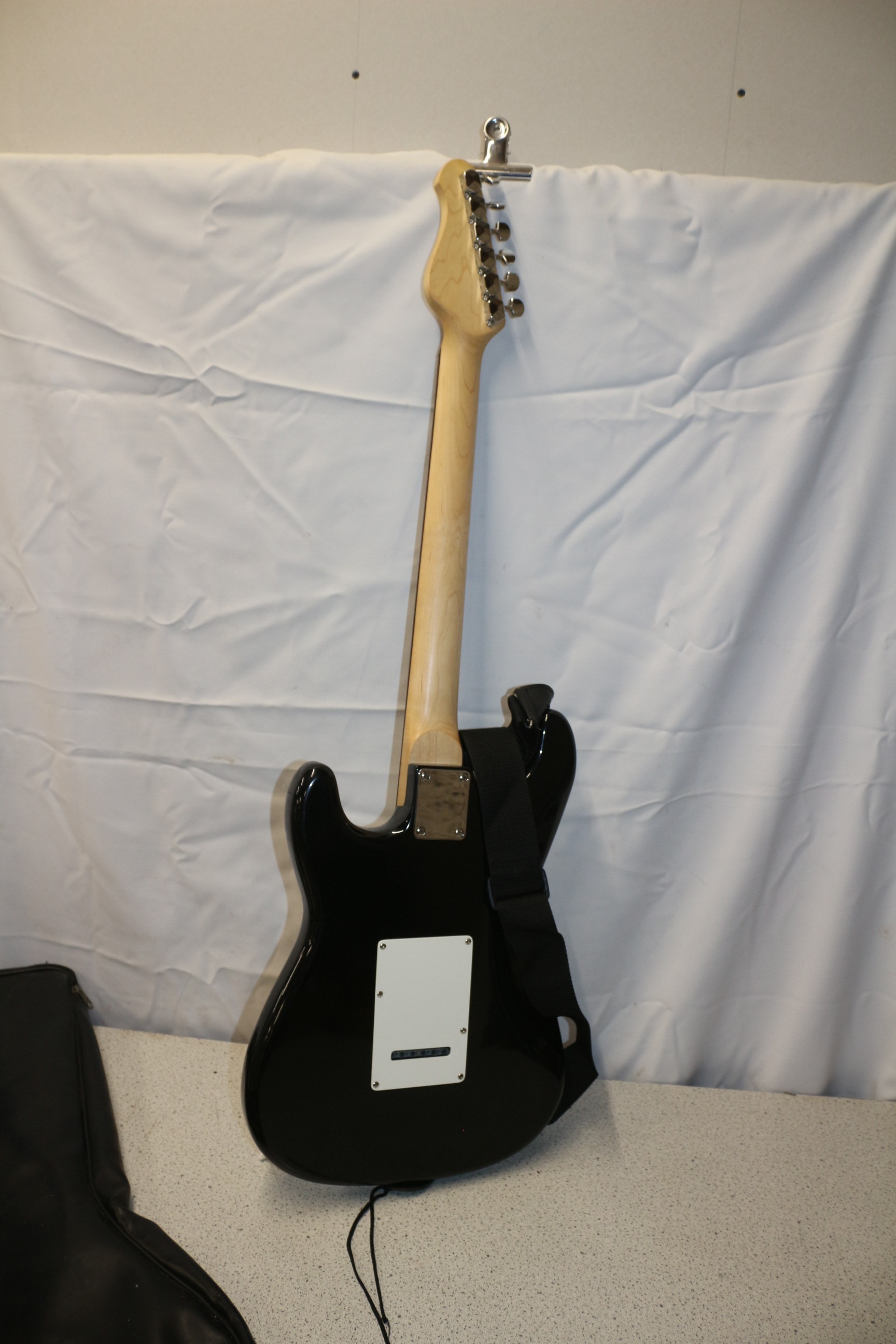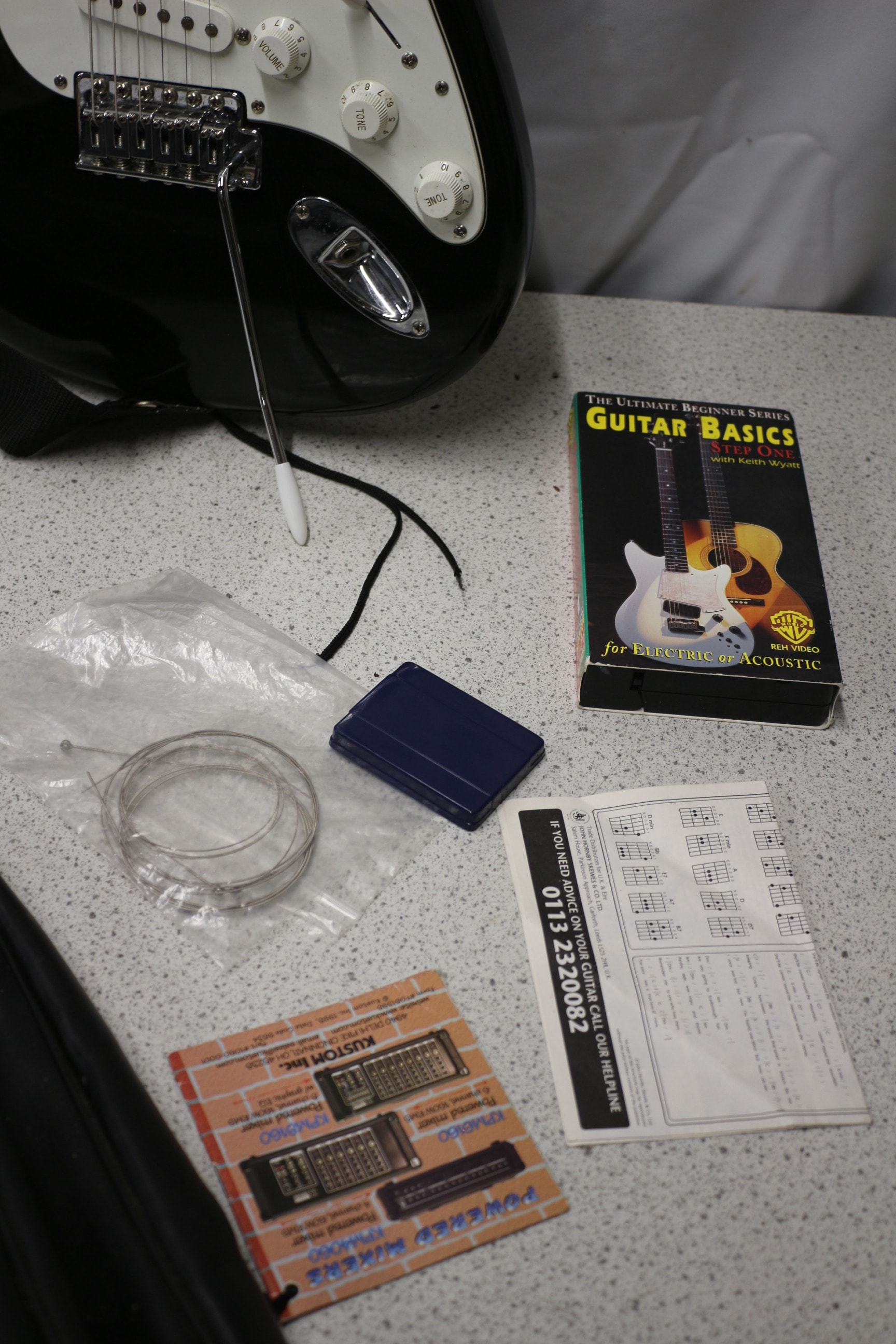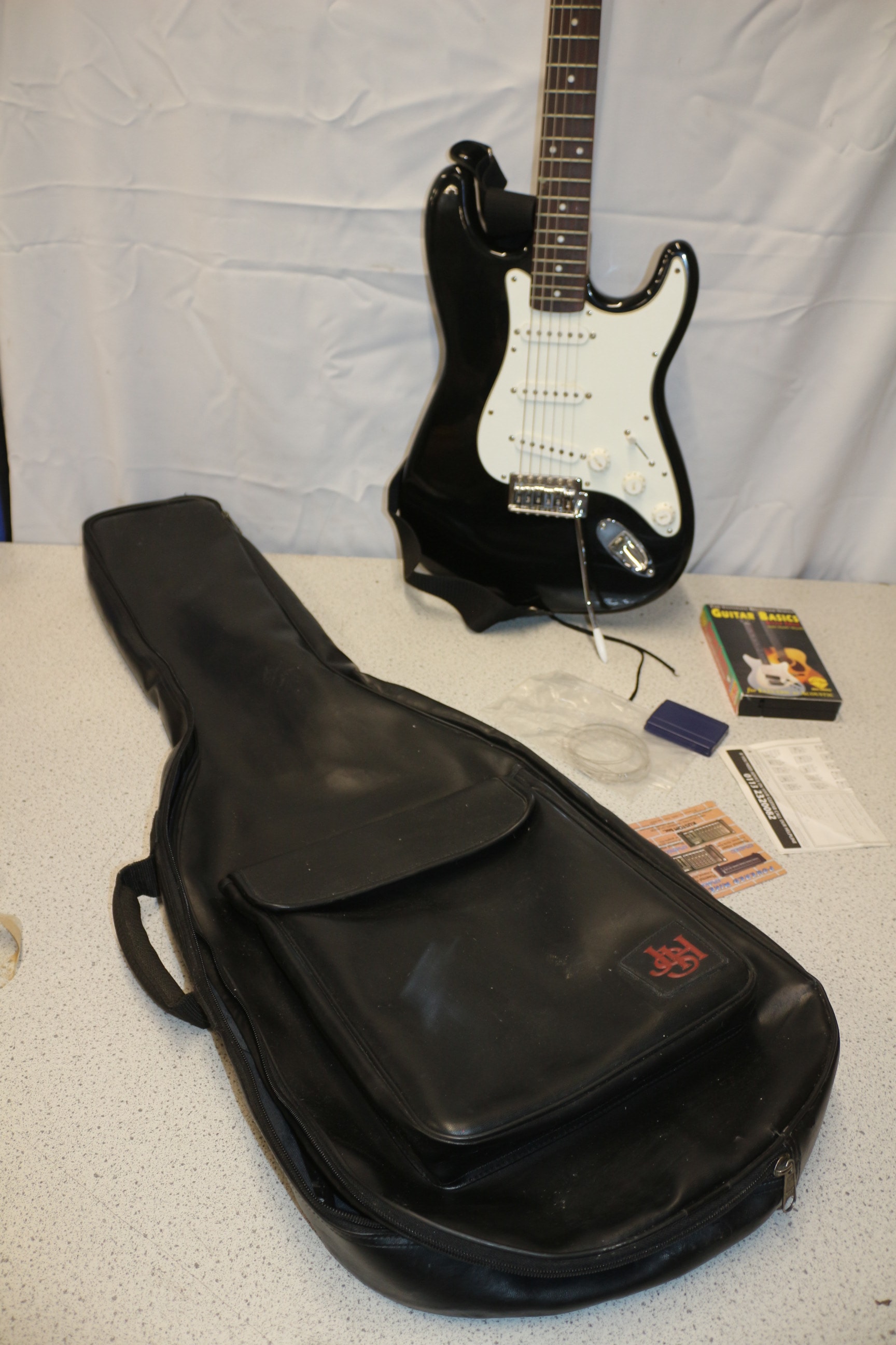 A black and white “Encore” electric guitar with a natural wood neck (featuring “VOLUME” and “TONE” knob labels), a black soft guitar case with a red “JHS” logo, a “Guitar Basics” book, new guitar strings, and various other small accessories.