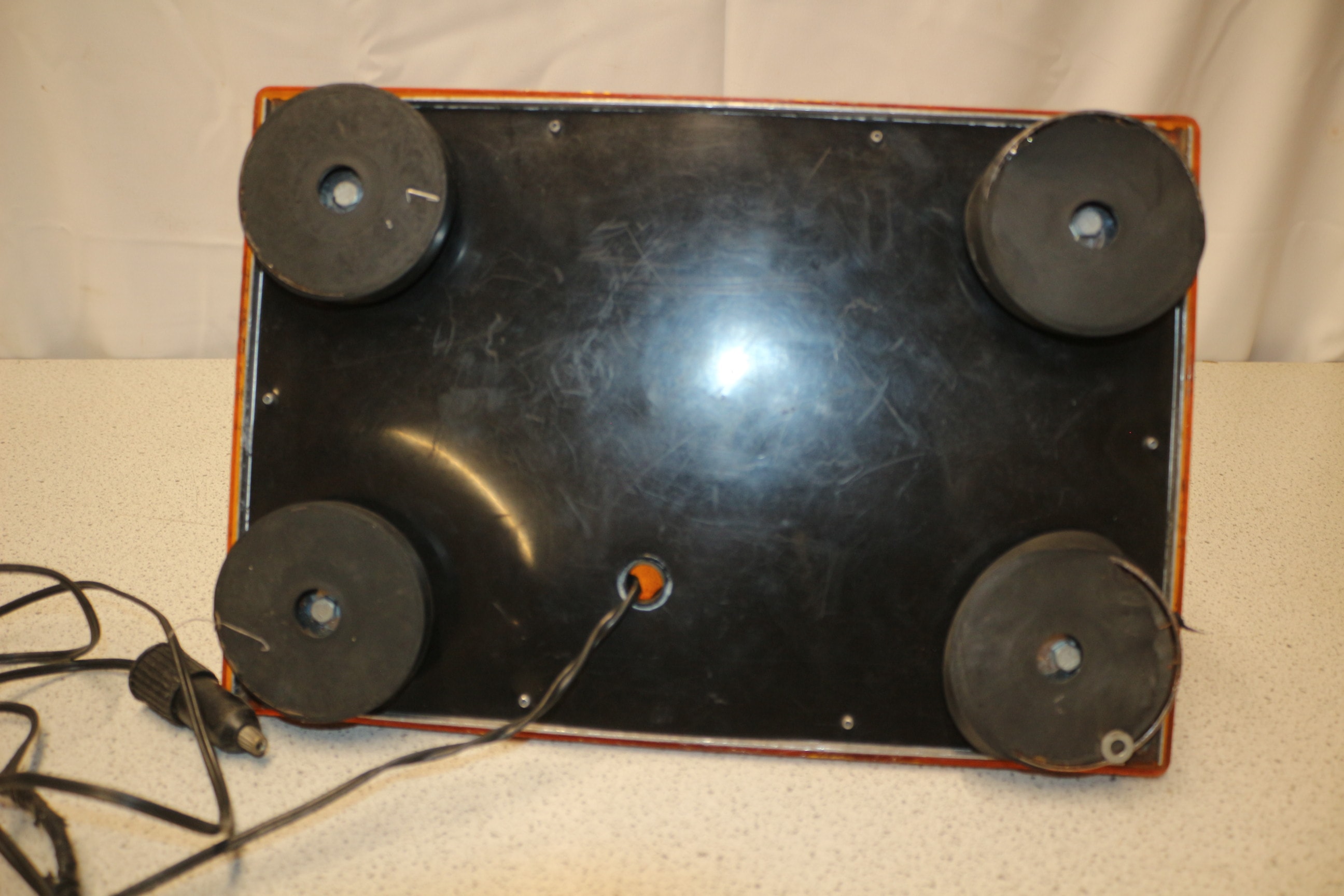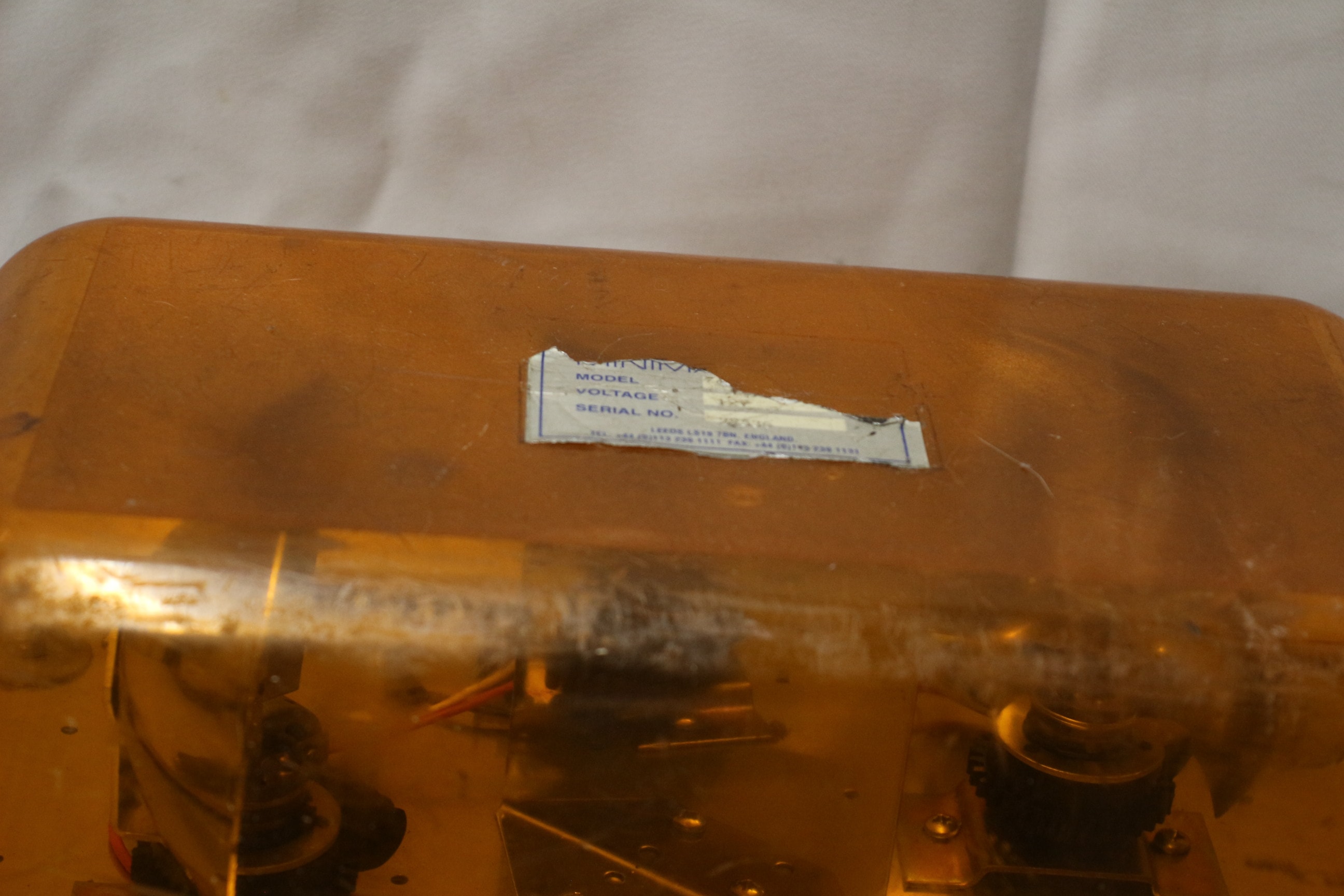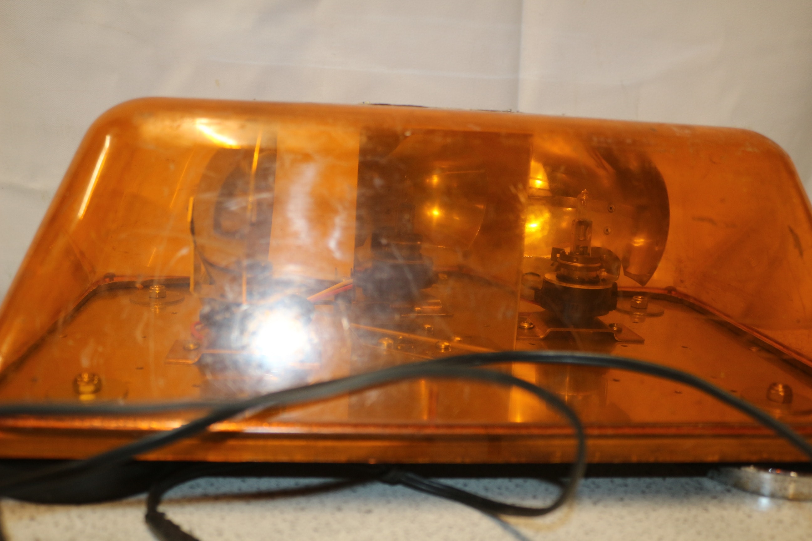 An amber code 3 PSE 158X Force 4 MINIRAY low profile emergency Beacon light bar with a black base and 12VDC power cord. Rare amber dome. Untested