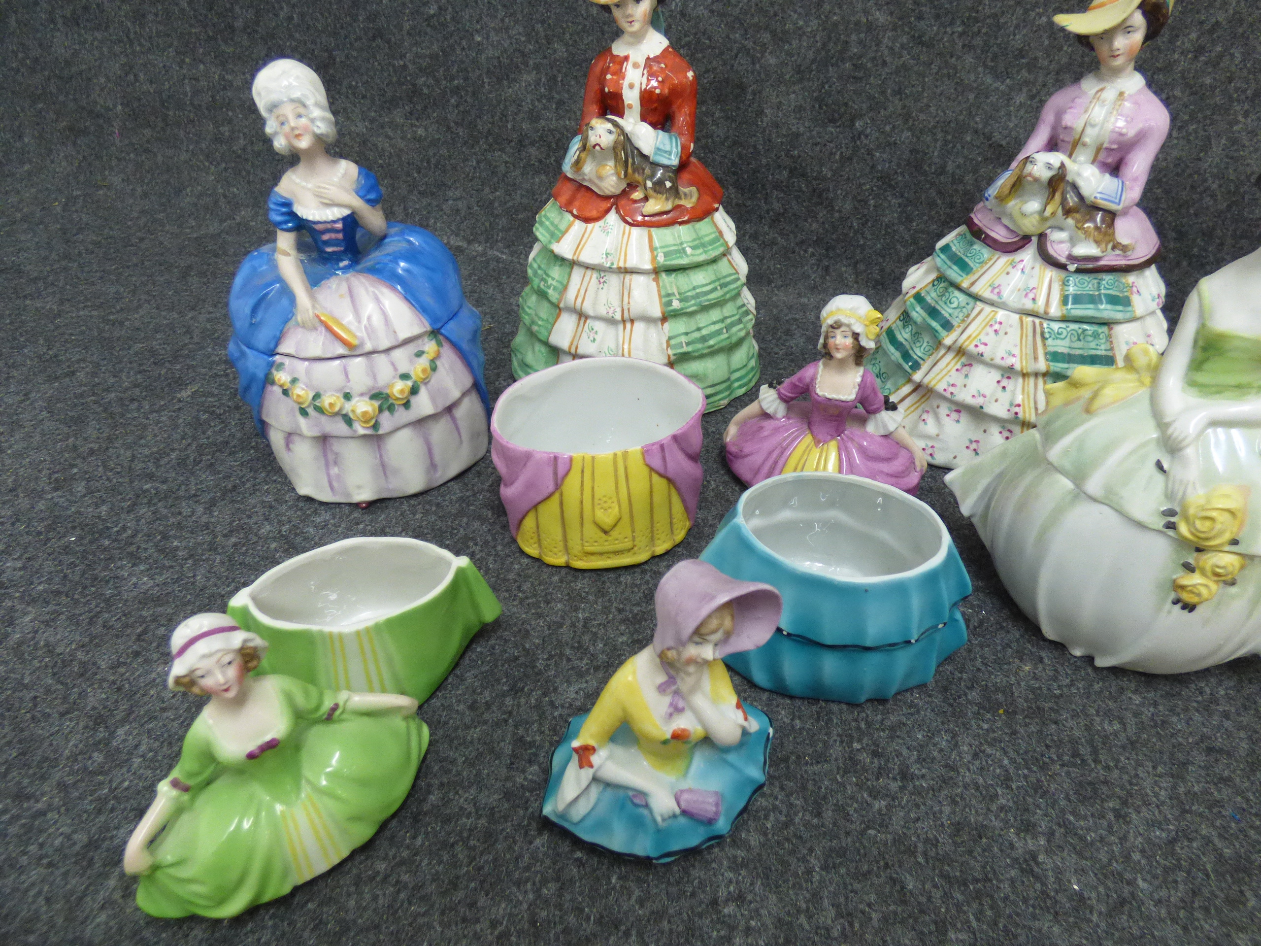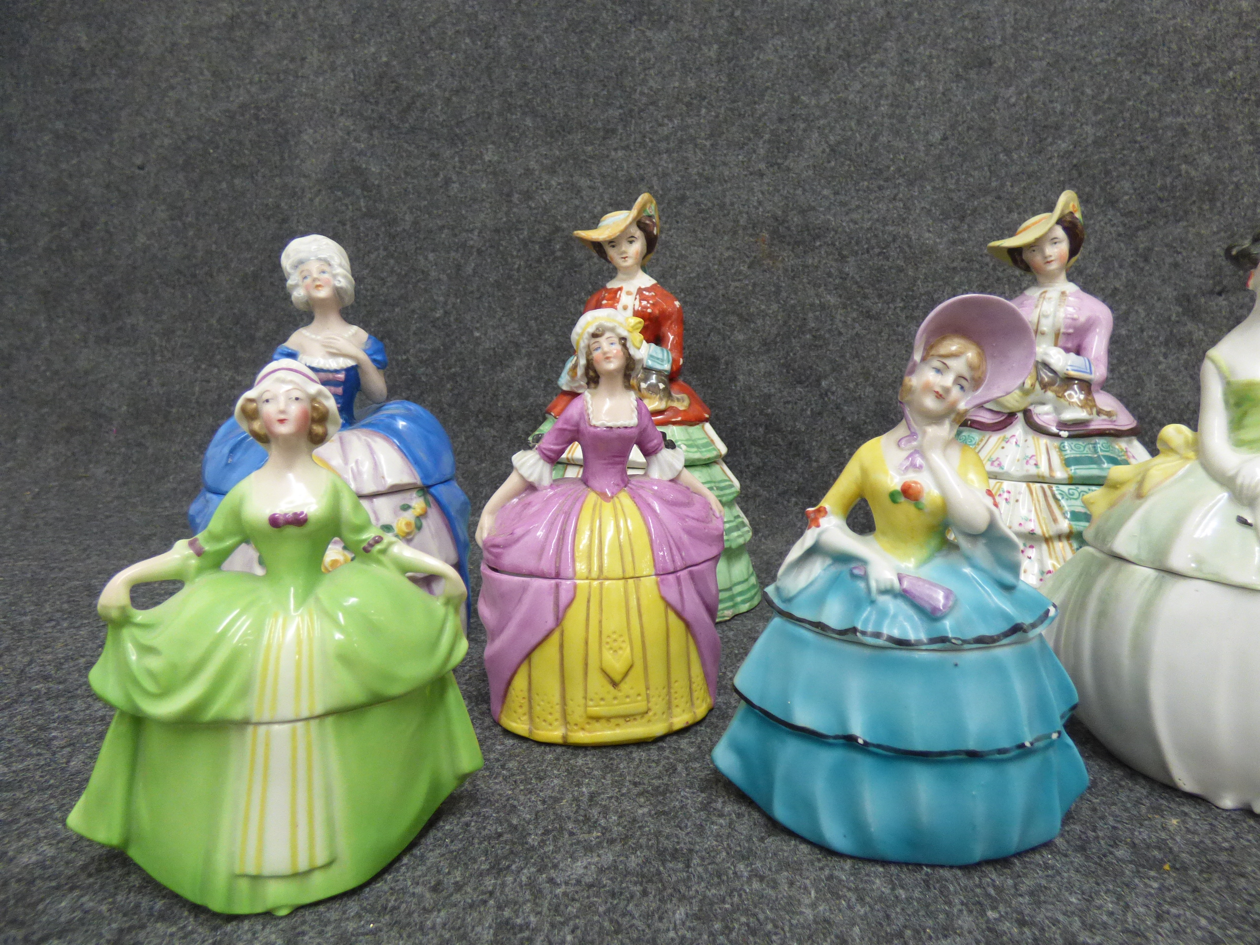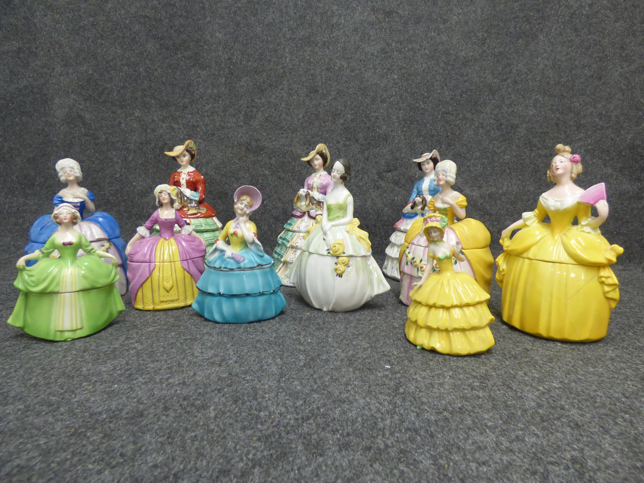 A collection of multi-coloured ceramic trinket boxes and figurines depicting women in historical dress, featuring various hand-painted designs and glazed finishes. Various sizes, tallest 22cm
