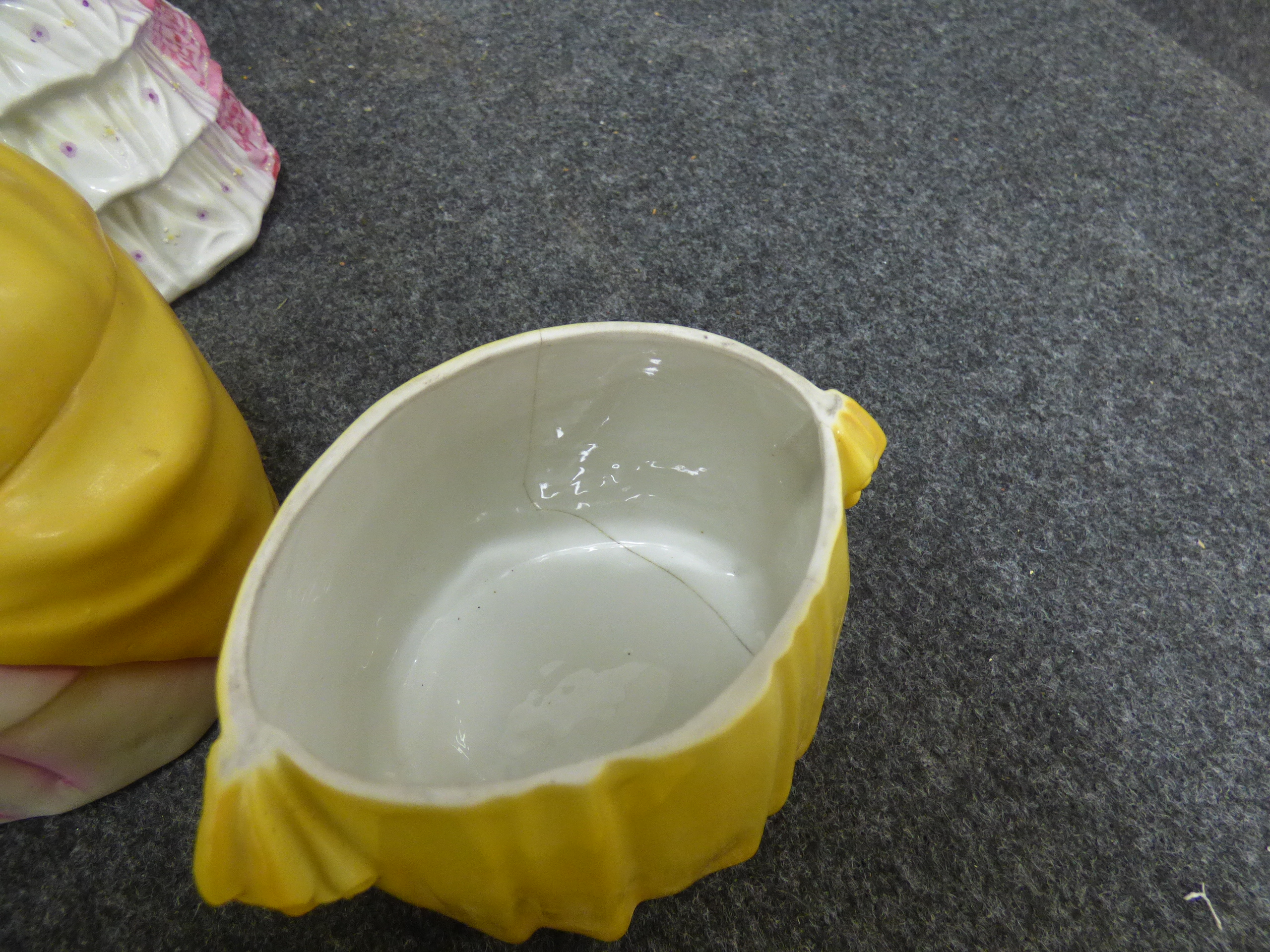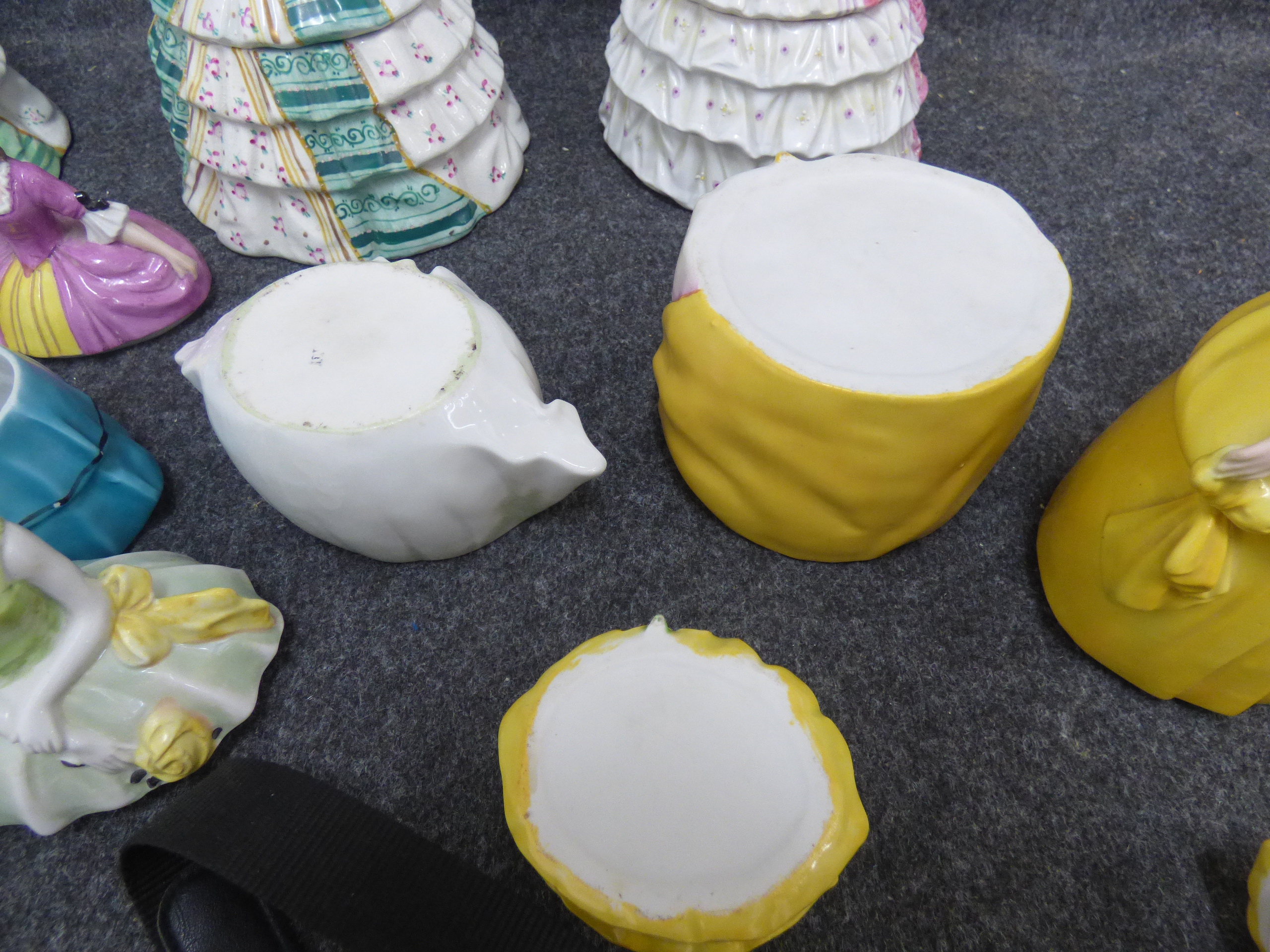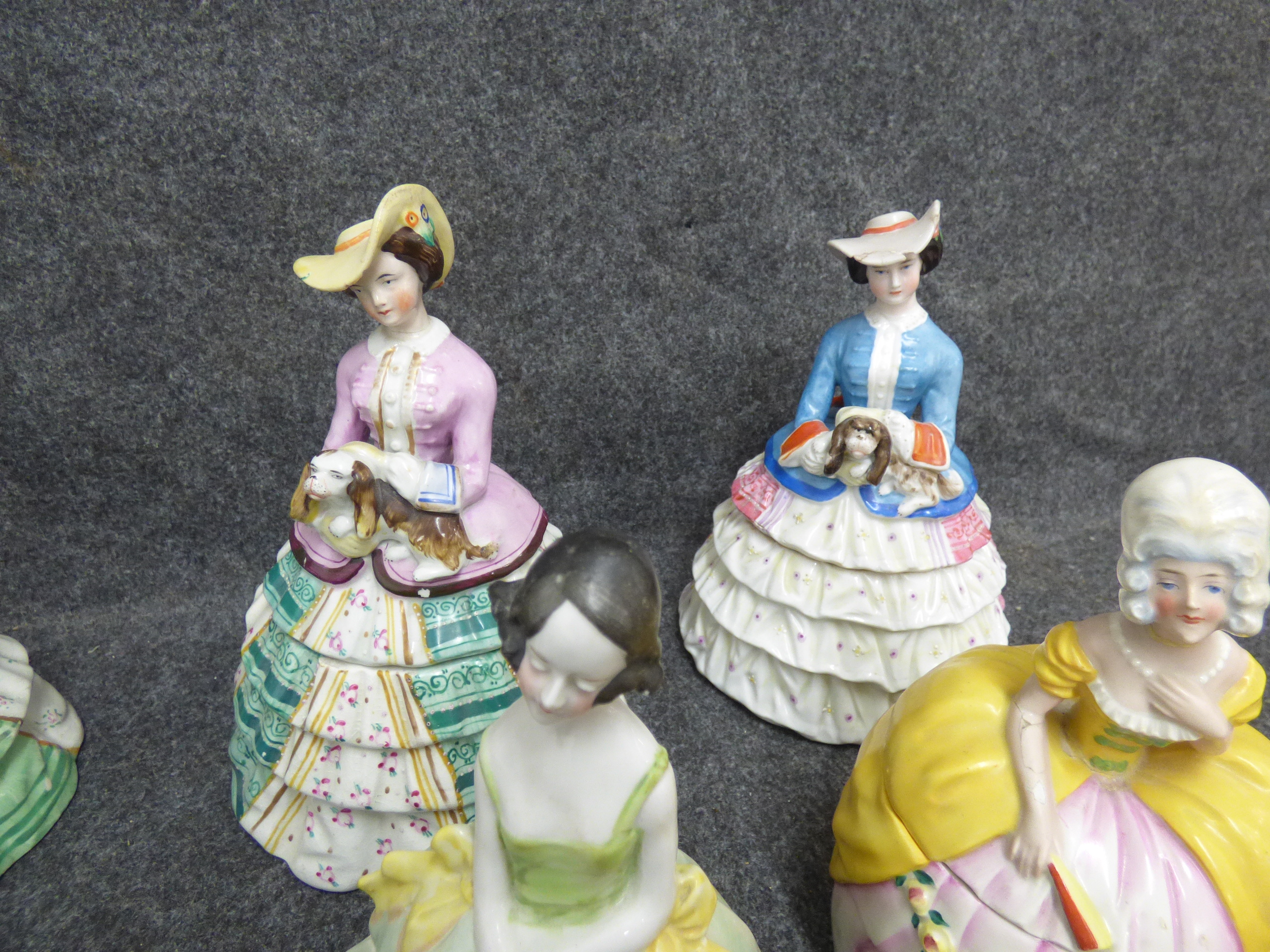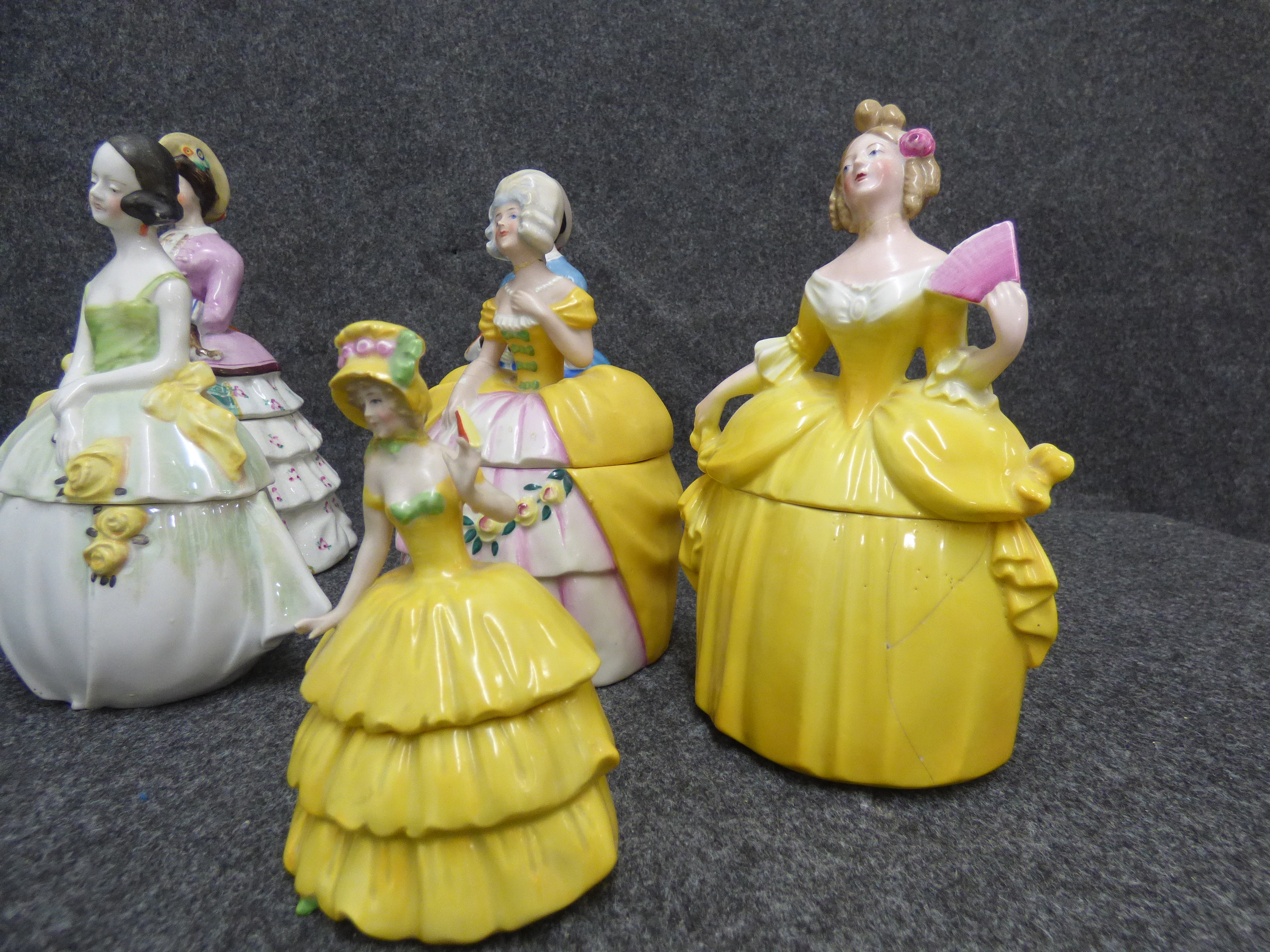 A collection of multi-coloured ceramic trinket boxes and figurines depicting women in historical dress, featuring various hand-painted designs and glazed finishes. Various sizes, tallest 22cm