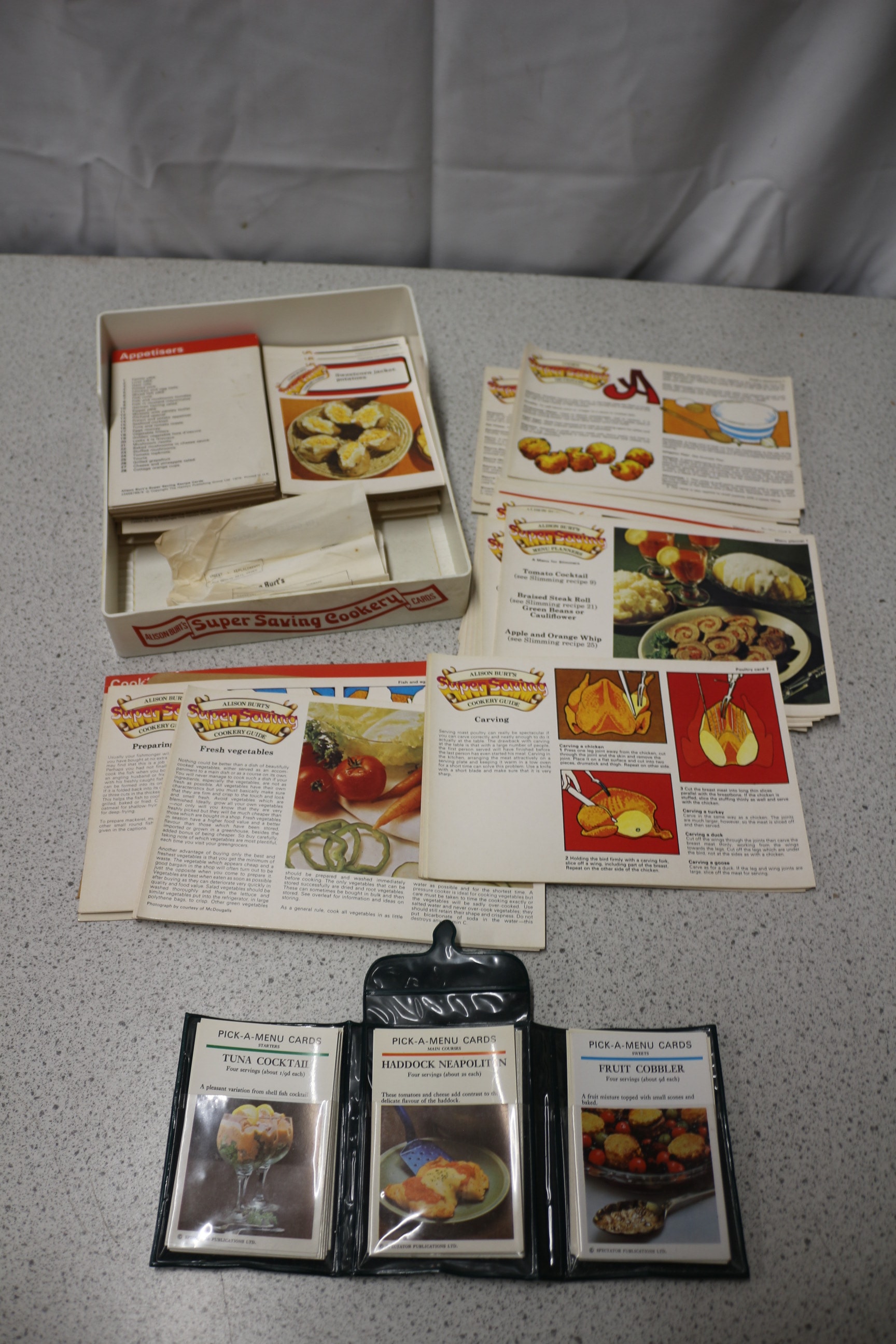 A collection of “Alison Burt’s Super Saving Cookery” recipe cards and guides, featuring white, red, and yellow cards with food photography, stored in a white box, alongside a black plastic holder containing “PICK-A-MENU CARDS” with titles like “TUNA COCKTAIL”, many items marked “© 1978 Printed in G.B.” and “SPECTATOR PUBLICATIONS LTD.”.