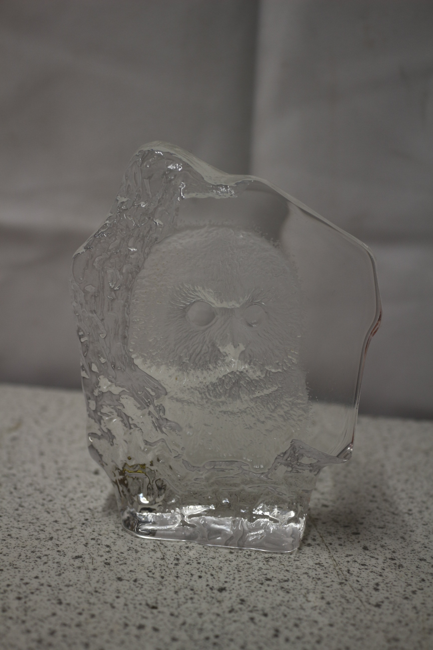 A single clear full lead crystal sculpture of an owl, featuring a brown and gold label on the base with ‘MATS JONASSON SWEDEN’. 13cm tall