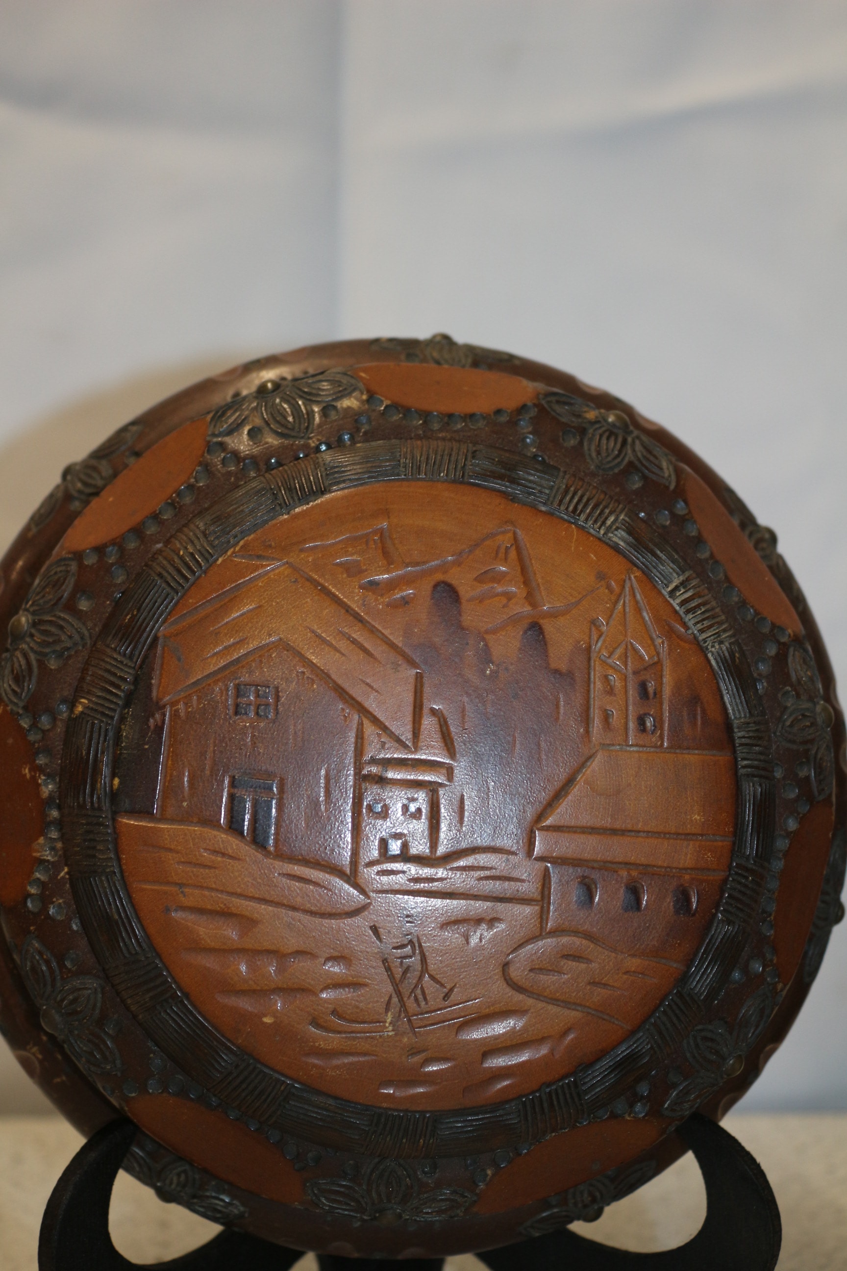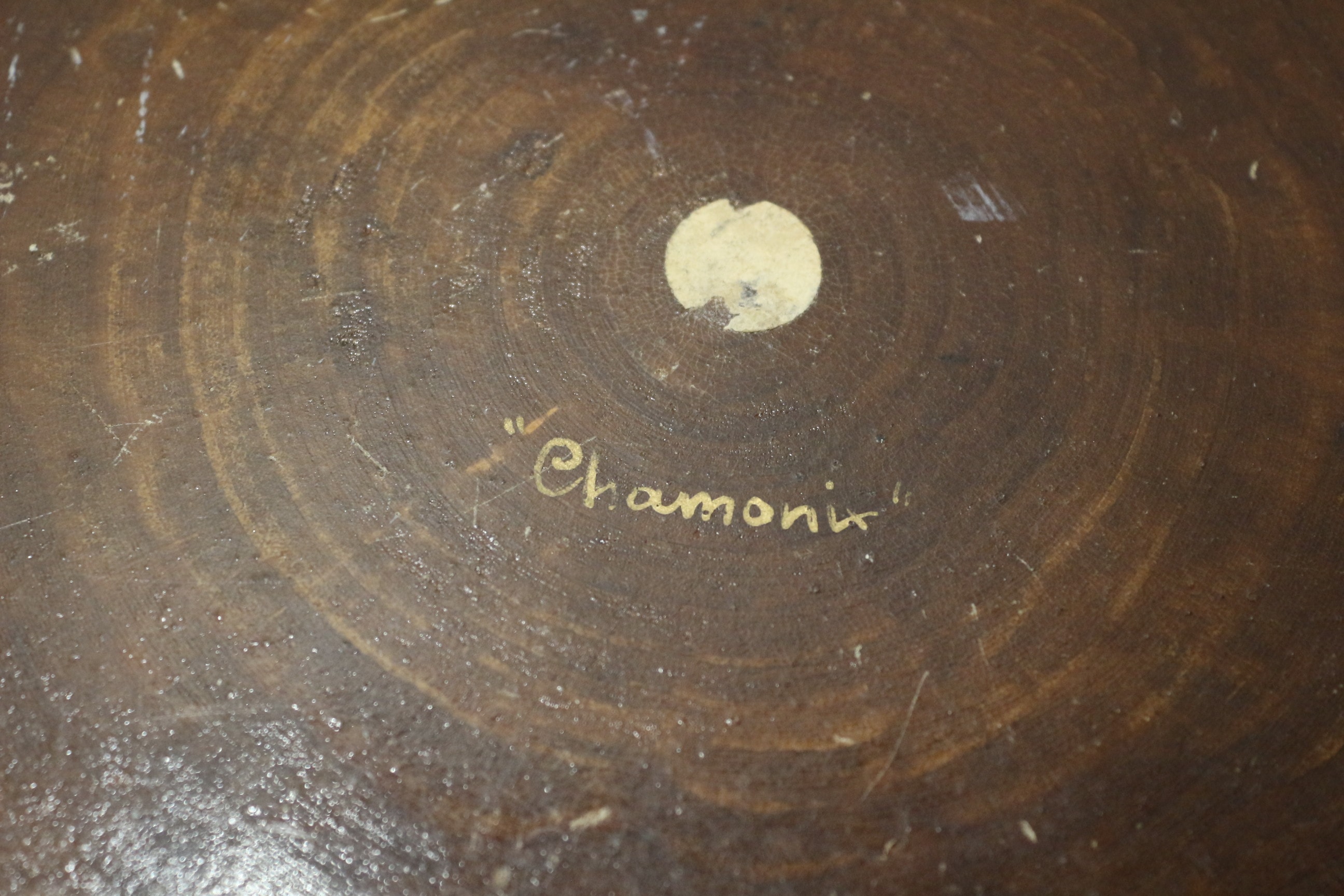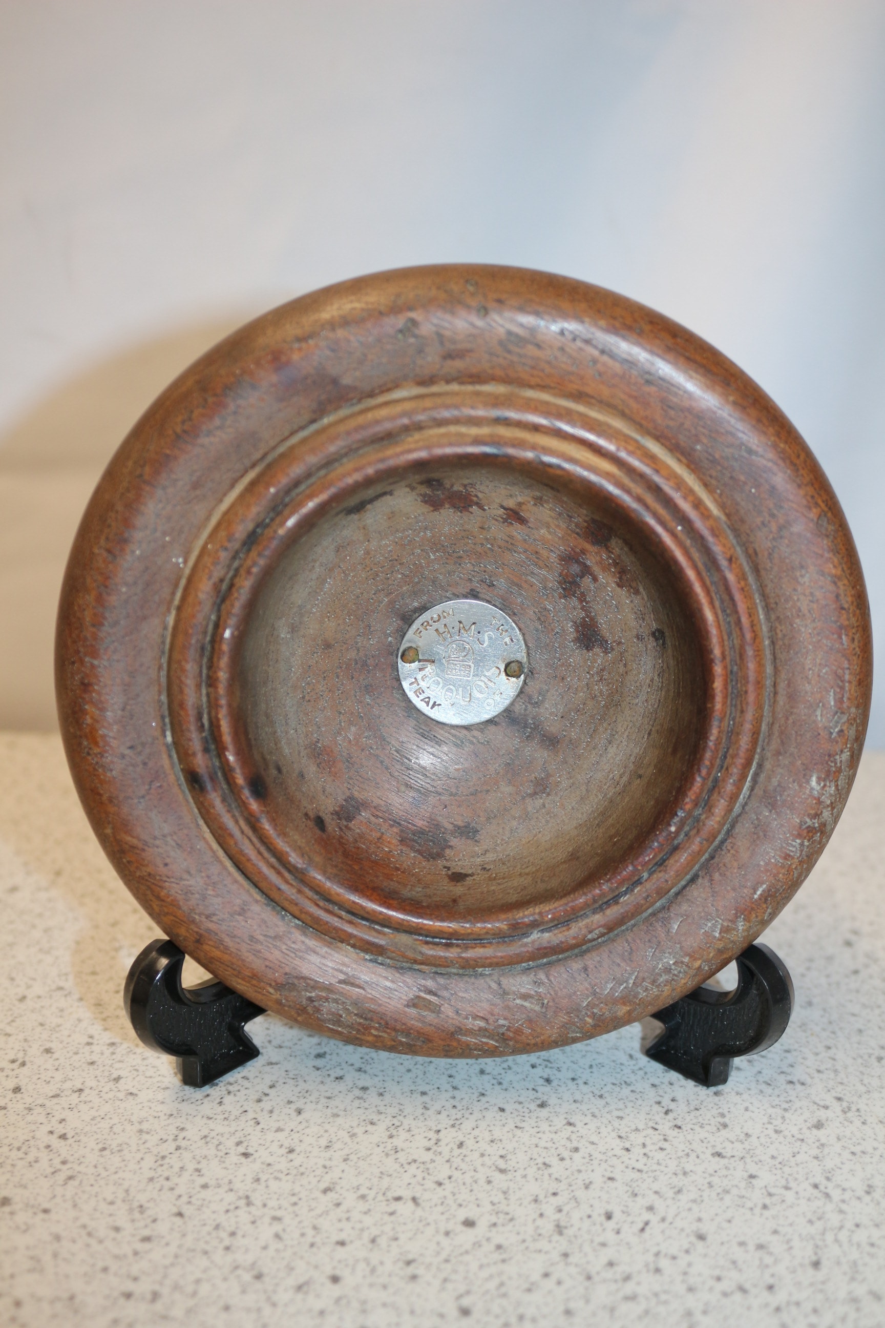 A round, lidded brown wooden box with a carved landscape scene and “Chamonix” inscription, a round brown wooden plaque with a metal disc inscribed “FROM H.M.S. THE IROQUOIS OF TEAK” and “WOOD CRAFT” logo, and a small, barrel-shaped brown wooden cup with a gold plaque reading “FROM THE TEAK OF H.M.S. IRON DUKE ADMIRAL JELLICOE’S FLAG SHIP JUTLAND 1916.” French Land carved trinket box made in Chamonix