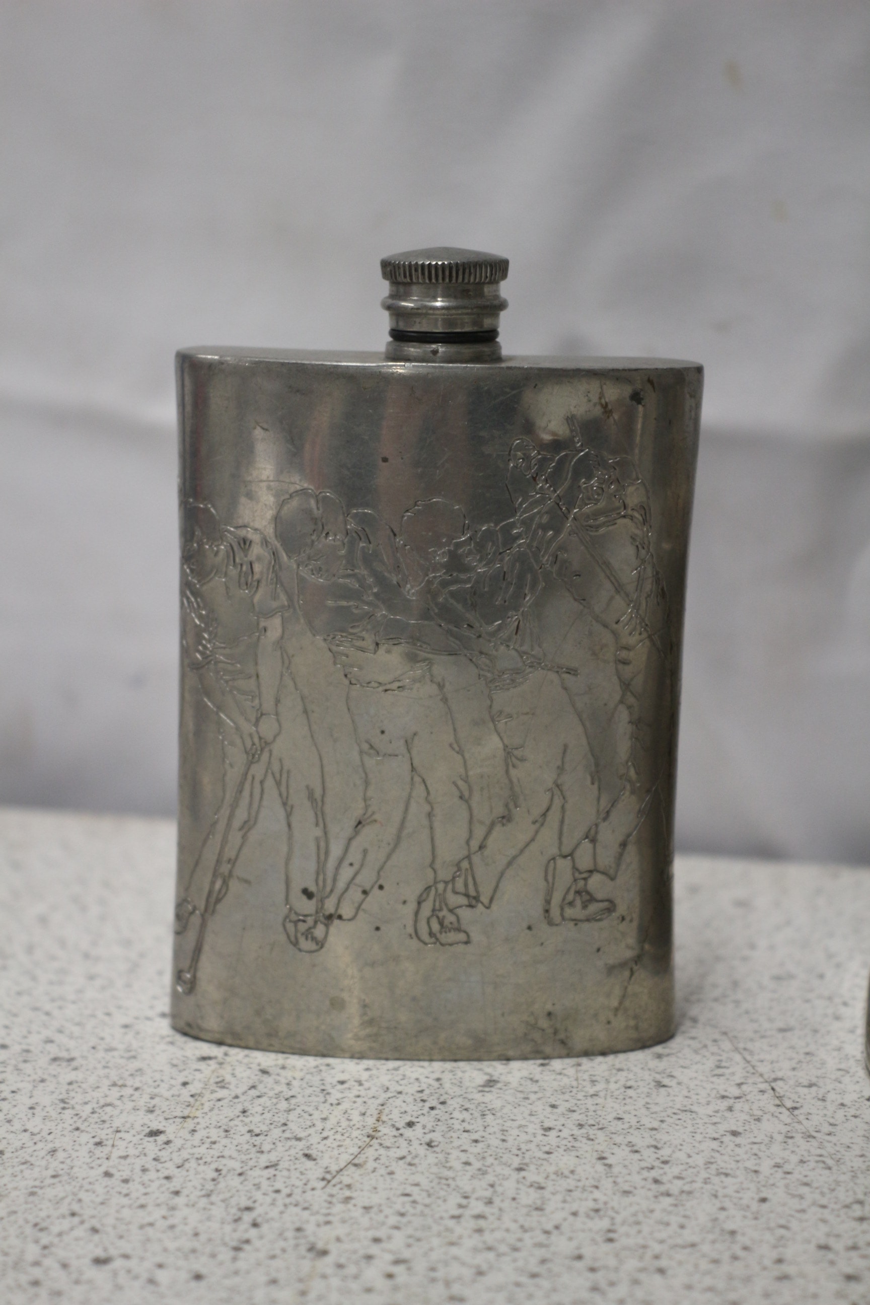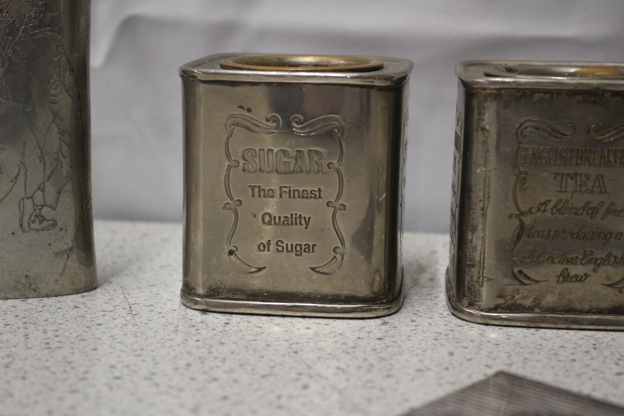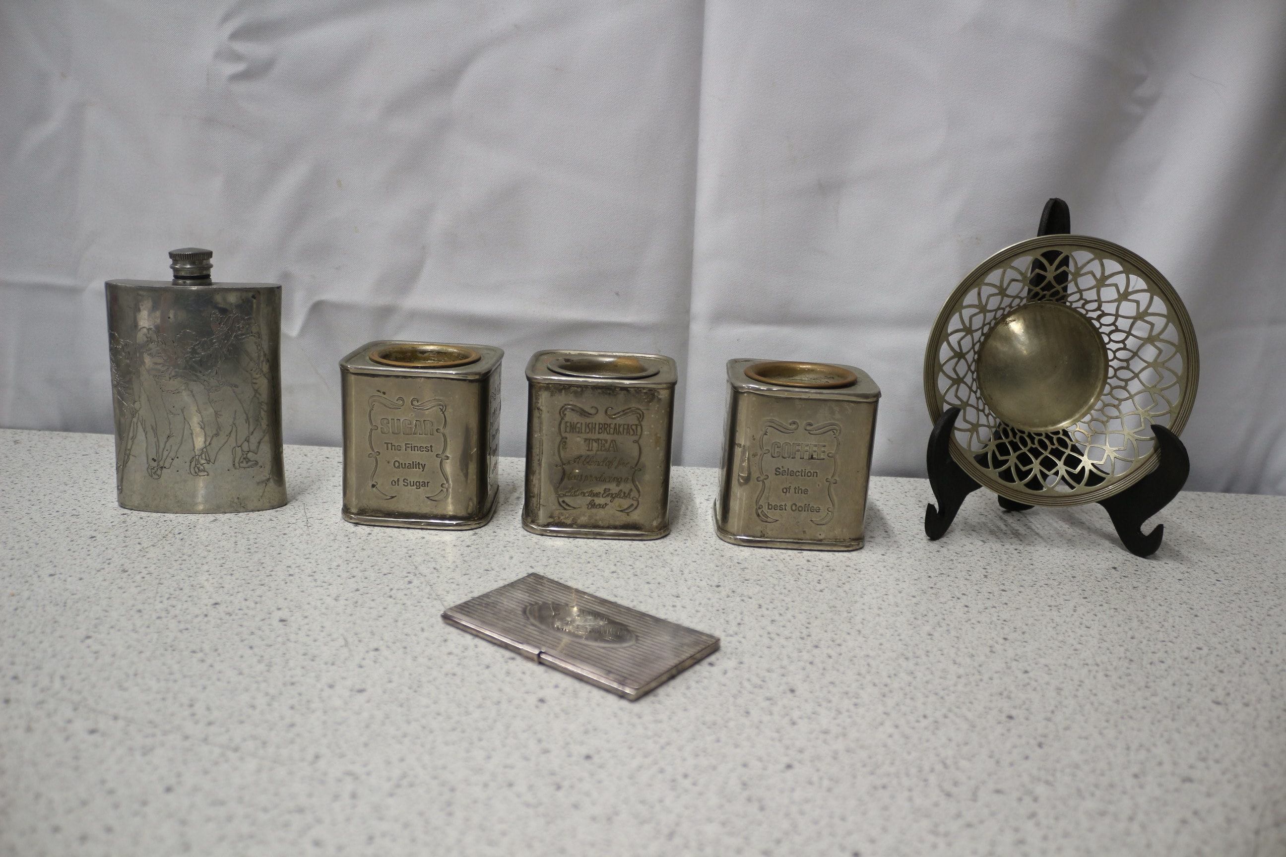 A collection of six metal items, including an engraved hip flask, three labelled storage caddies for ‘Sugar’, ‘English Breakfast Tea’, and ‘Coffee’, a decorative openwork plate on a stand, and a ribbed case.
