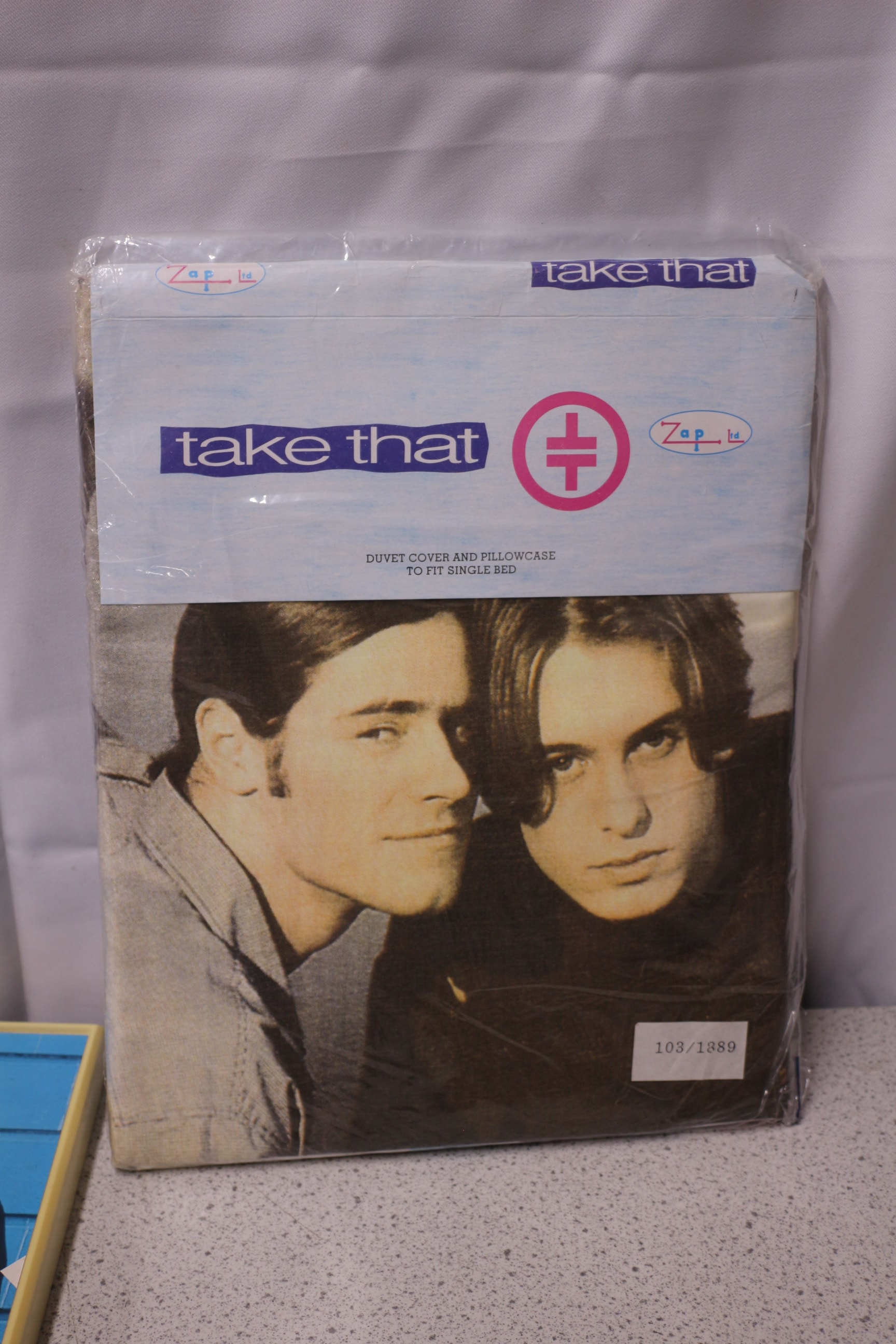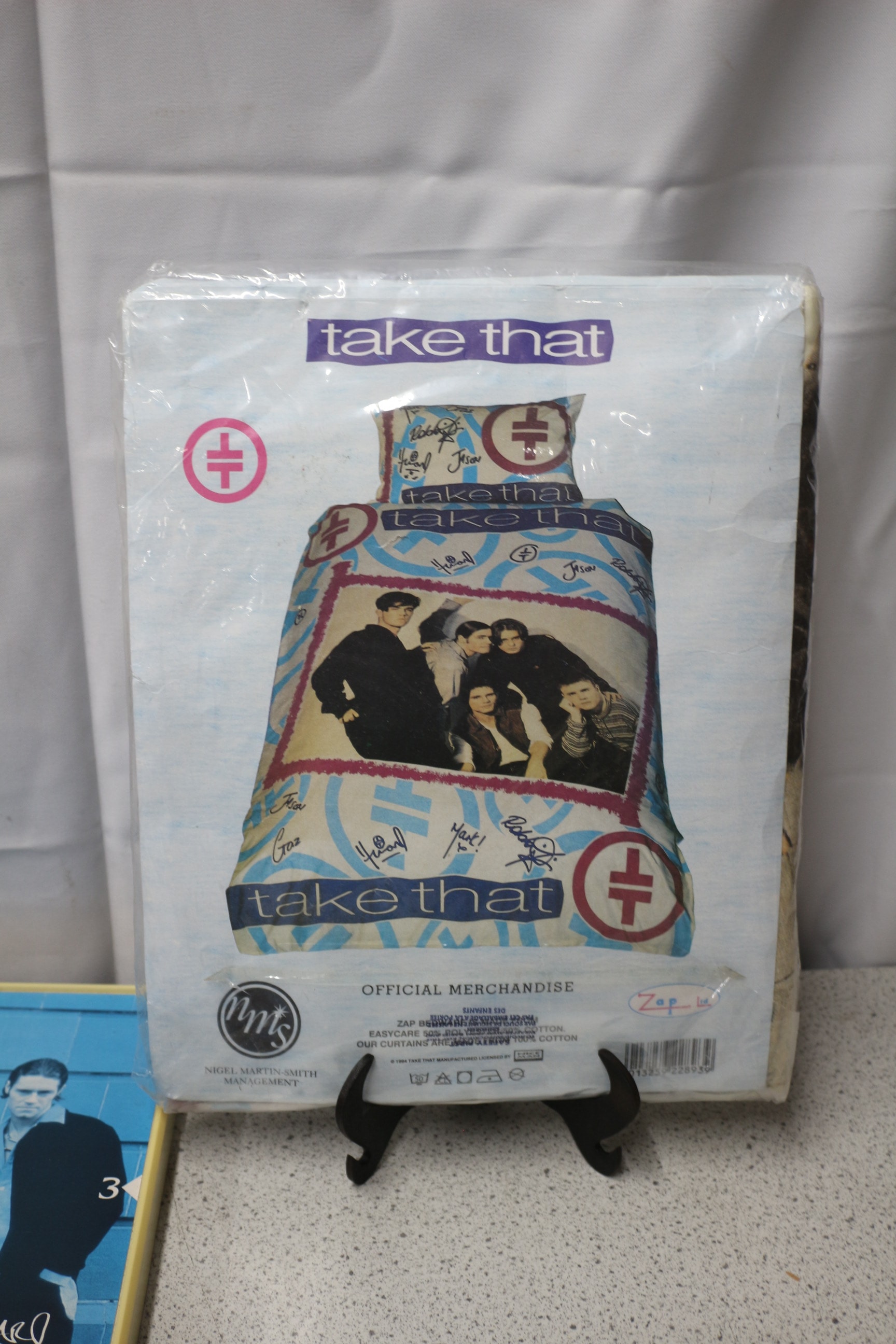 A Take That official merchandise duvet cover and pillowcase set, featuring the band on a cream/beige background with blue, red, and white branding, sold in a white and light blue plastic package labeled “take that”, “OFFICIAL MERCHANDISE”, “NIGEL MARTIN-SMITH MANAGEMENT”, “ZAP ME LTD”, “DUVET COVER AND PILLOWCASE TO FIT SINGLE BED”, “EASYCARE POLYESTER COTTON”, and “100% COTTON”, accompanied by a Take That wall clock and four Take That concert DVD/CD sets.