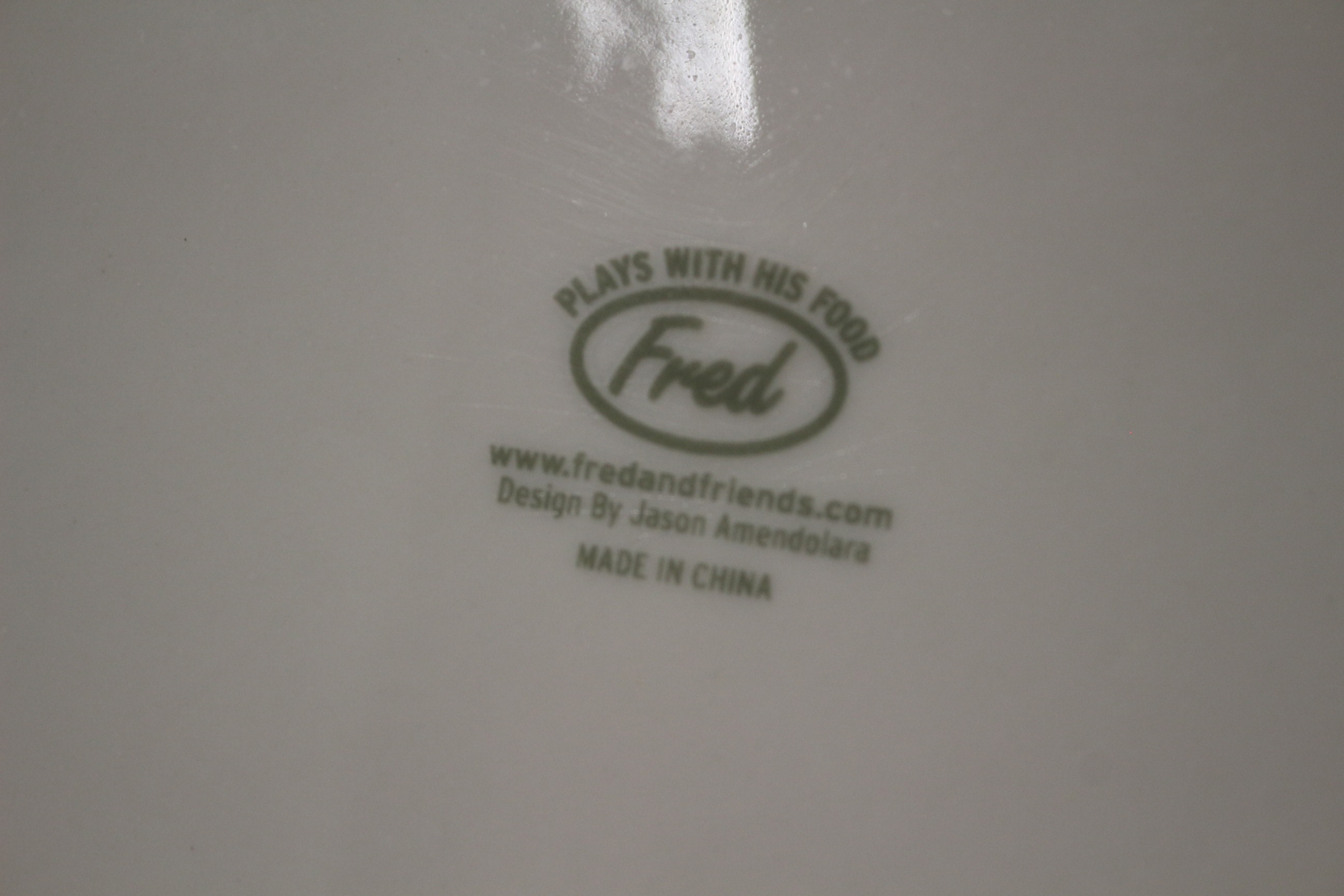 A pair of white ceramic plates featuring cartoon baby faces in beige, pink, and black, marked ‘PLAYS WITH HIS FOOD’ and ‘Fred’ on the reverse.