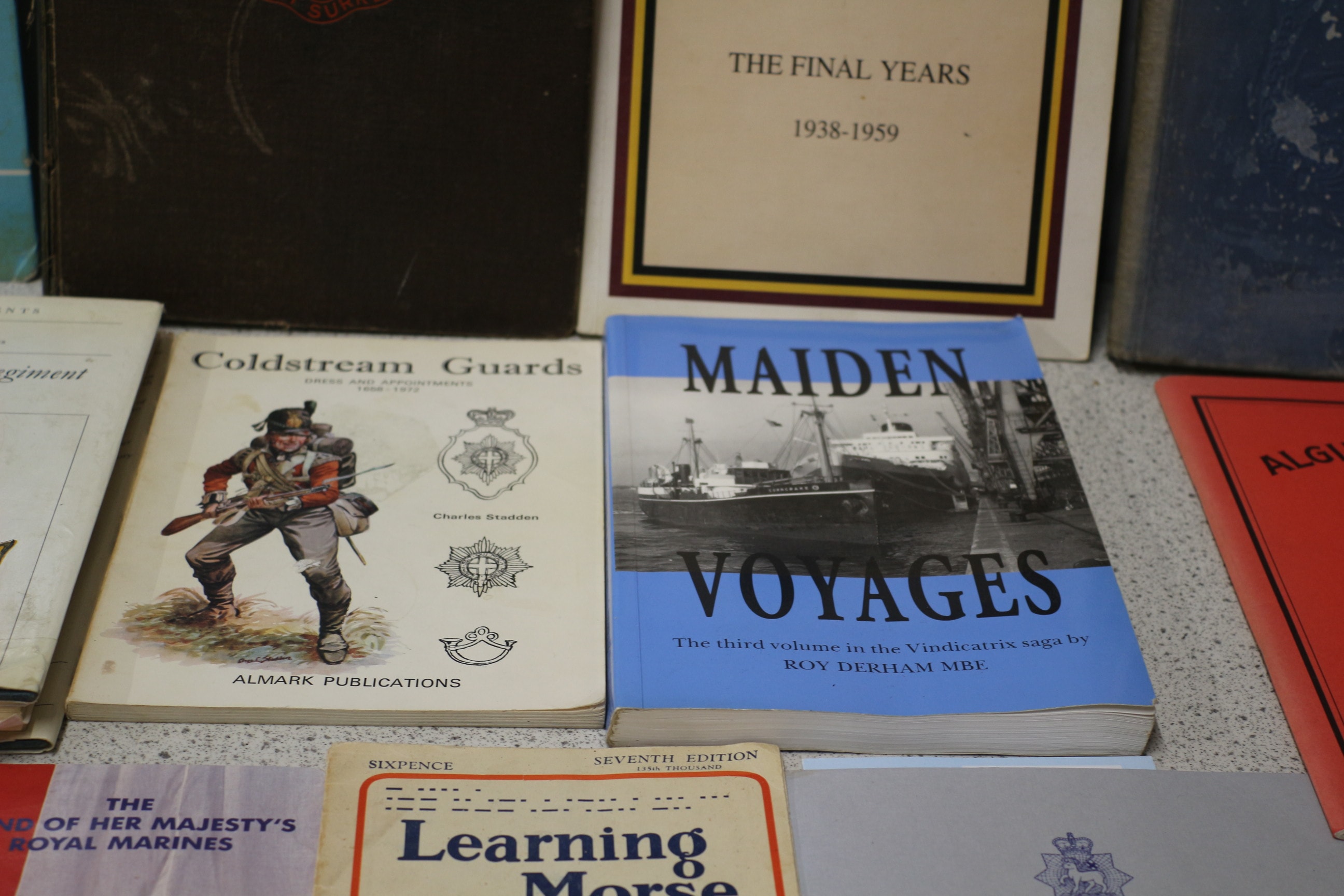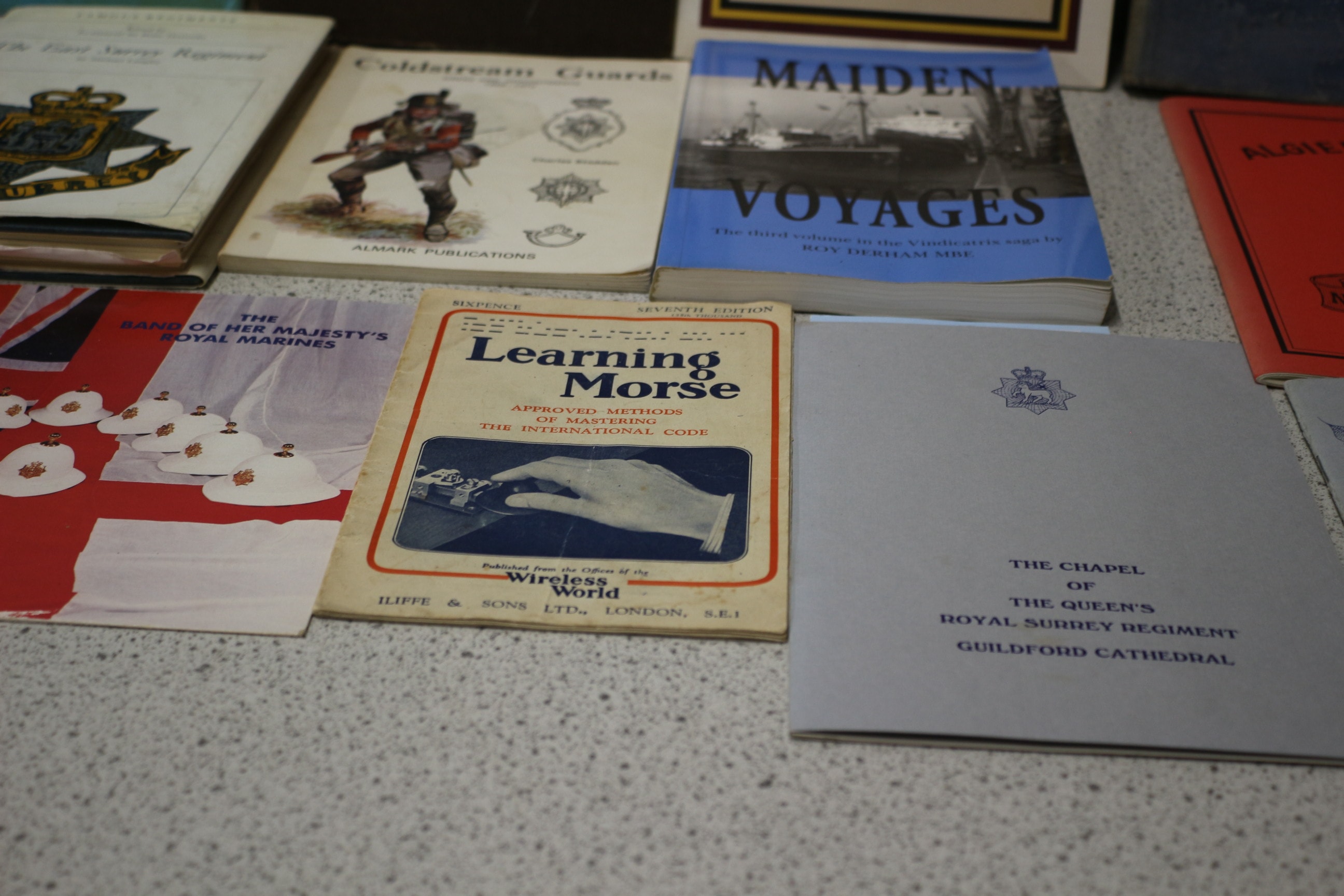 A collection of books in various states of wear, with visible titles including “THE PORT OF LONDON”, “BADGES OF THE BRITISH ARMY 1820-1960 F. WILKINSON”, “FAMOUS REGIMENTS The East Surrey Regiment”, “Coldstream Guards”, “MAIDEN VOYAGES ROY DERHAM MBE”, “ALGIERS TO TUNIS NORTH AFRICA 1942-43”, “STEAM FISHERMEN in old photographs Celia Clark”, “THE BAND OF HER MAJESTY’S ROYAL MARINES A TRIBUTE”, “SIX PENCE SEVENTH EDITION Learning Morse ILIFFE & SONS LTD., LONDON, S.E.1”, “THE CHAPEL OF THE QUEEN’S ROYAL SURREY REGIMENT GUILDFORD CATHEDRAL”, and “THE FINAL YEARS 1938-1959”.