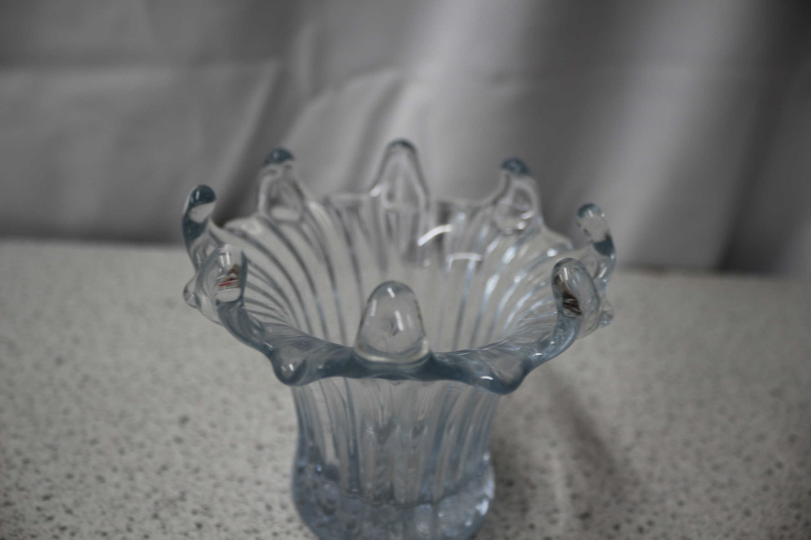 A clear/light blue fluted glass vase or candle holder with a lily-form rim, in Art Deco style. 9.5cm tall