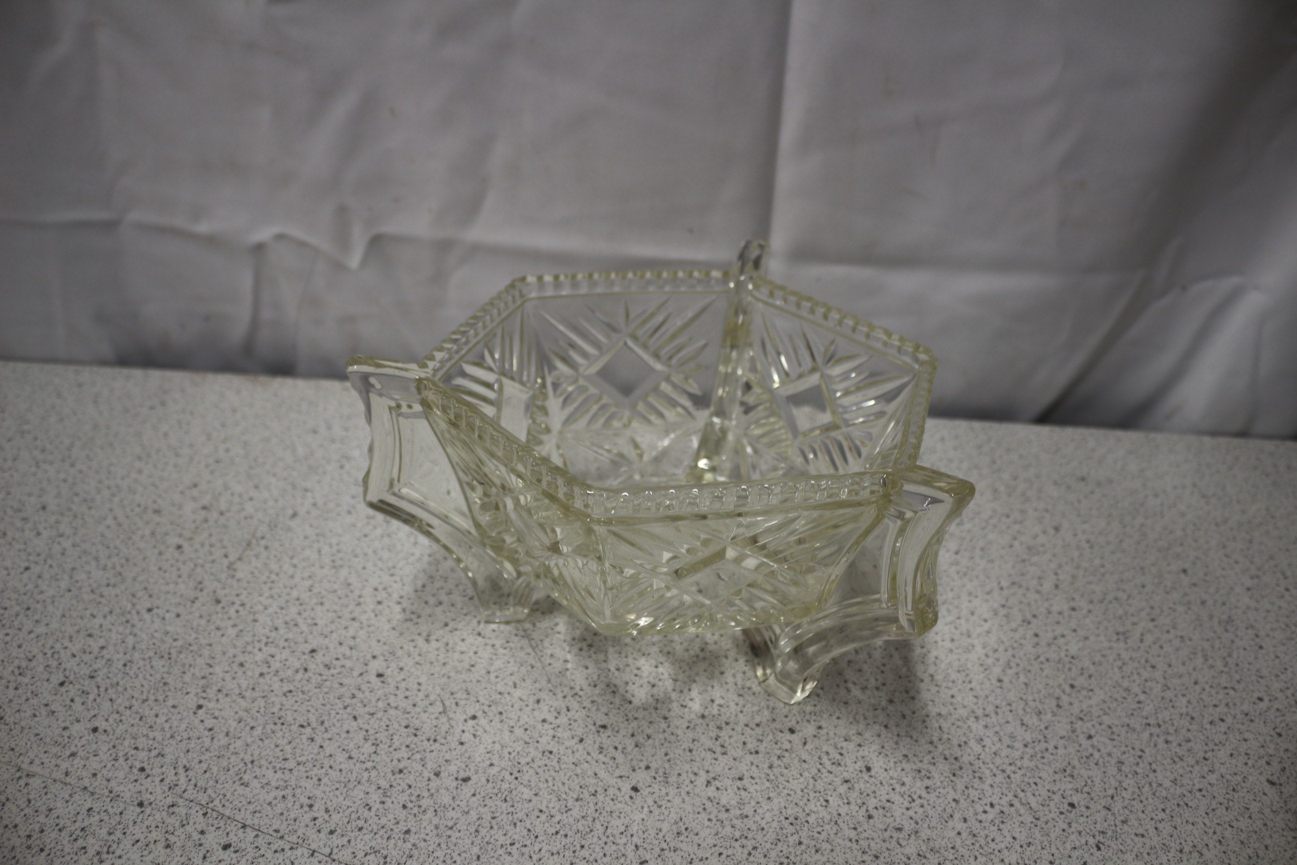 A clear, hexagonal, footed, pressed glass, divided candy dish or serving bowl with a geometric pattern.