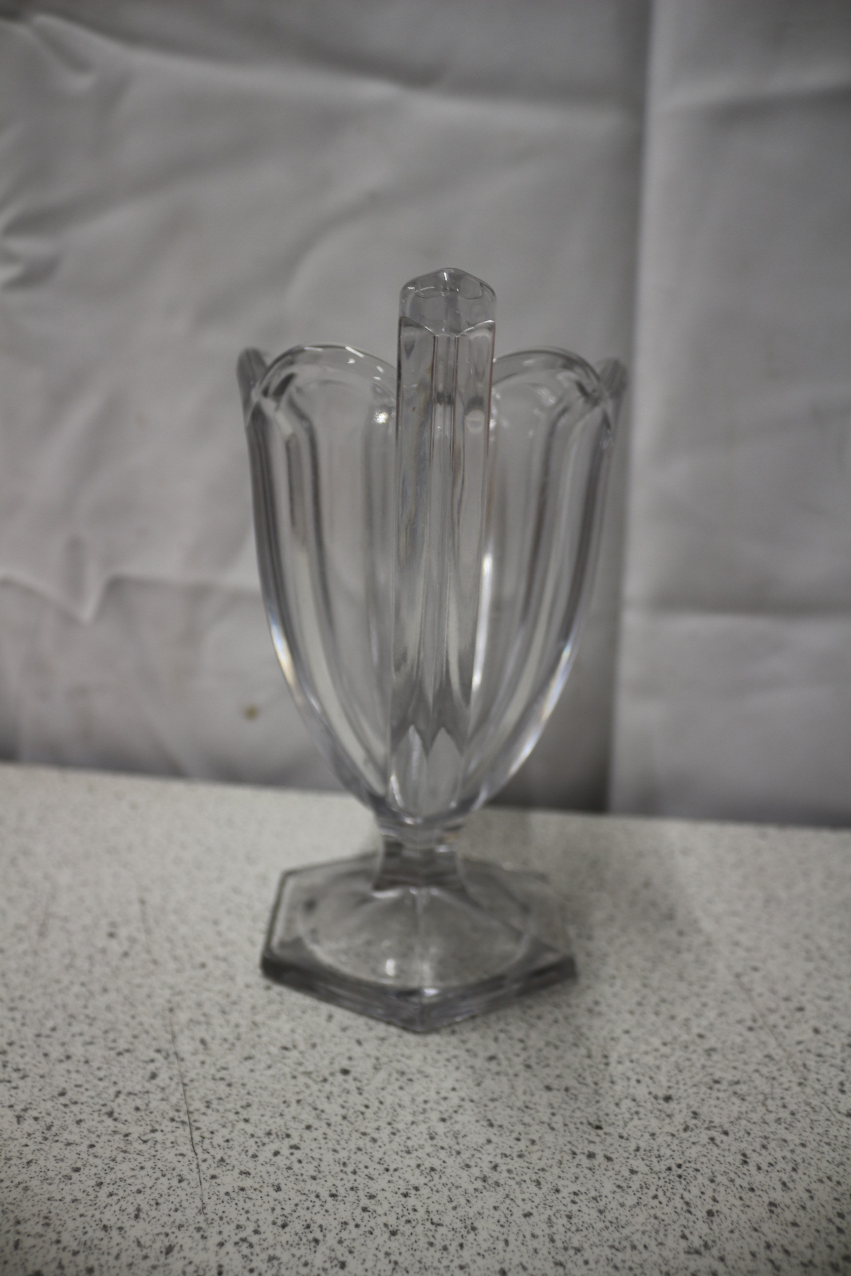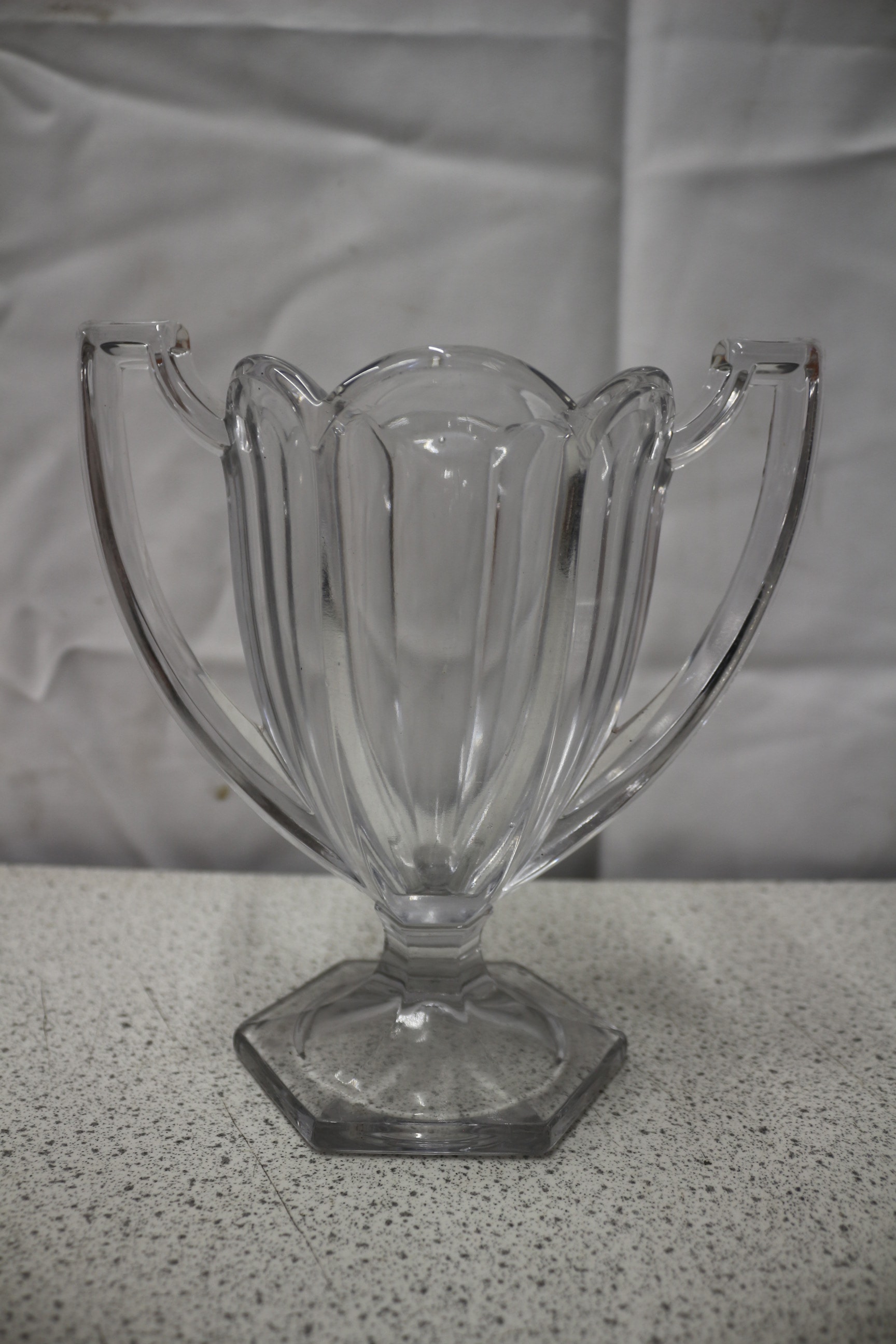 A clear pressed glass footed bowl with two handles and a fluted body.