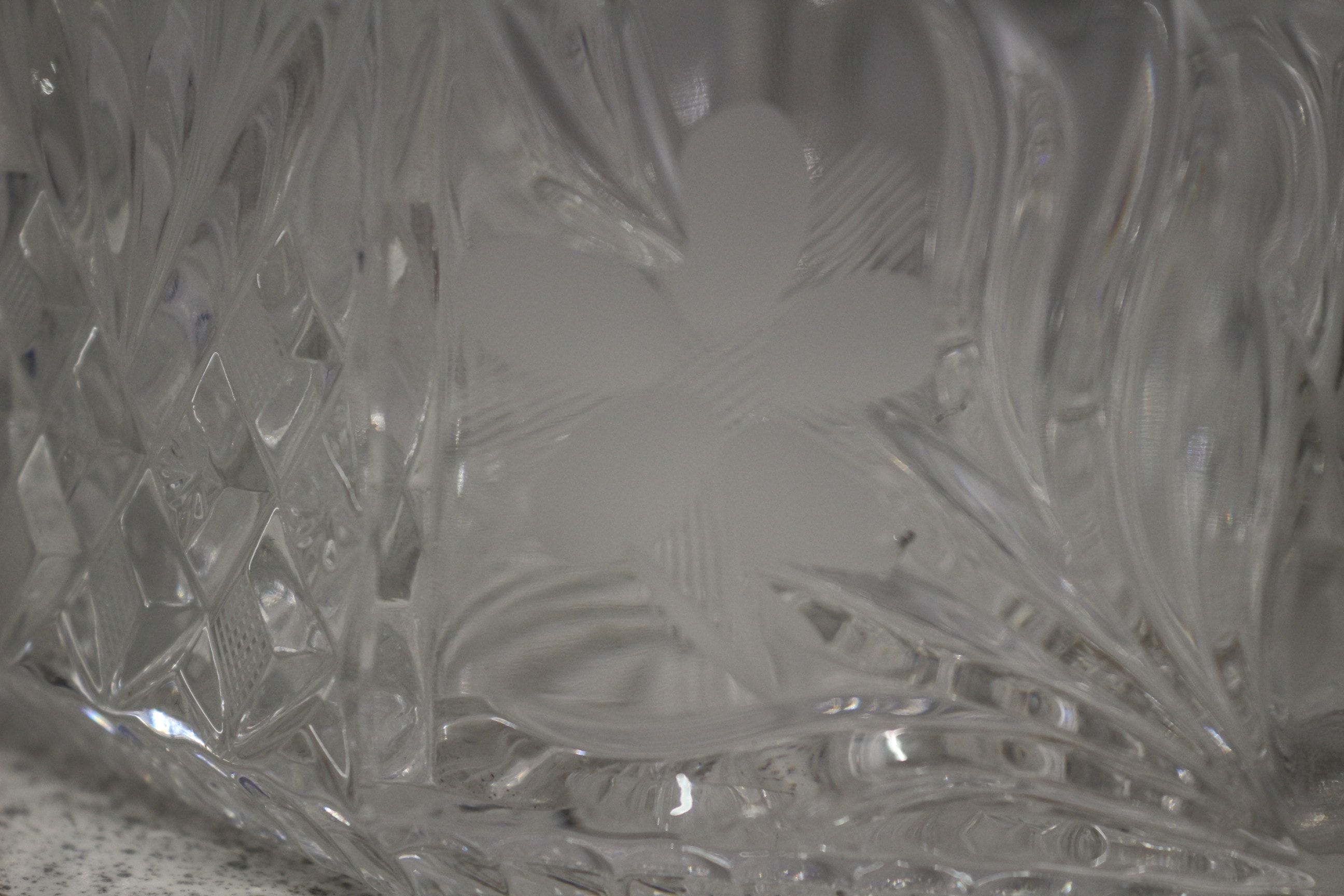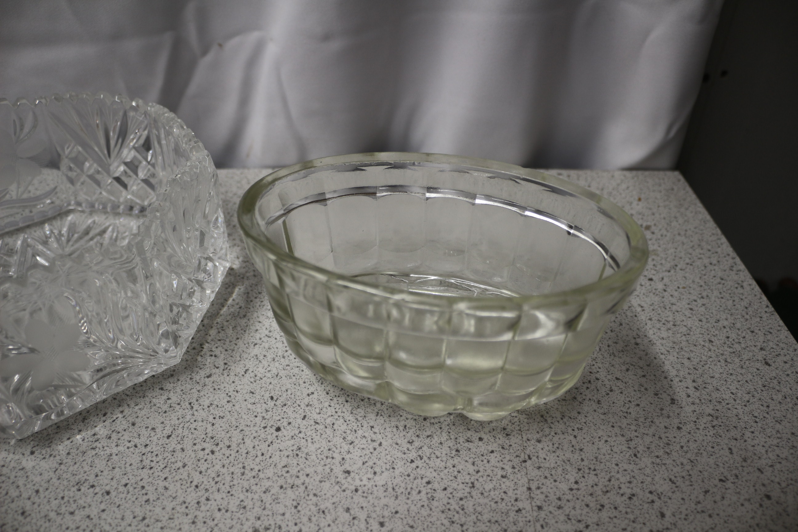 The lot consists of four clear glass serving items: one small round ribbed bowl, one square cut-glass dish, one large hexagonal cut-glass bowl with frosted floral designs, and one medium-sized oval ribbed bowl.