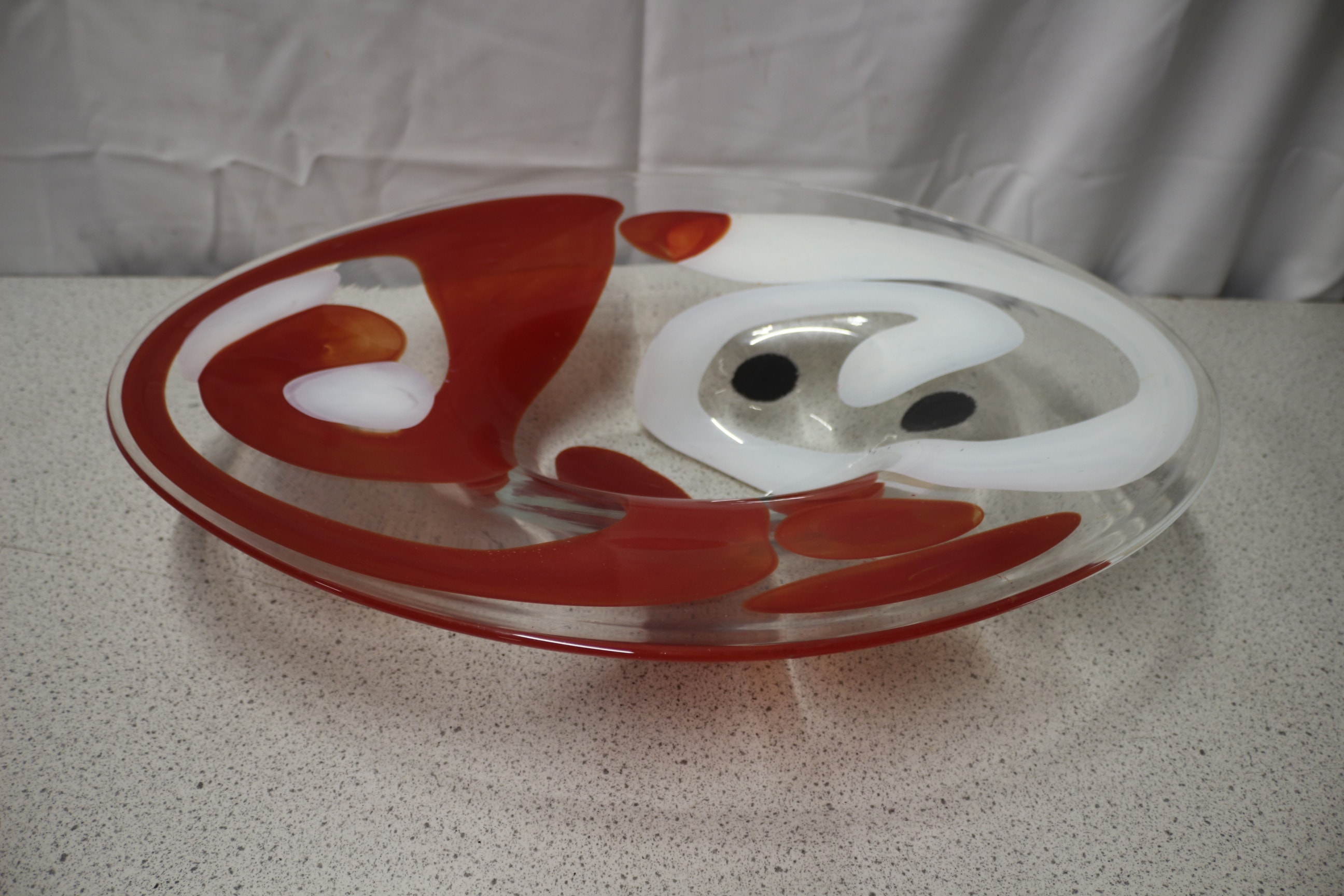 A large, clear glass decorative bowl/platter featuring swirling opaque red and white designs with two small black accents, including a faint, illegible etched signature or artist’s mark on its surface. 55cm wide