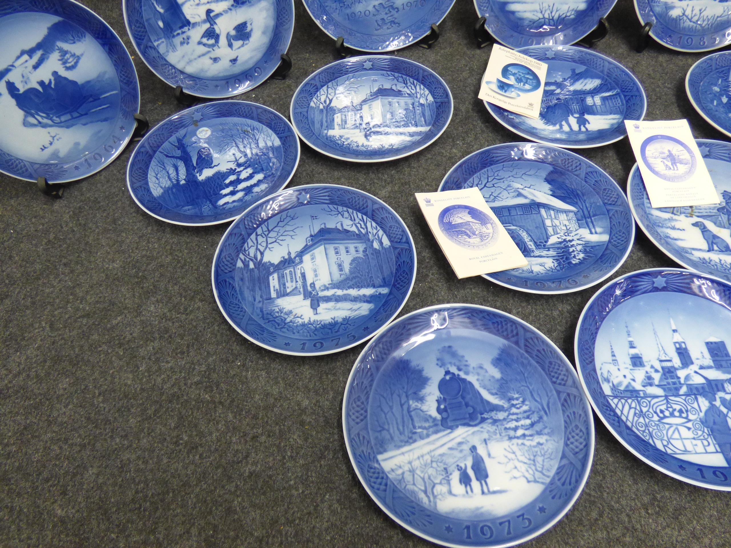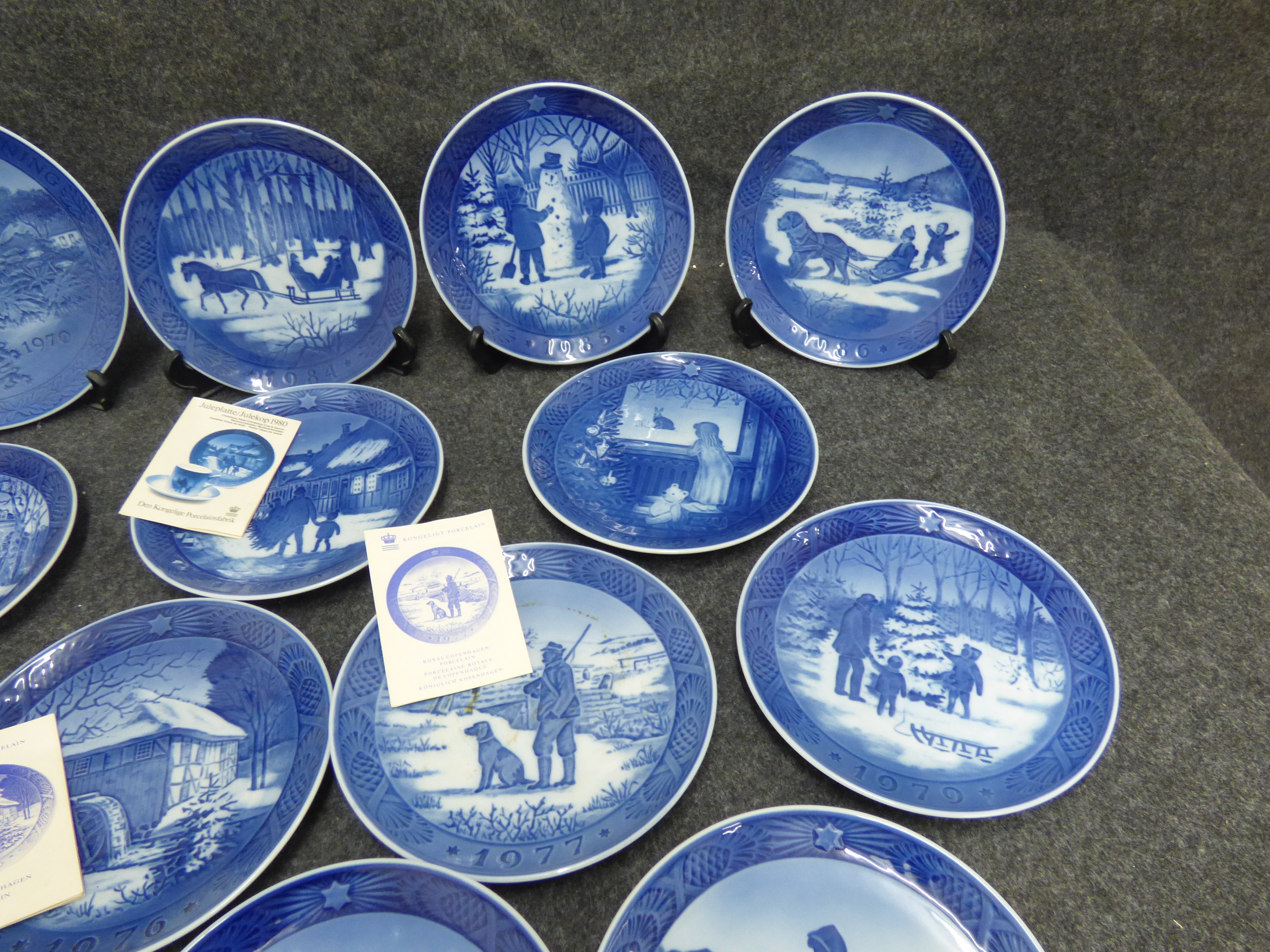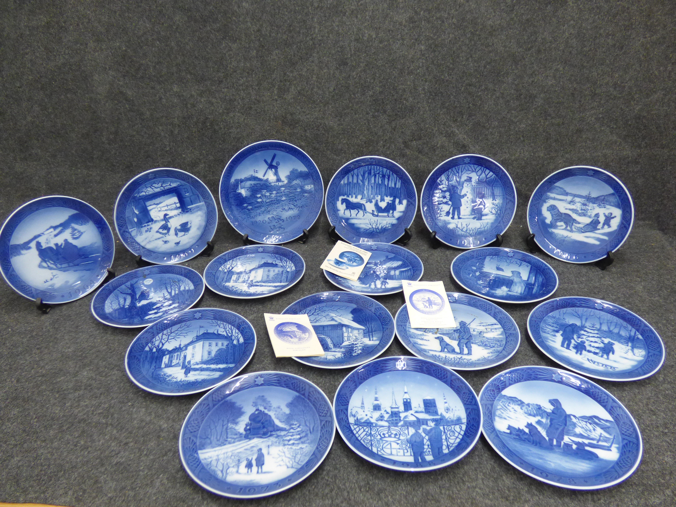 A collection of blue and white porcelain decorative plates featuring various winter scenes and commemorative motifs dated between 1920 and 1986, accompanied by original informational pamphlets. 1 larger 21cm, 16x small 18cm