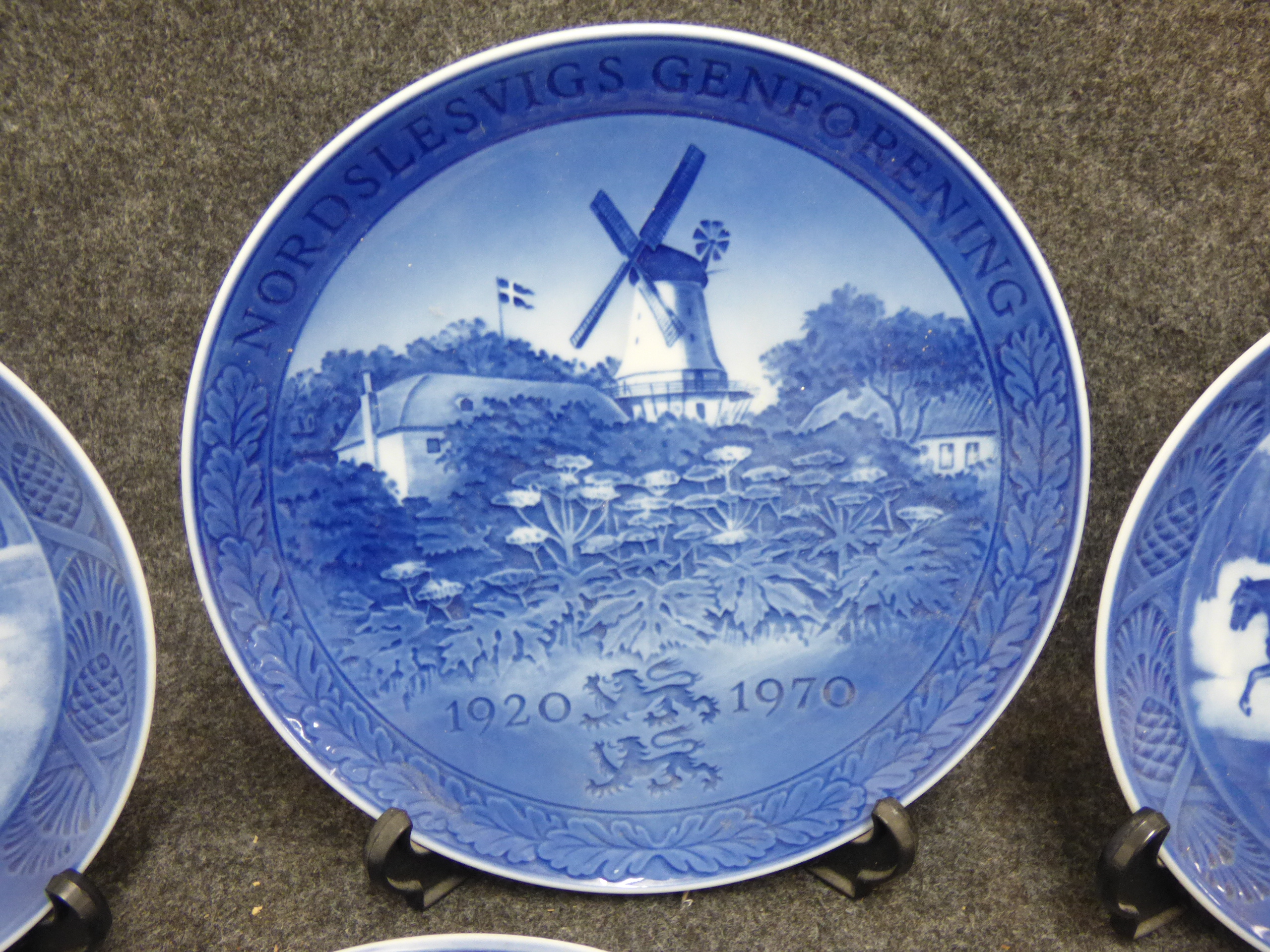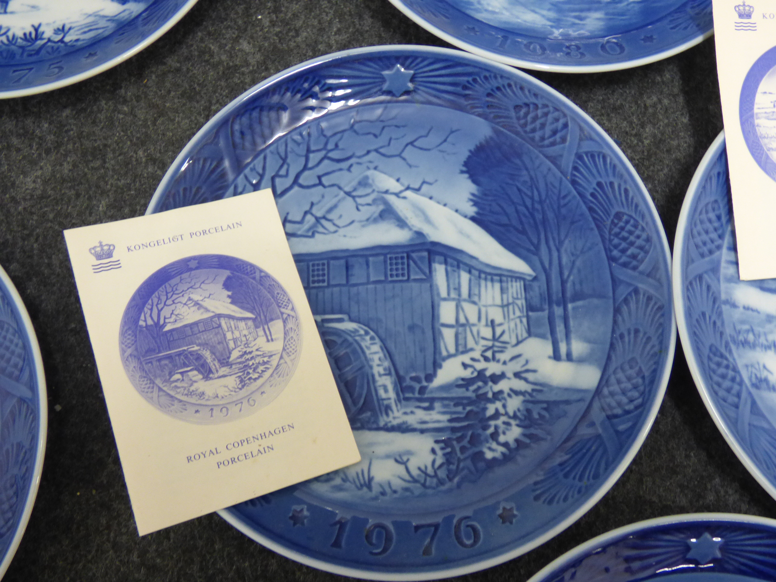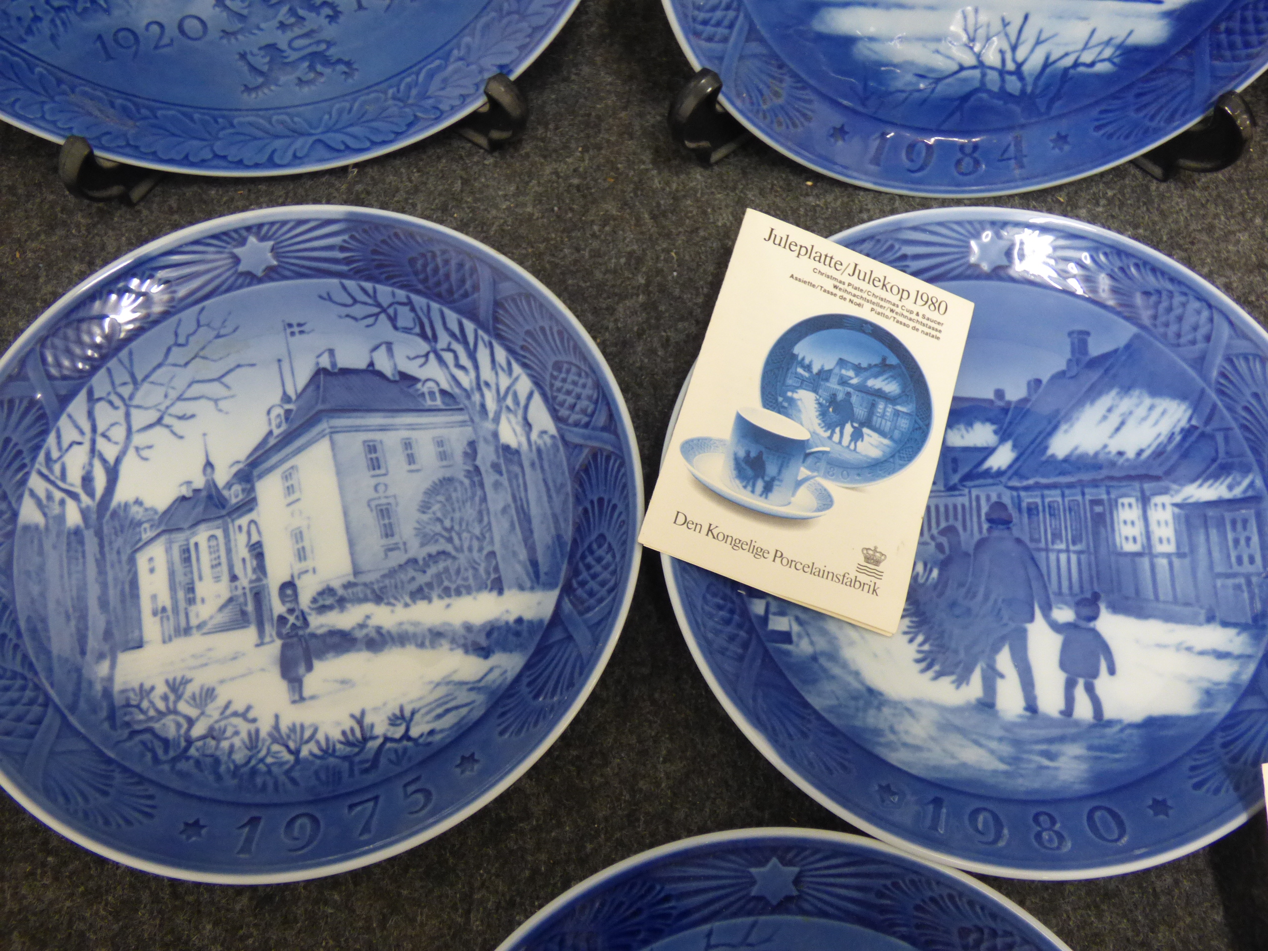 A collection of blue and white porcelain decorative plates featuring various winter scenes and commemorative motifs dated between 1920 and 1986, accompanied by original informational pamphlets. 1 larger 21cm, 16x small 18cm