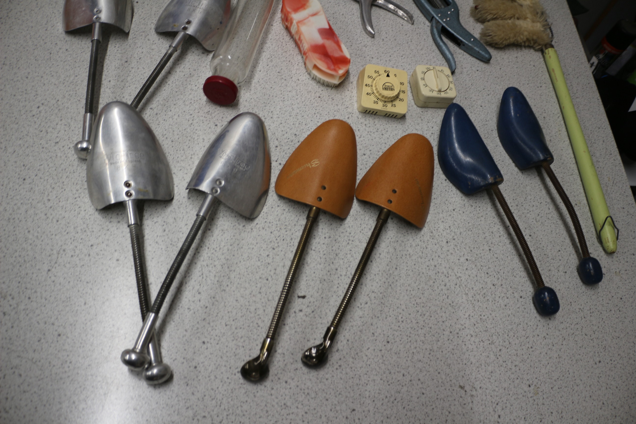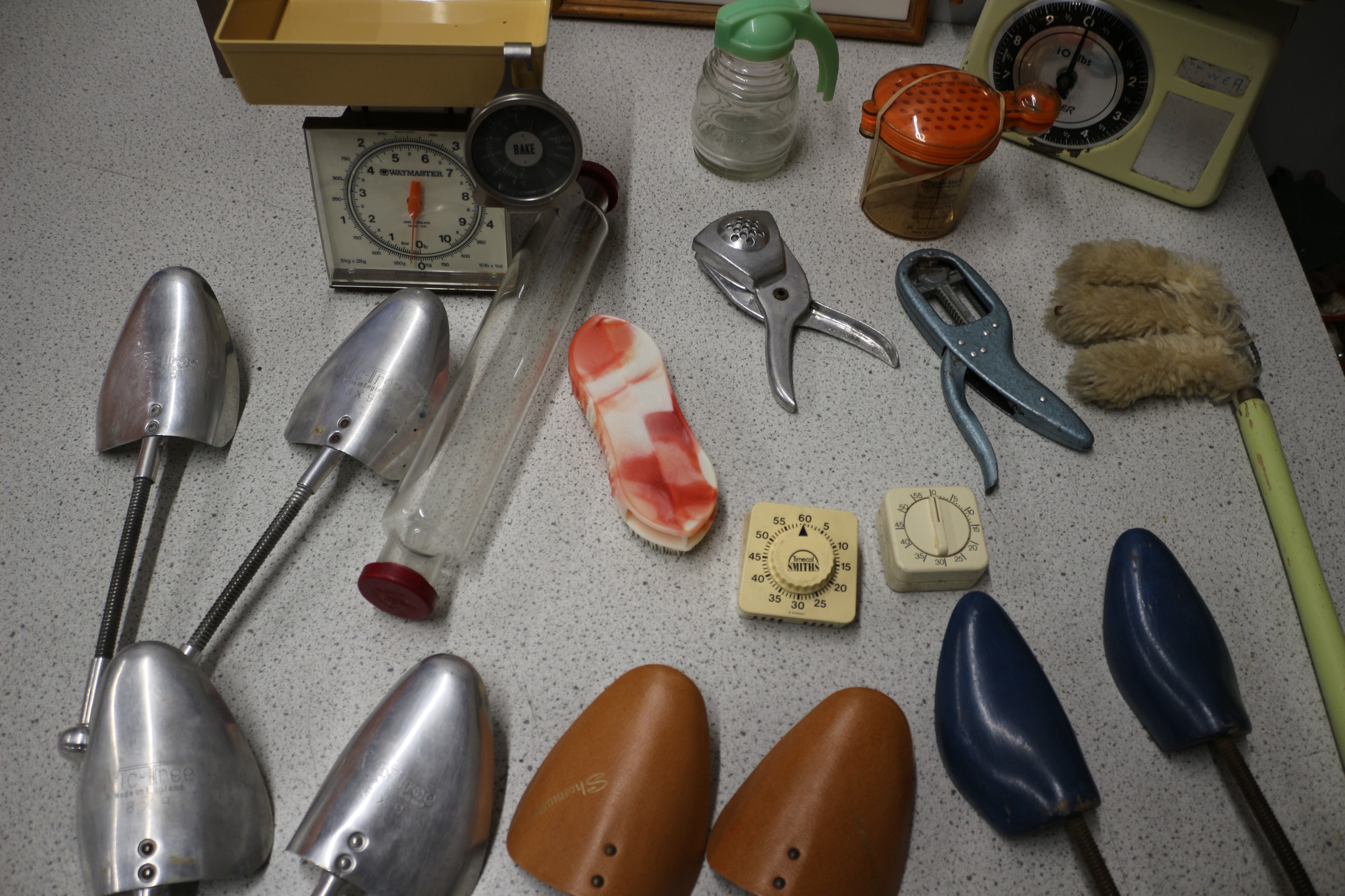A collection of vintage items including multiple pairs of shoe stretchers, two kitchen scales, a framed tile, a boxed mincer, and various kitchen tools.