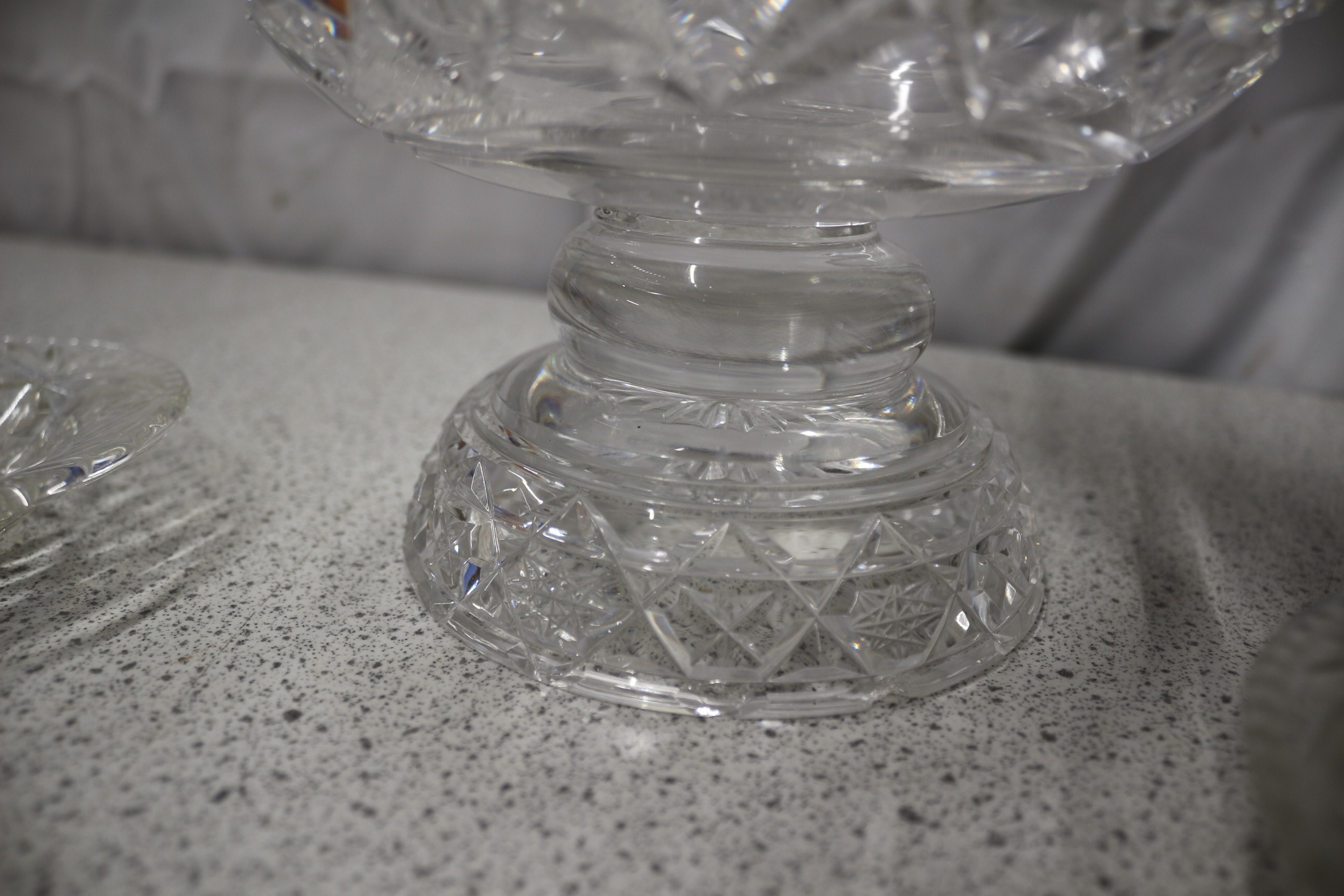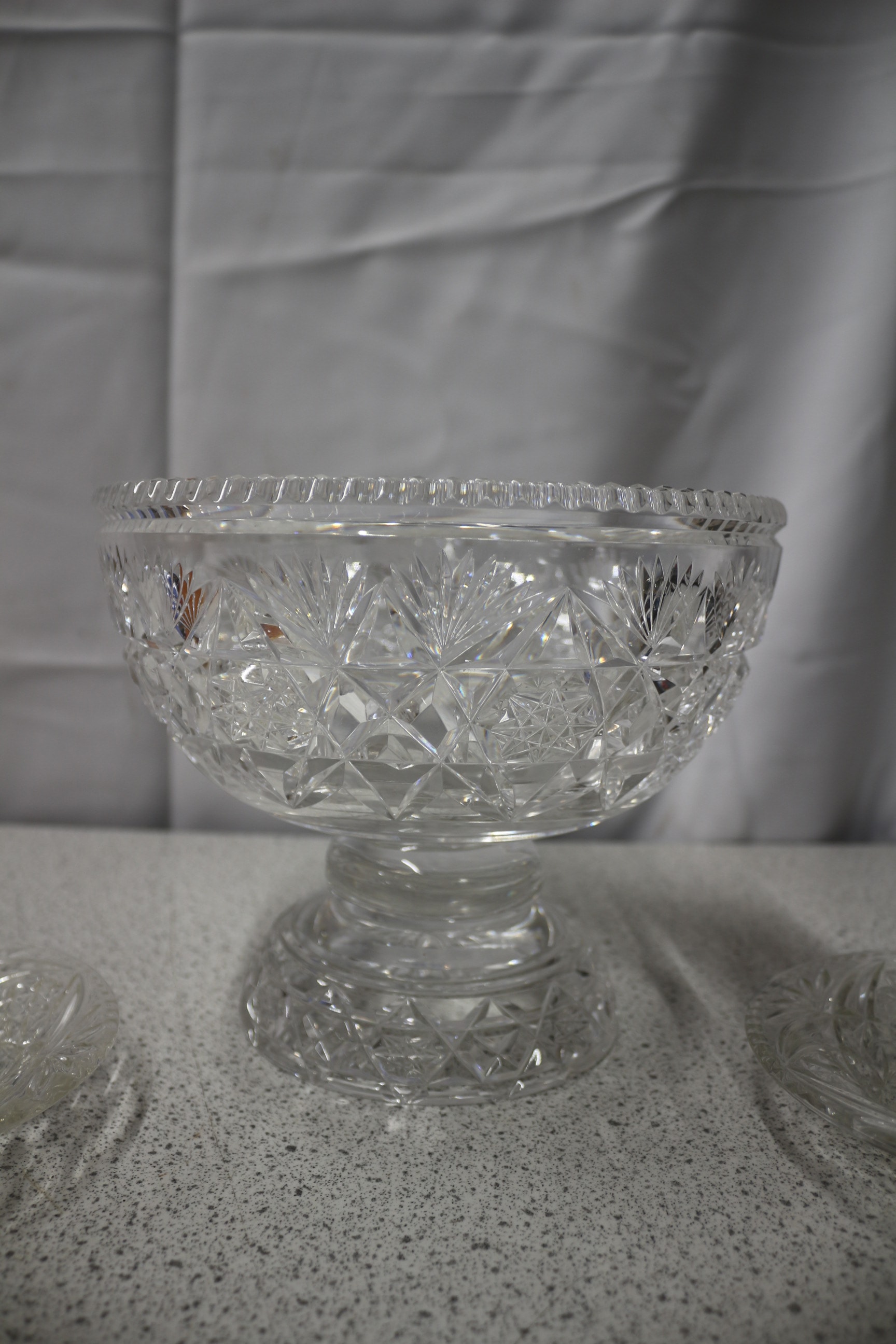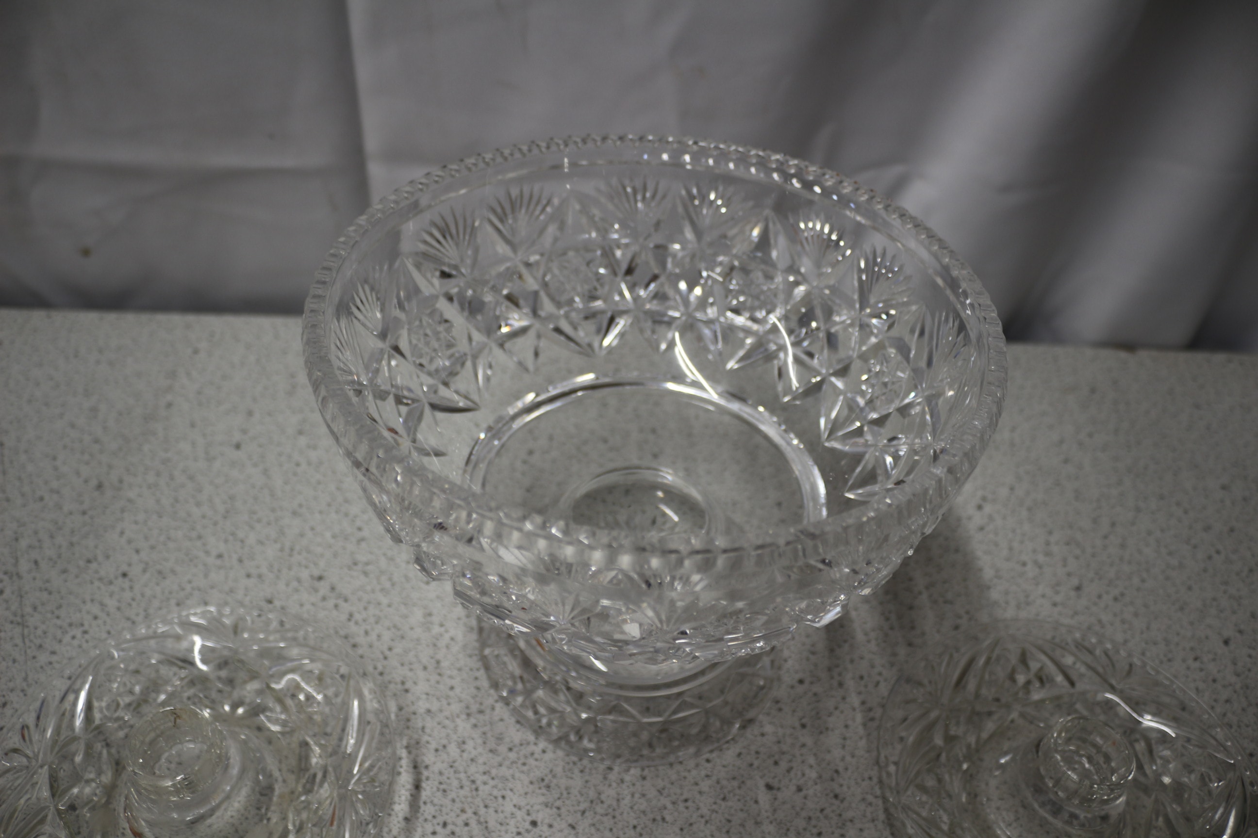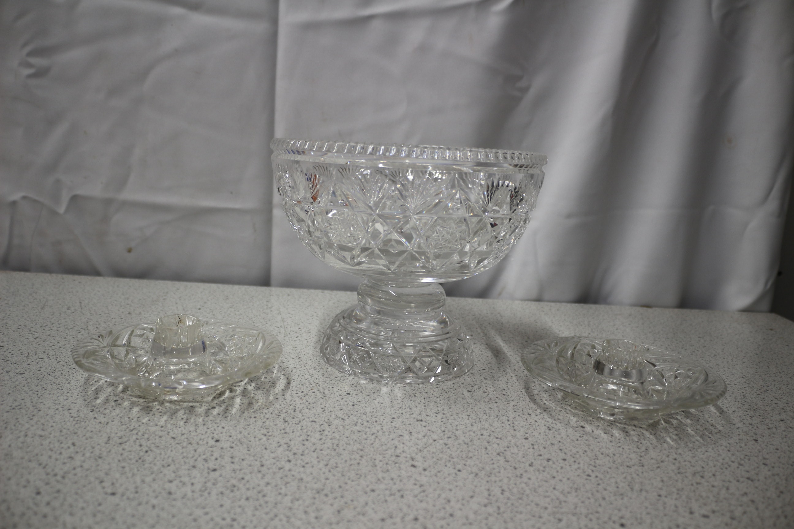 A large clear cut glass footed bowl and two smaller clear cut glass dishes.
