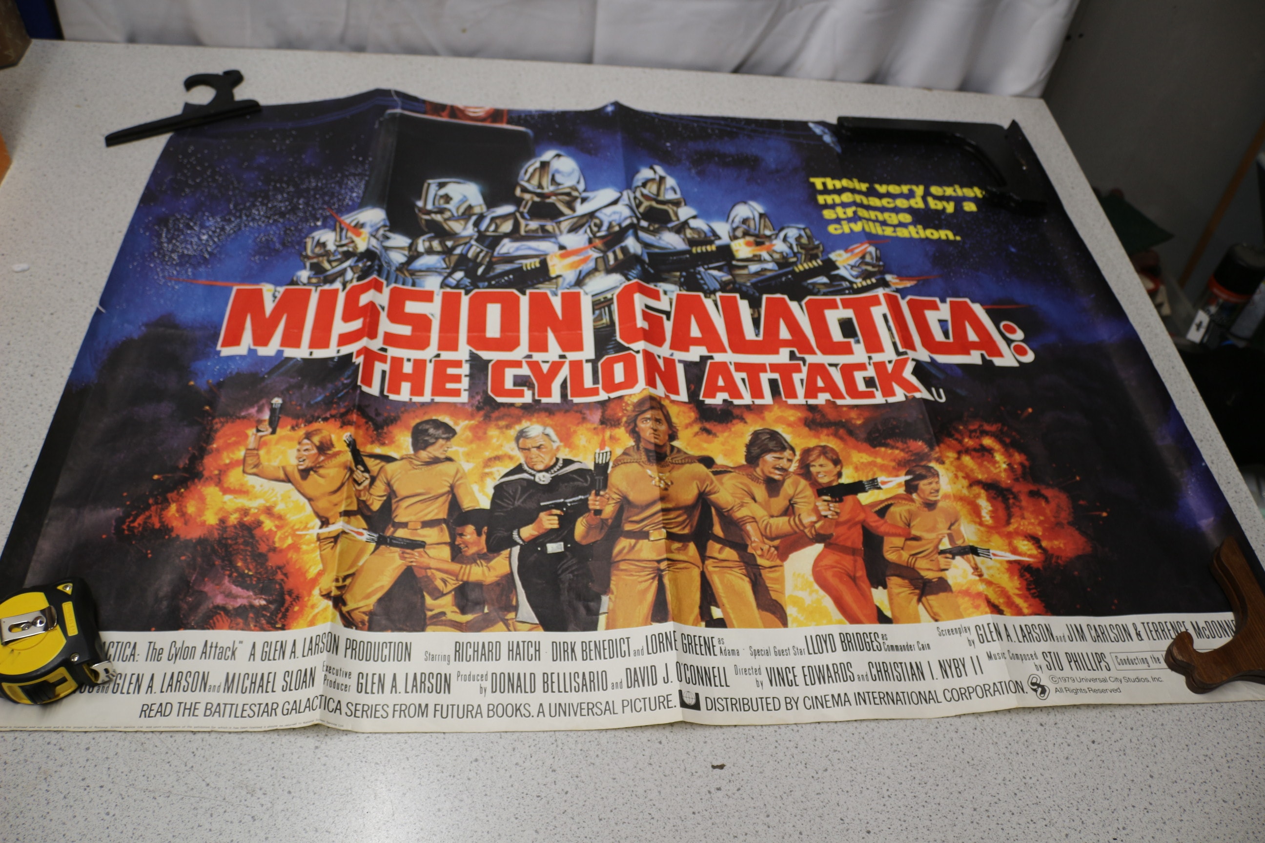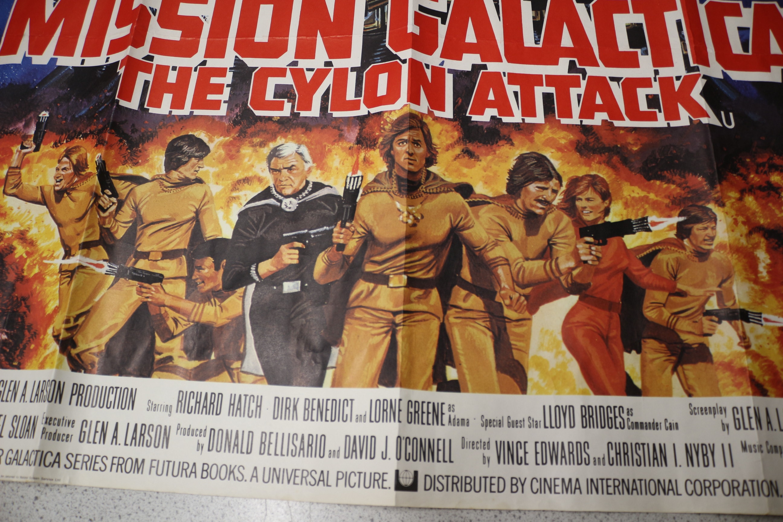 A multi-coloured movie poster for ‘MISSION GALACTICA: THE CYLON ATTACK, ‘ featuring Richard Hatch, Dirk Benedict, and Lorne Greene, copyrighted ©1979 Universal City Studios, Inc.