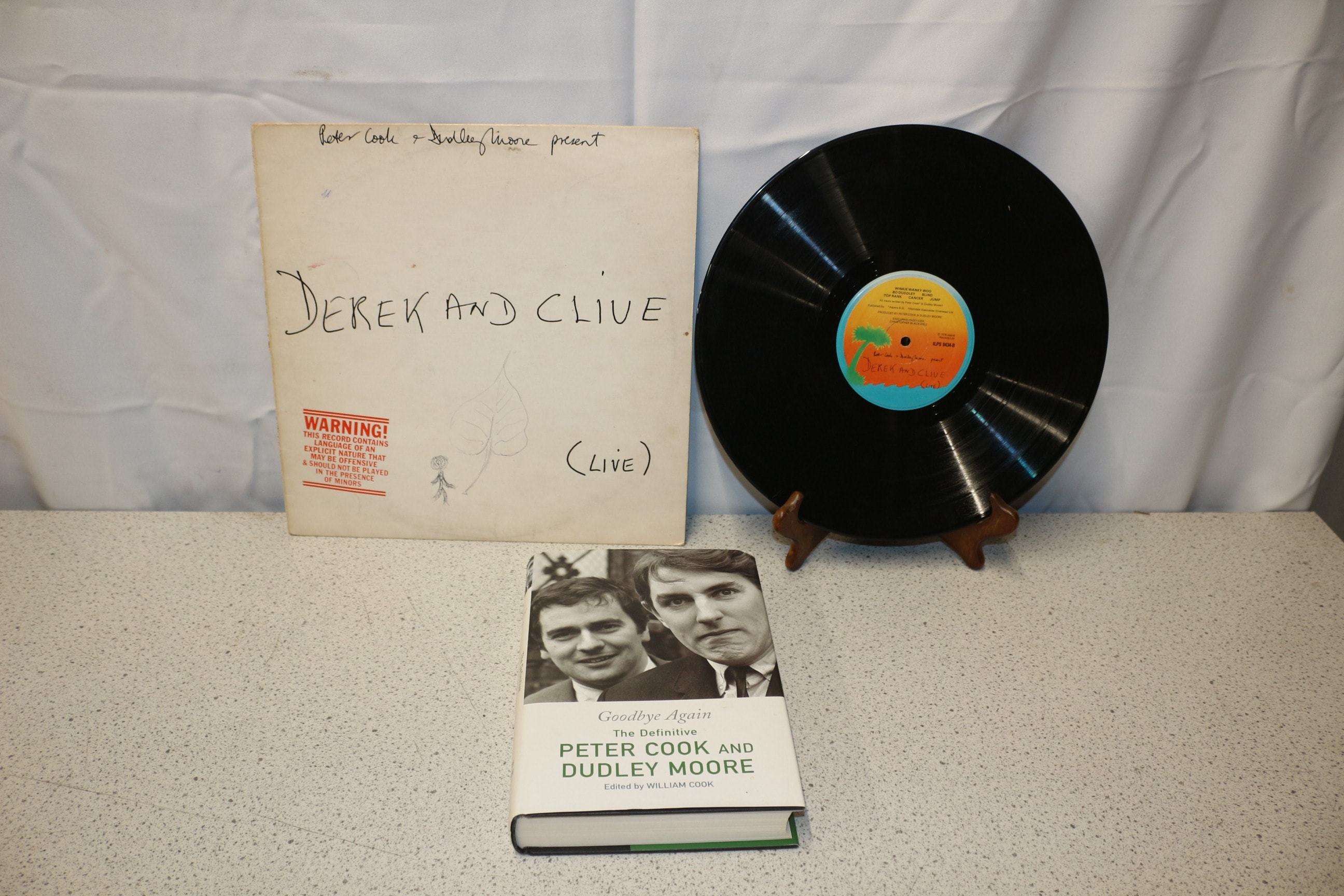 A Peter Cook & Dudley Moore ‘Derek and Clive (Live)’ vinyl record with its sleeve, accompanied by ‘Goodbye Again The Definitive Peter Cook and Dudley Moore’ book.