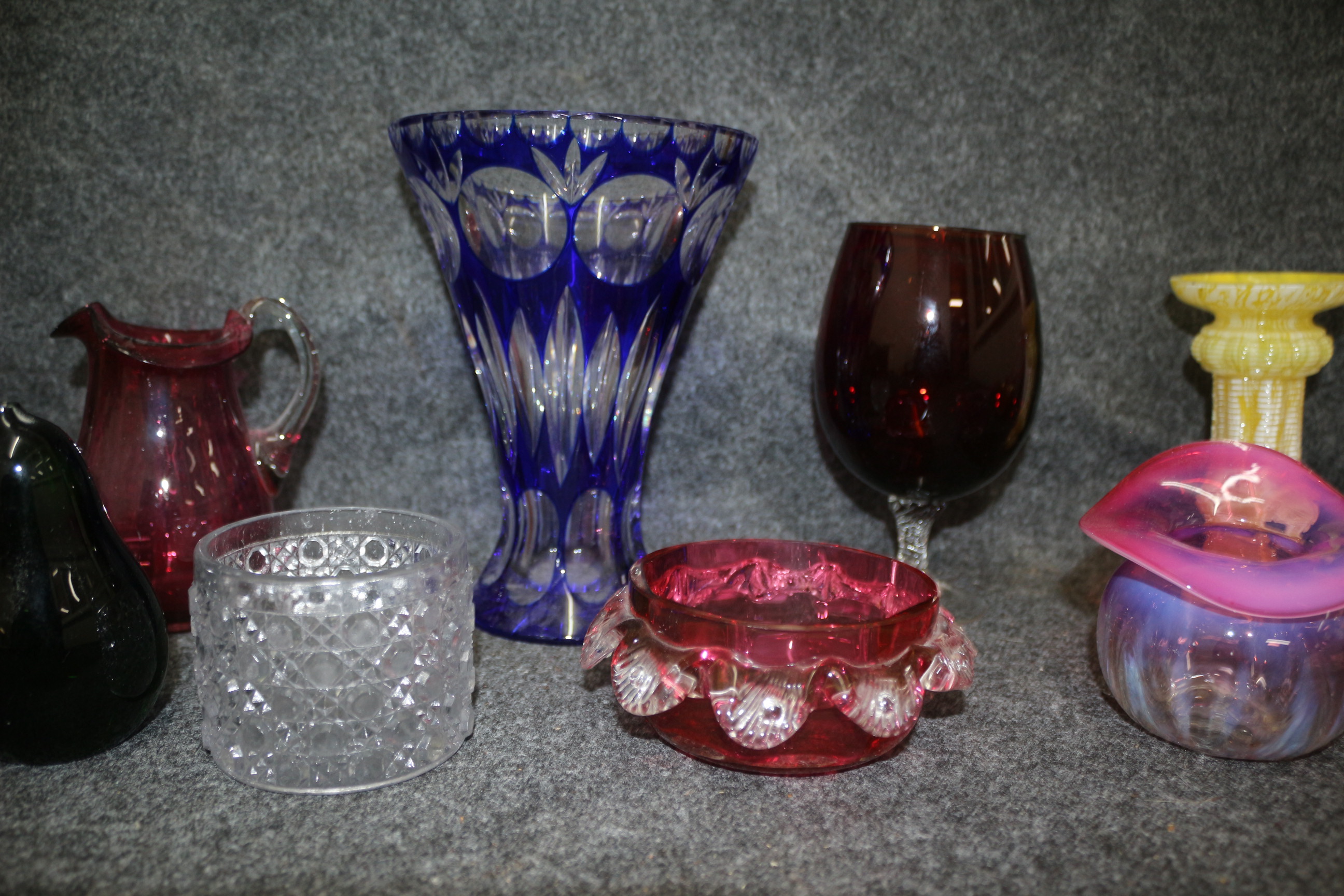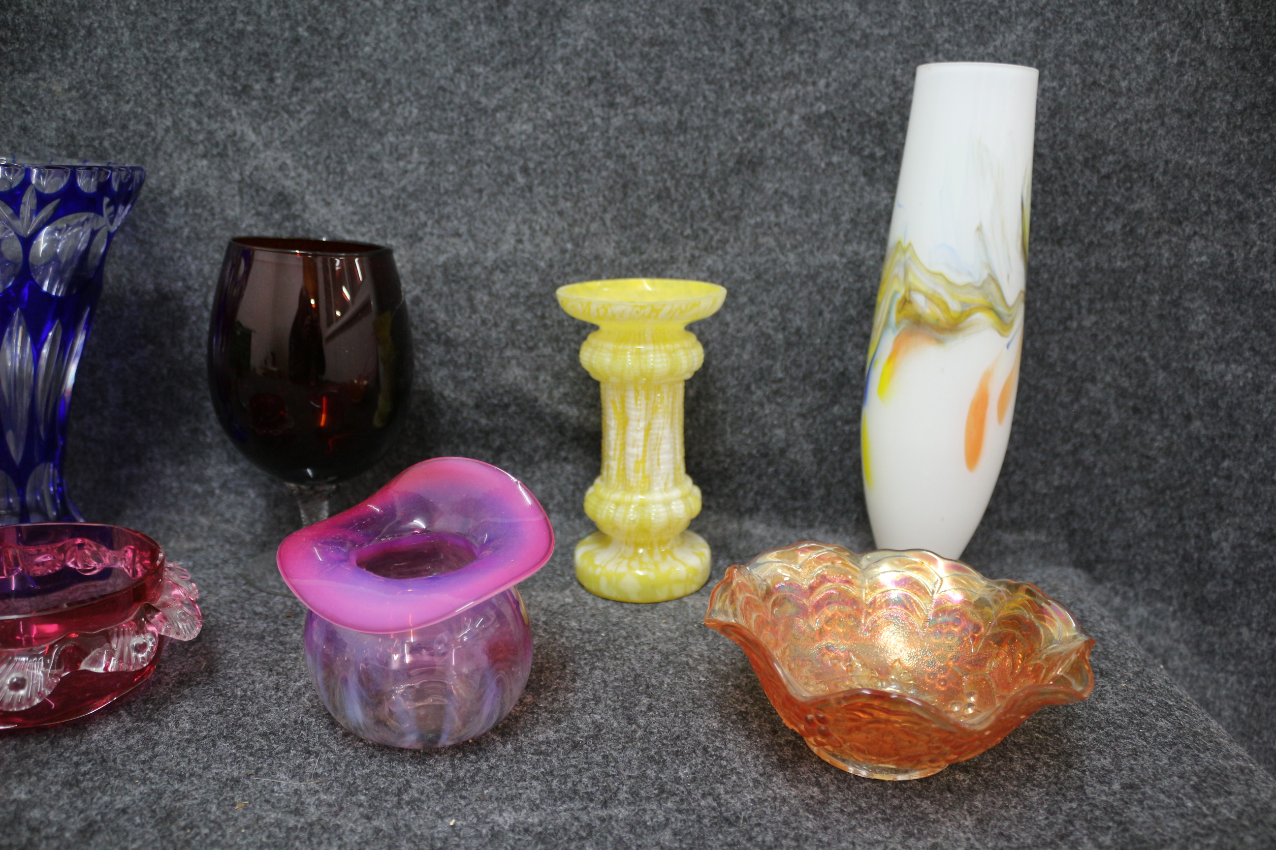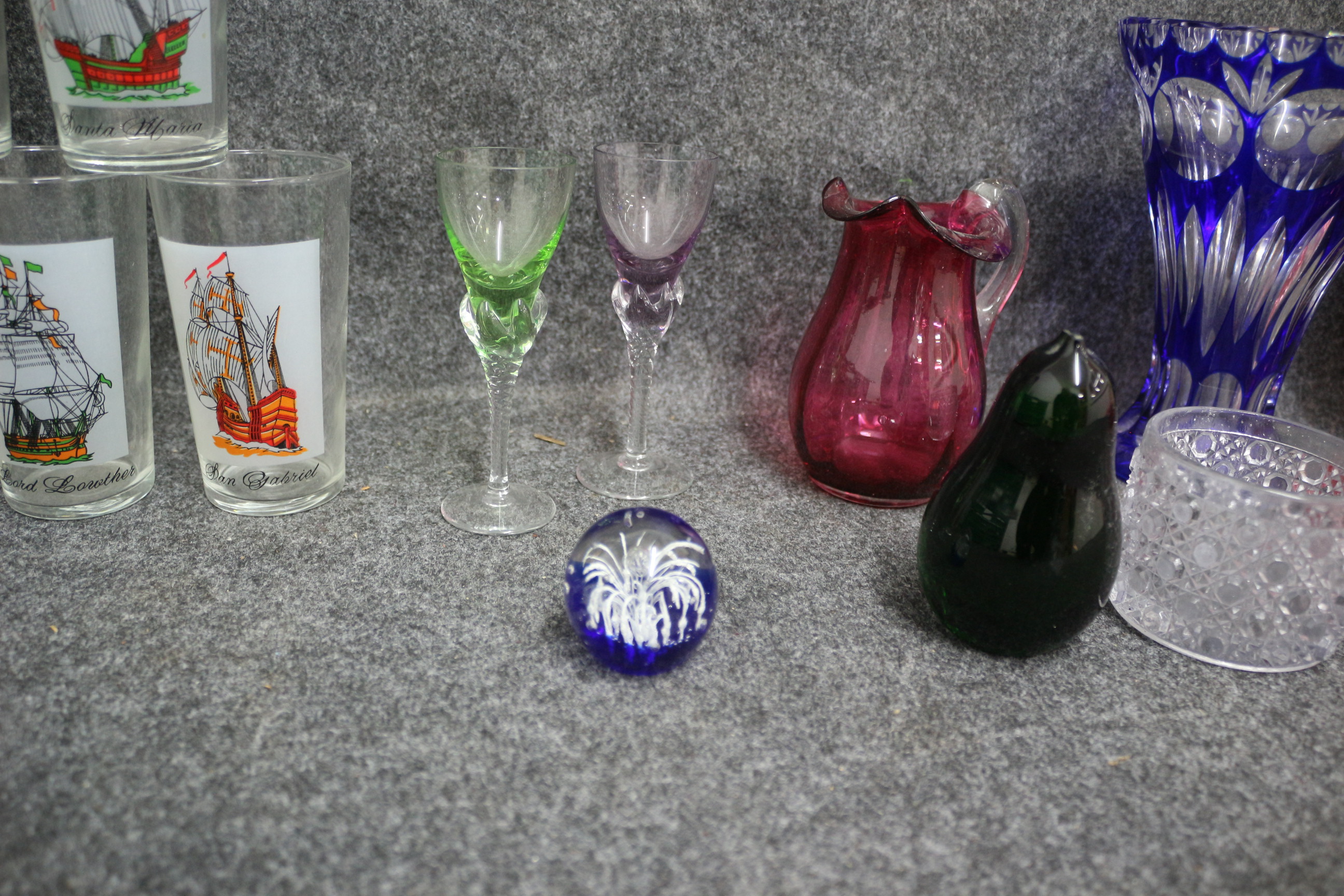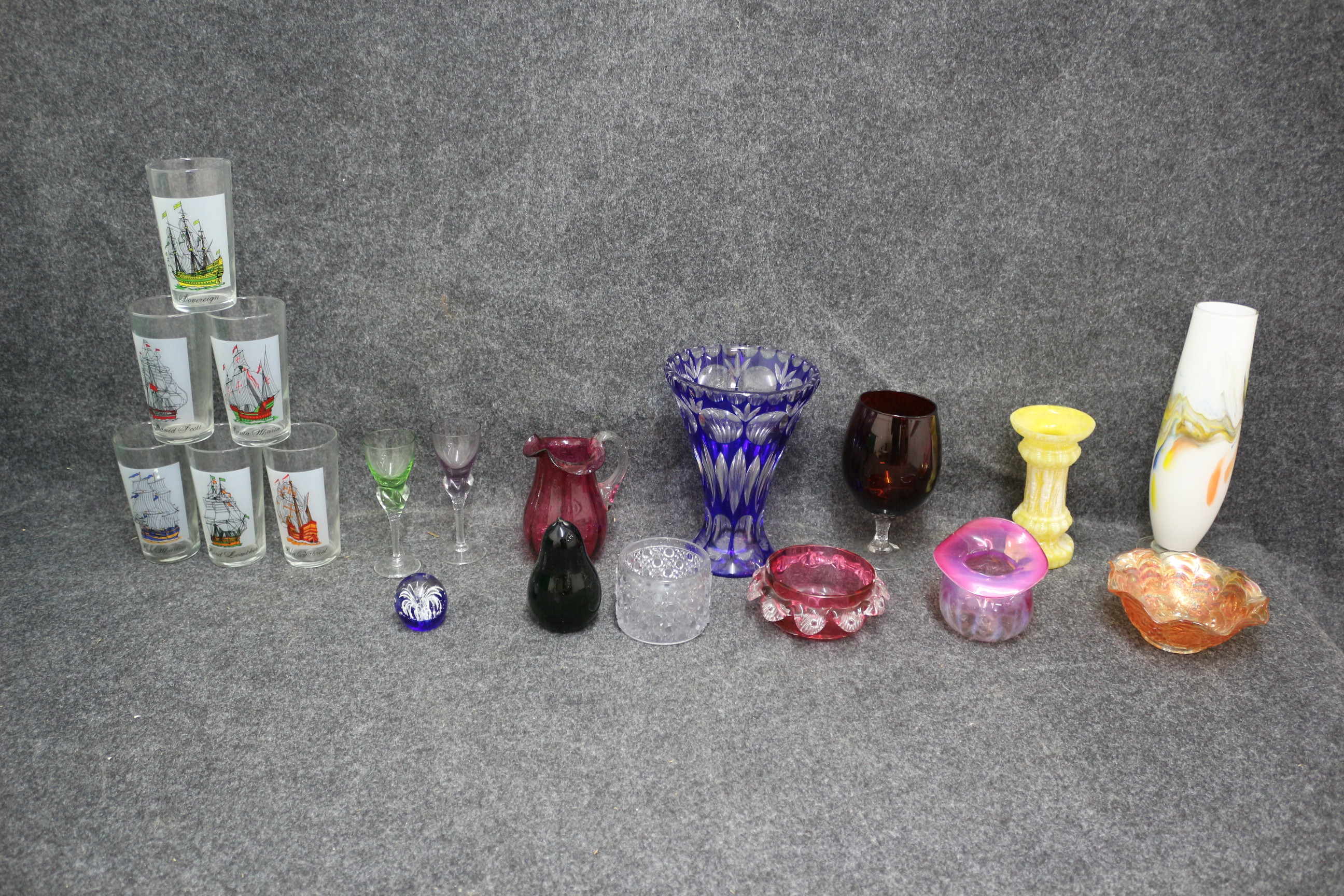 A collection of multi-coloured glassware featuring several vases, bowls, stemware, and a set of drinking glasses inscribed with ship names including Sovereign, Santa Maria, San Gabriel, David Scott, Lord Lowther, and Lord Wellington.