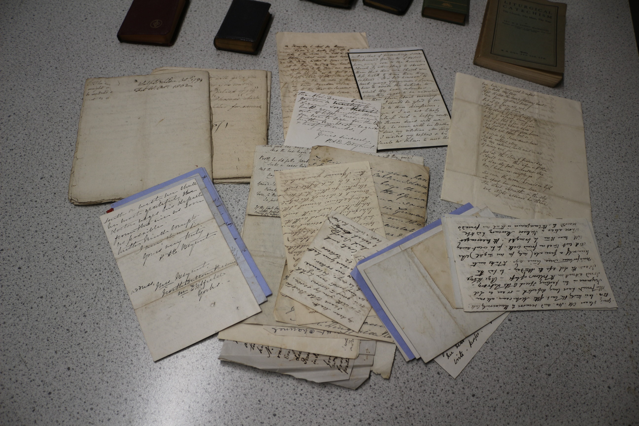 A collection small vintage books and a large group of handwritten letters and documents, including a ‘Liturgical Catechism’ and a ‘New Testament and Psalms’.