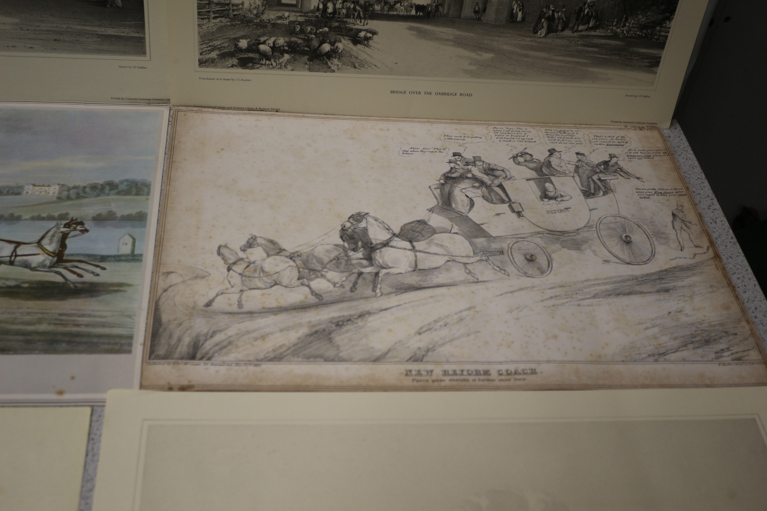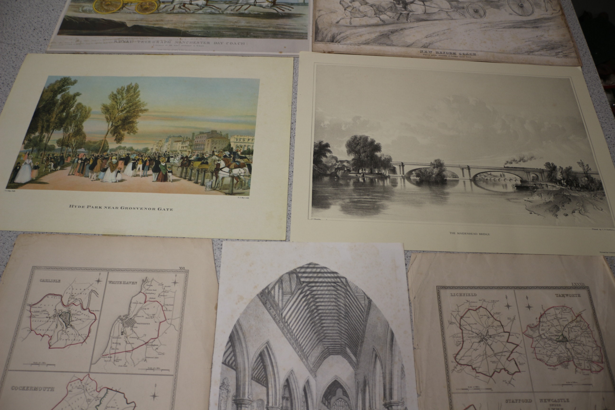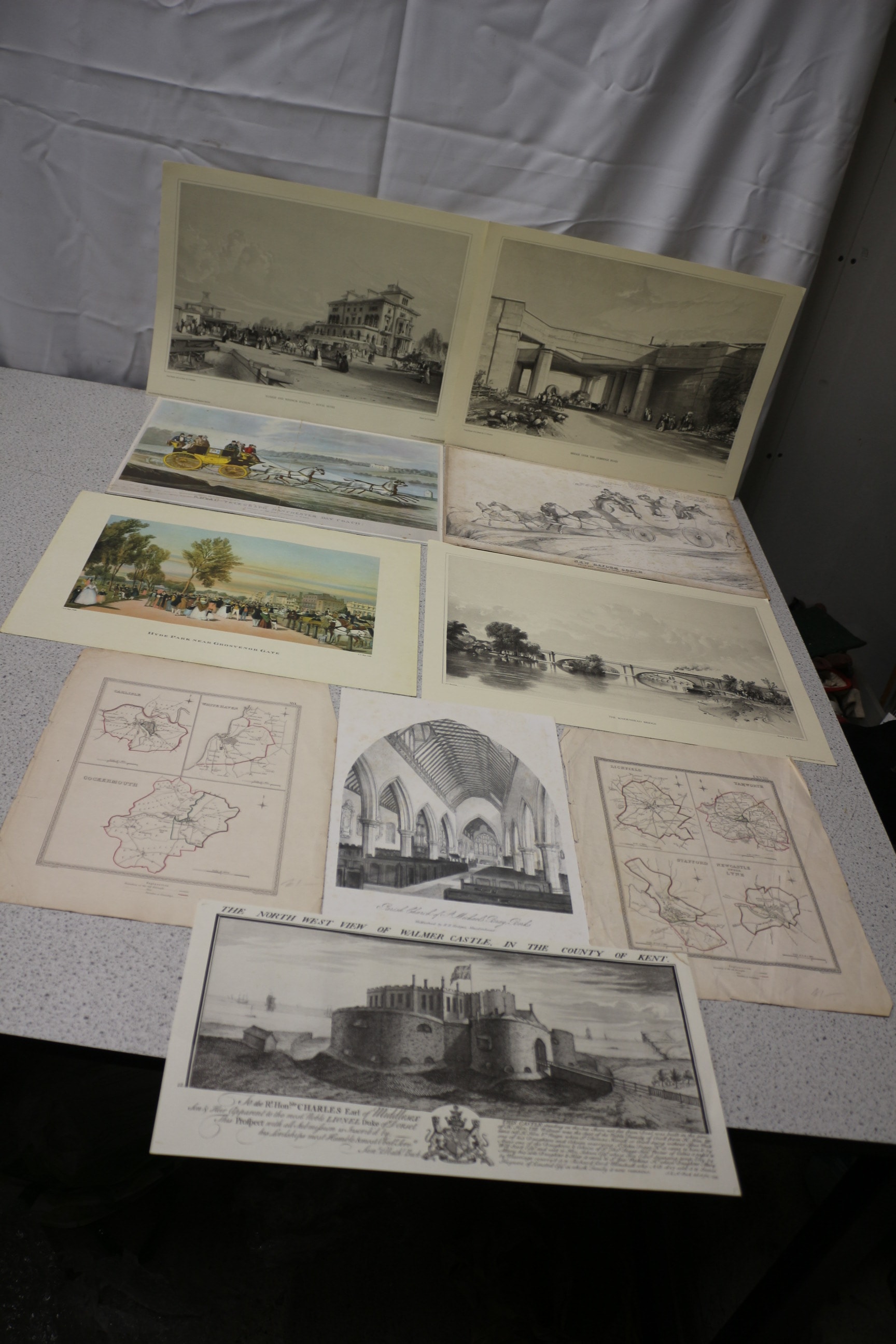 Ten historical prints and maps, predominantly monochrome with two coloured examples, depicting landscapes, architectural views, coaching scenes, and regional maps, with visible titles including ‘ROYAL TELEGRAPH MANCHESTER DAY COACH’, ‘HYDE PARK NEAR GROSVENOR GATE’, ‘Parish Church of St Michael’s, King’s-Brooks’, and ‘THE NORTH WEST VIEW OF WALMER CASTLE, IN THE COUNTY OF KENT.’
