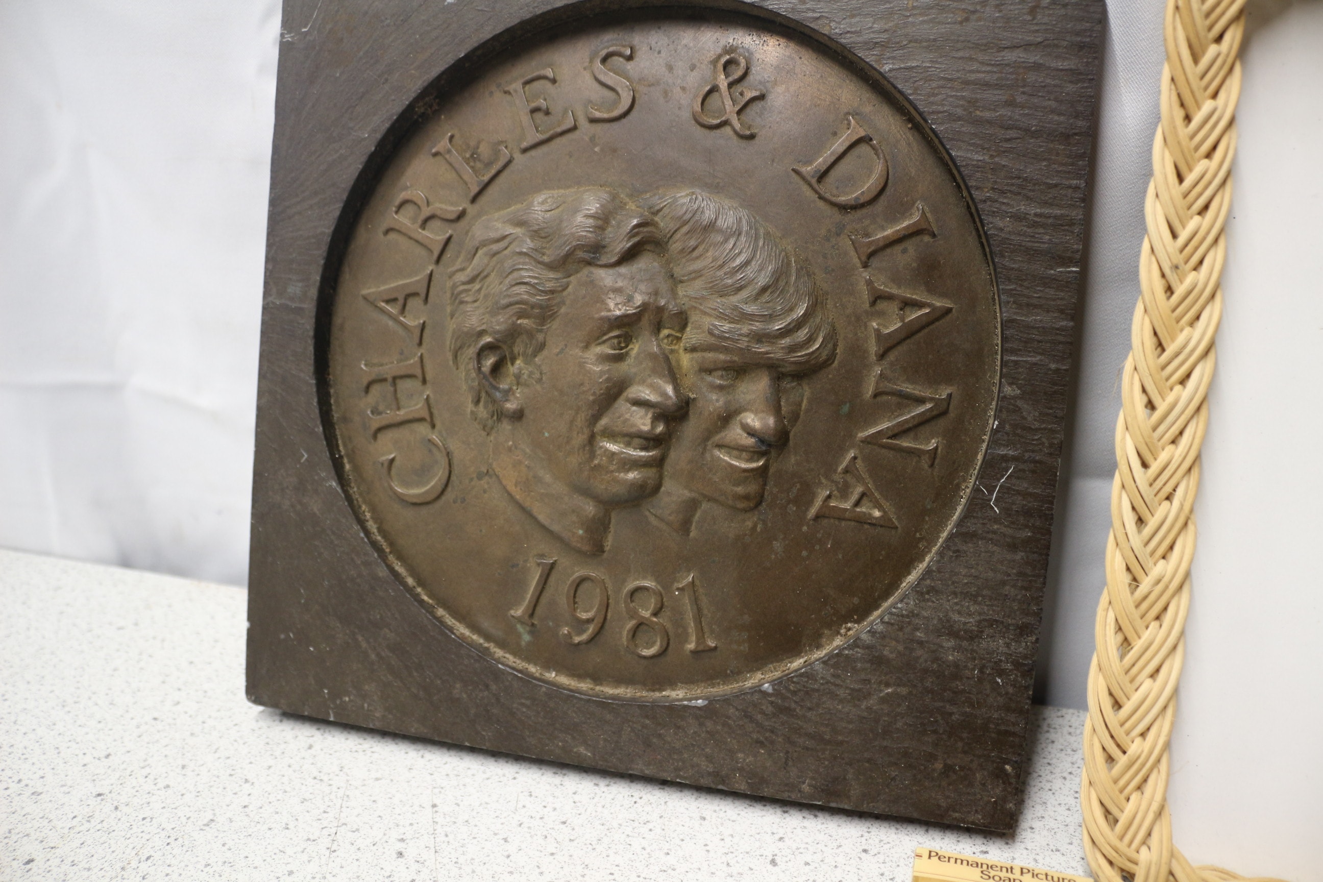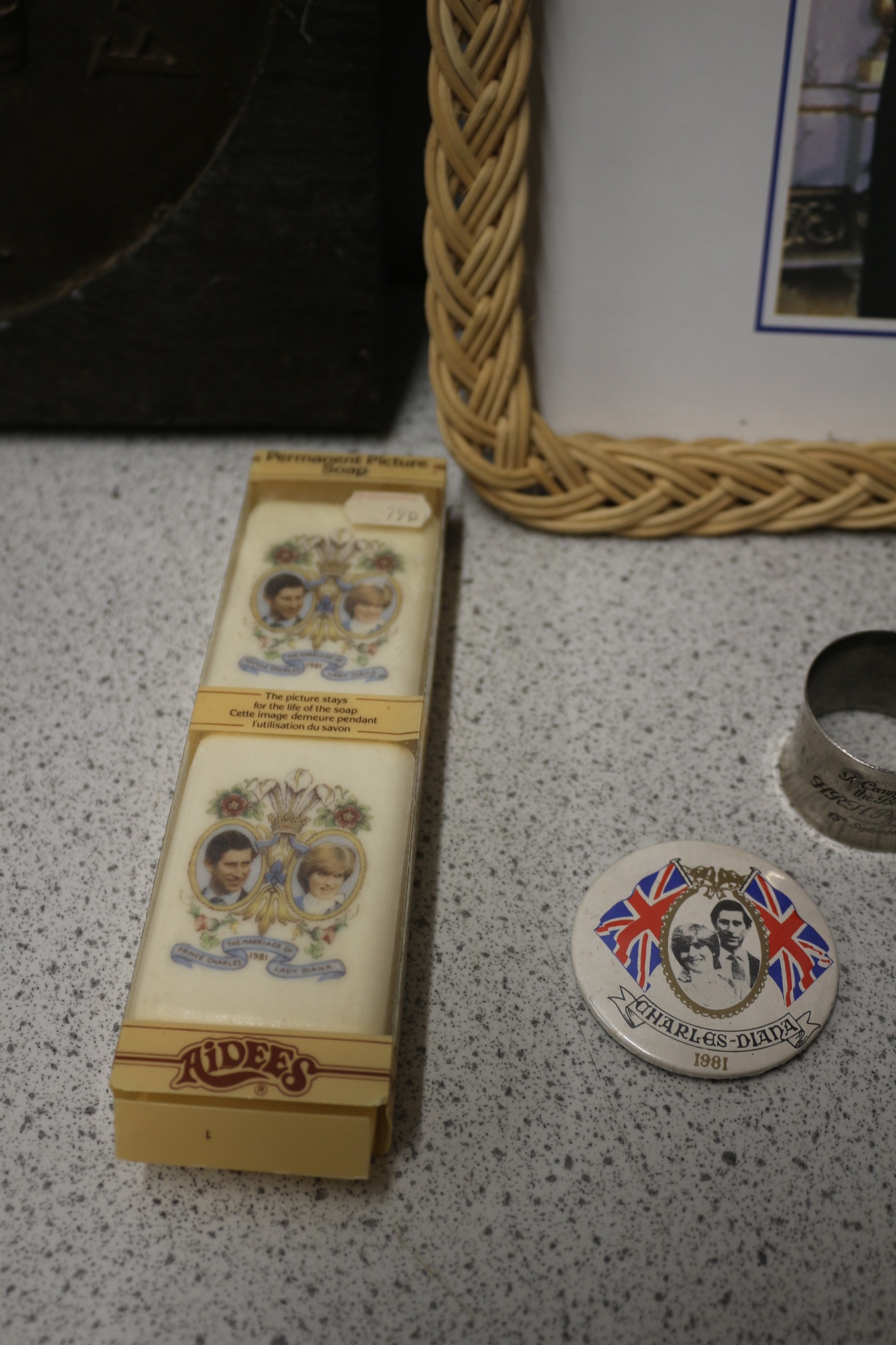 A collection of royal commemorative items including a Charles & Diana 1981 brass medallion plaque, a SMIT of Guildford Surrey UK rattan-framed tray for Prince William’s 1982 christening, two AIDEES Charles & Diana soaps, two Prince Henry 1984 napkin rings, and a Charles & Diana 1981 pin badge.