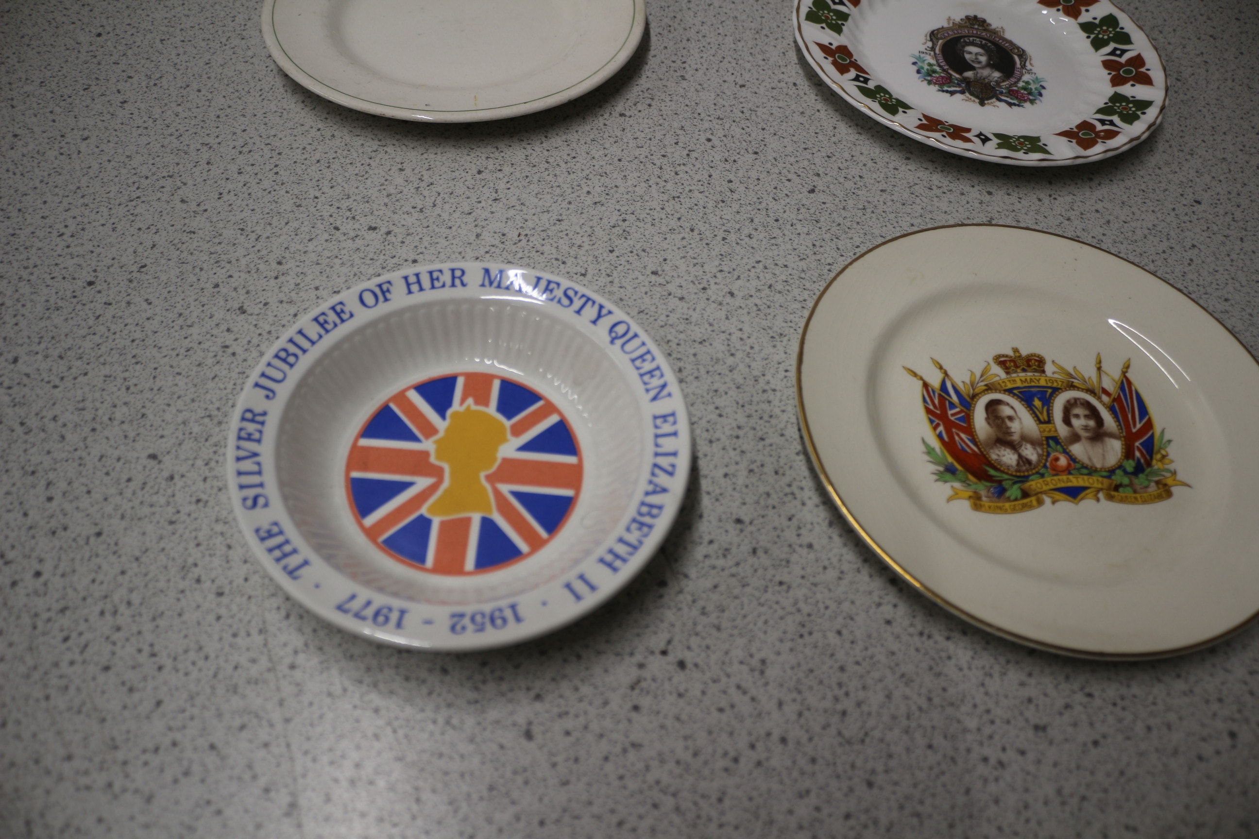 A collection of nine ceramic commemorative plates and dishes, many depicting Queen Elizabeth II and celebrating various royal events. Including Silver Jubilee 1977