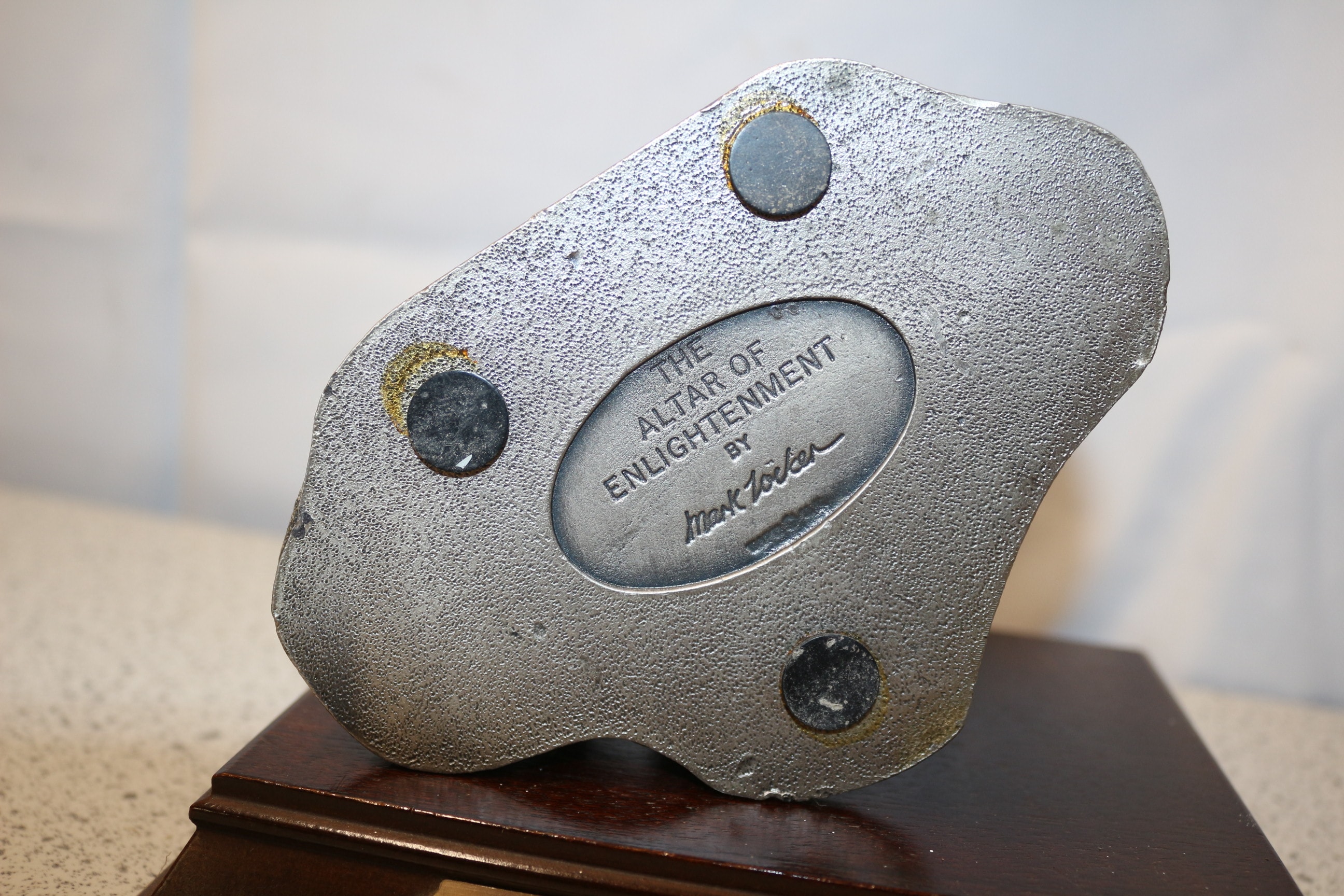 A metallic grey/silver pewter figurine, ‘The Altar of Enlightenment’ by Mark Zöker, depicting three robed figures around an altar with a blue gem and iridescent orbs on a dark brown wooden base. 13cm tall