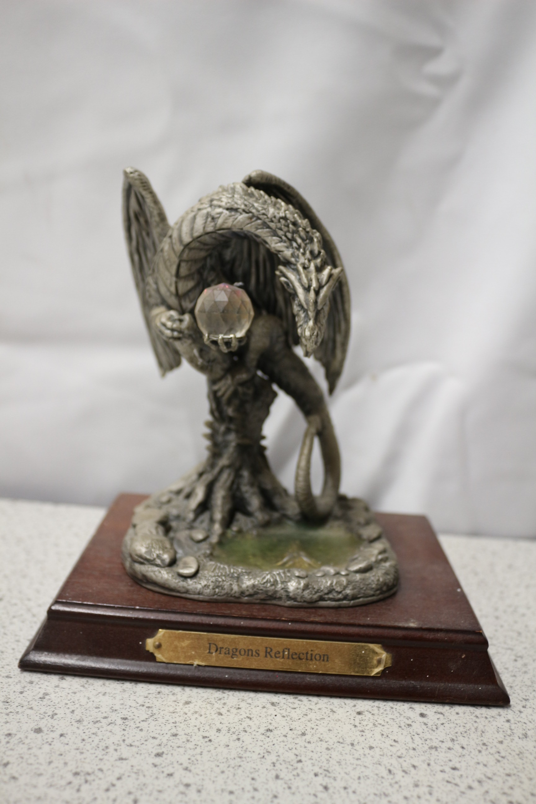 A silvery-grey dragon sculpture holding a clear crystal sphere, on a green-accented base, mounted on a brown wooden plaque, labelled ‘2001 ONE YEAR ONLY PIECE’. 16.5cm tall
