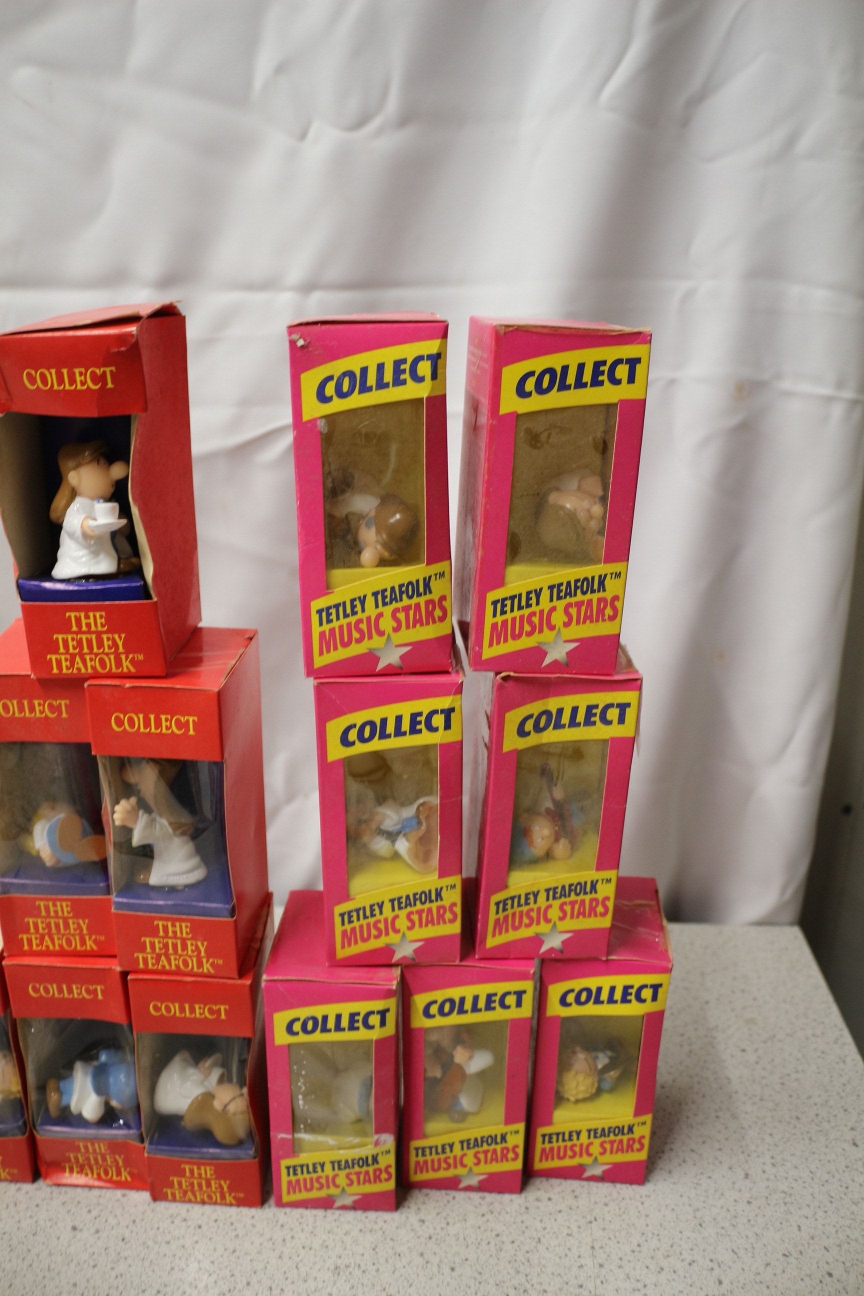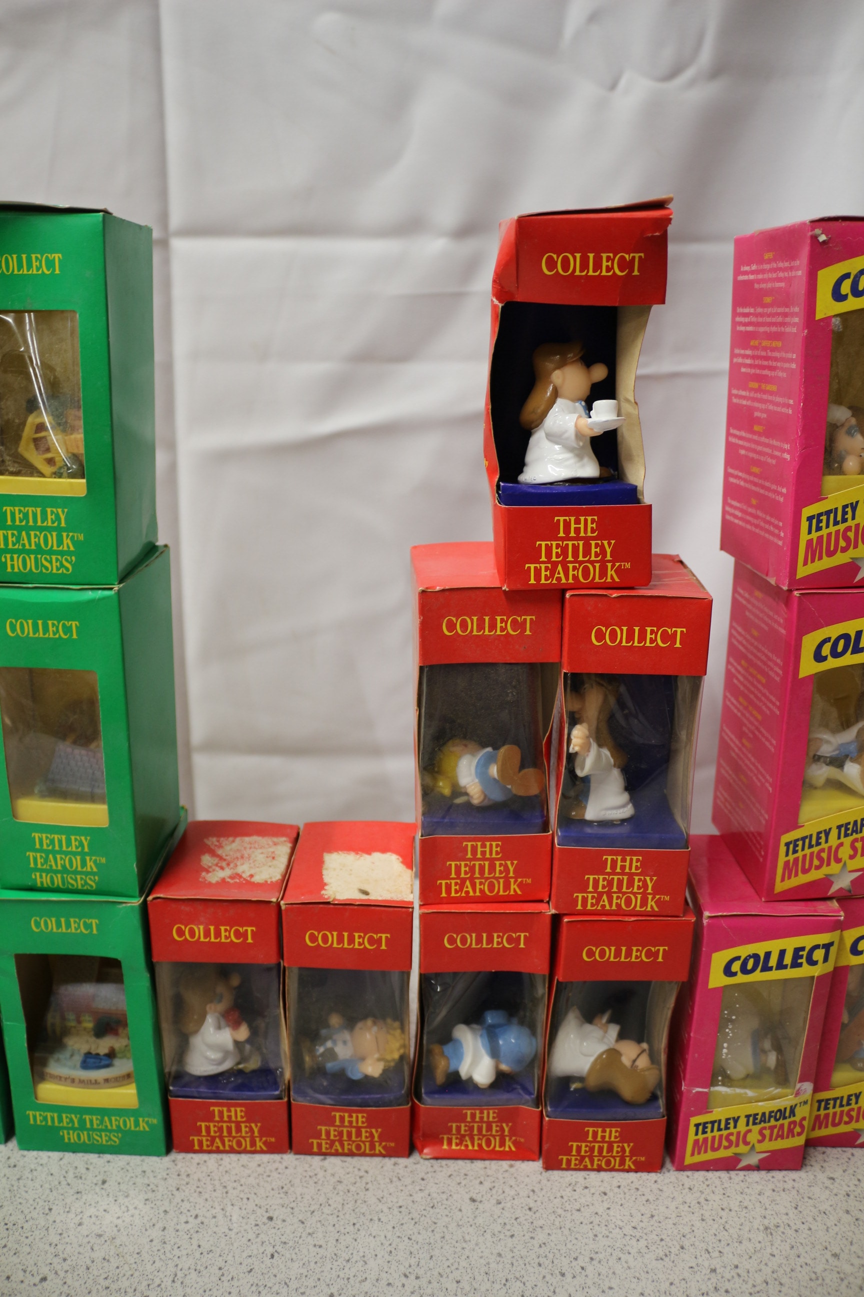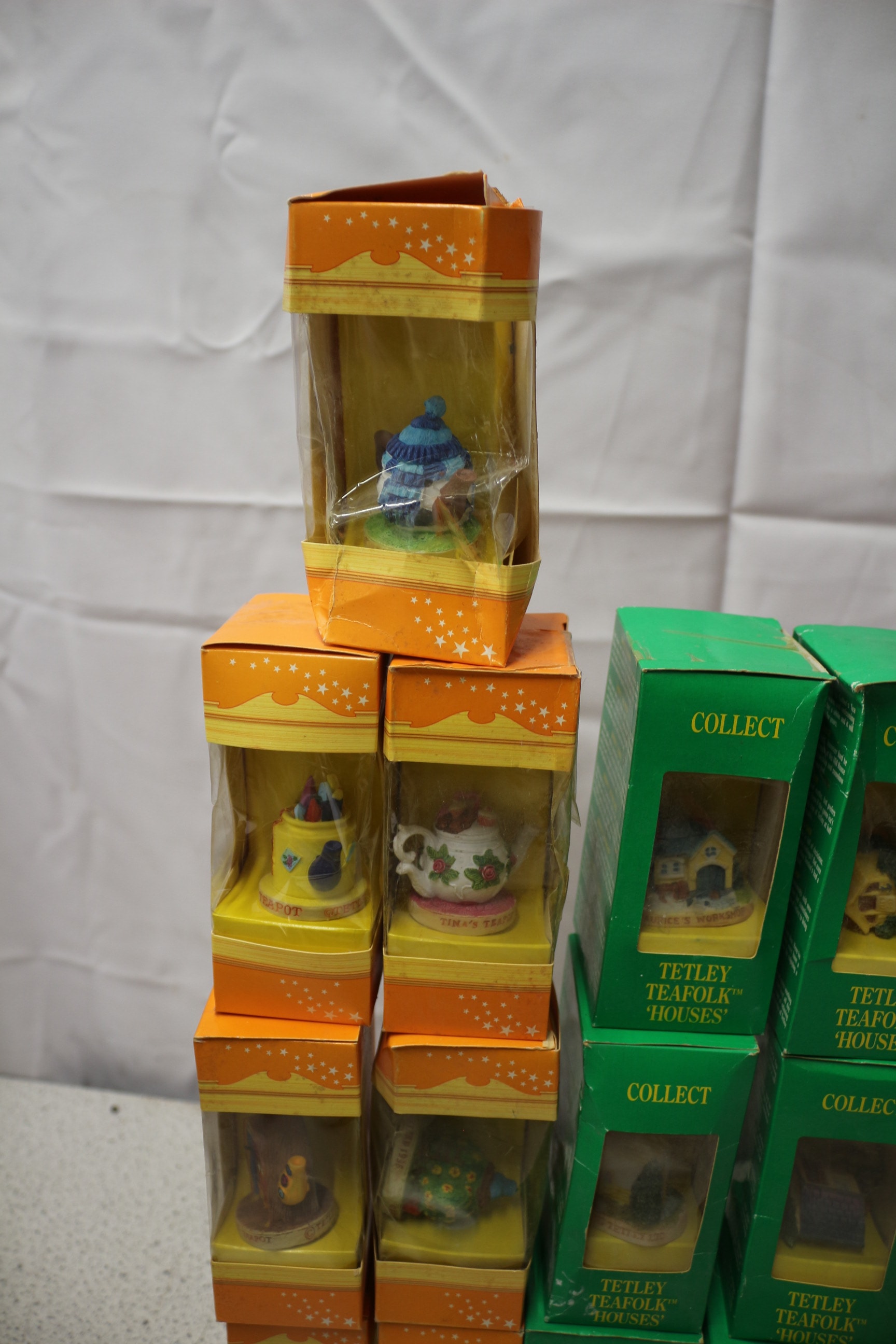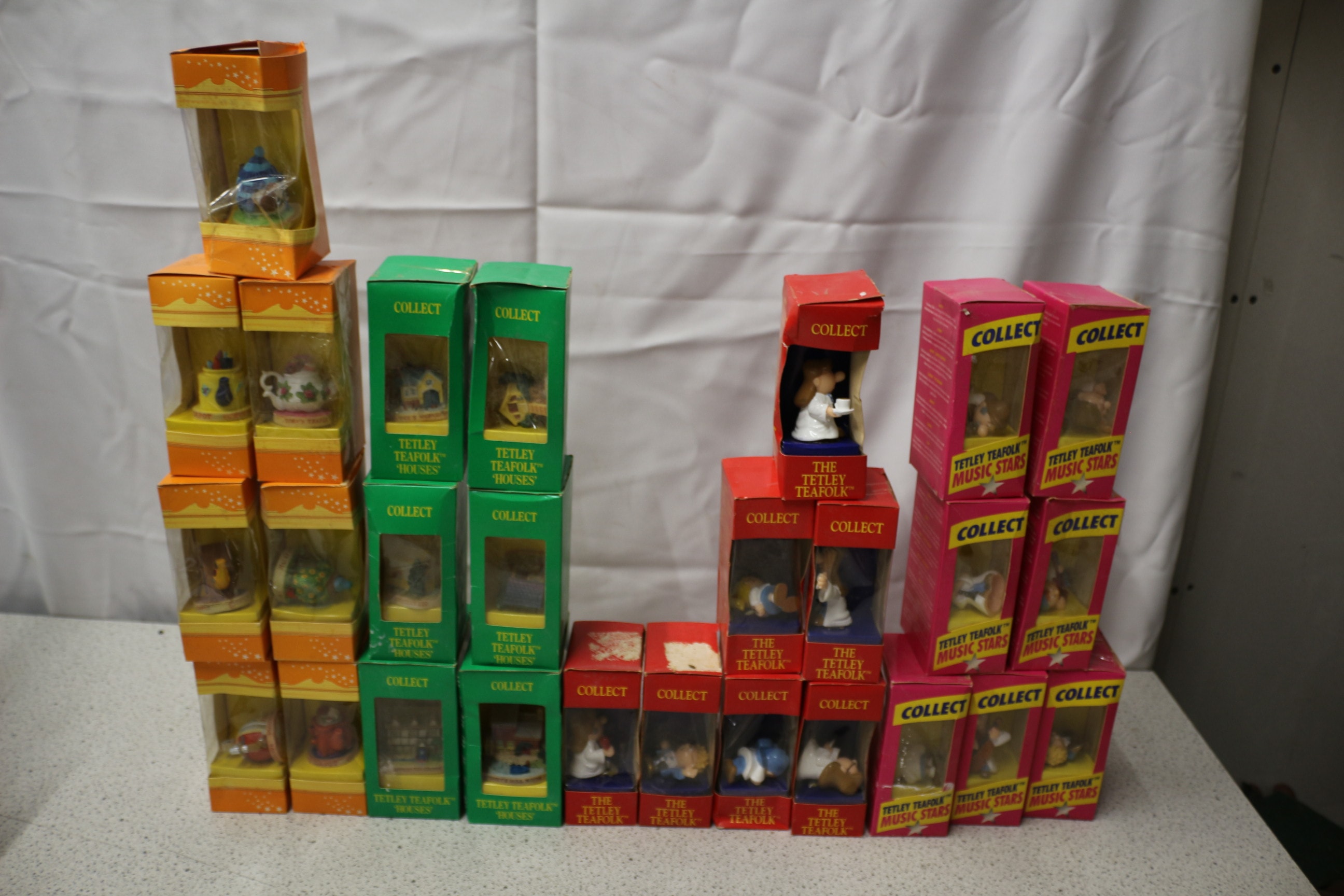 A collection of 27 assorted Tetley Teafolk™ collectible miniature figurines and houses, presented in orange, green, red, and pink “COLLECT” display boxes, including “TINA’S TEAPOT”, “ALICE’S WORKSHOP”, “THE TETLEY TEAFOLK™”, and “TETLEY TEAFOLK™ MUSIC STARS” series, with multi-coloured figurines.