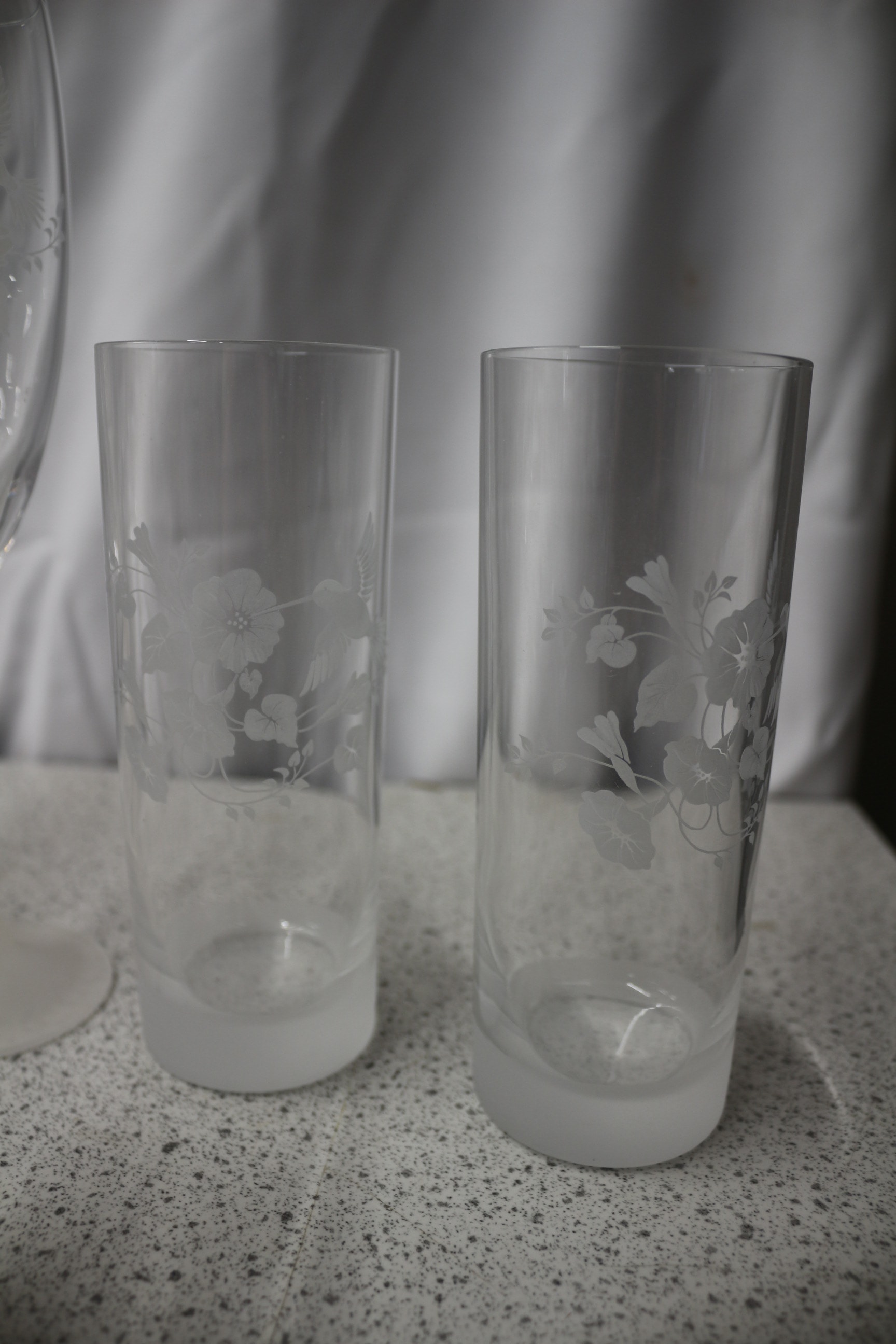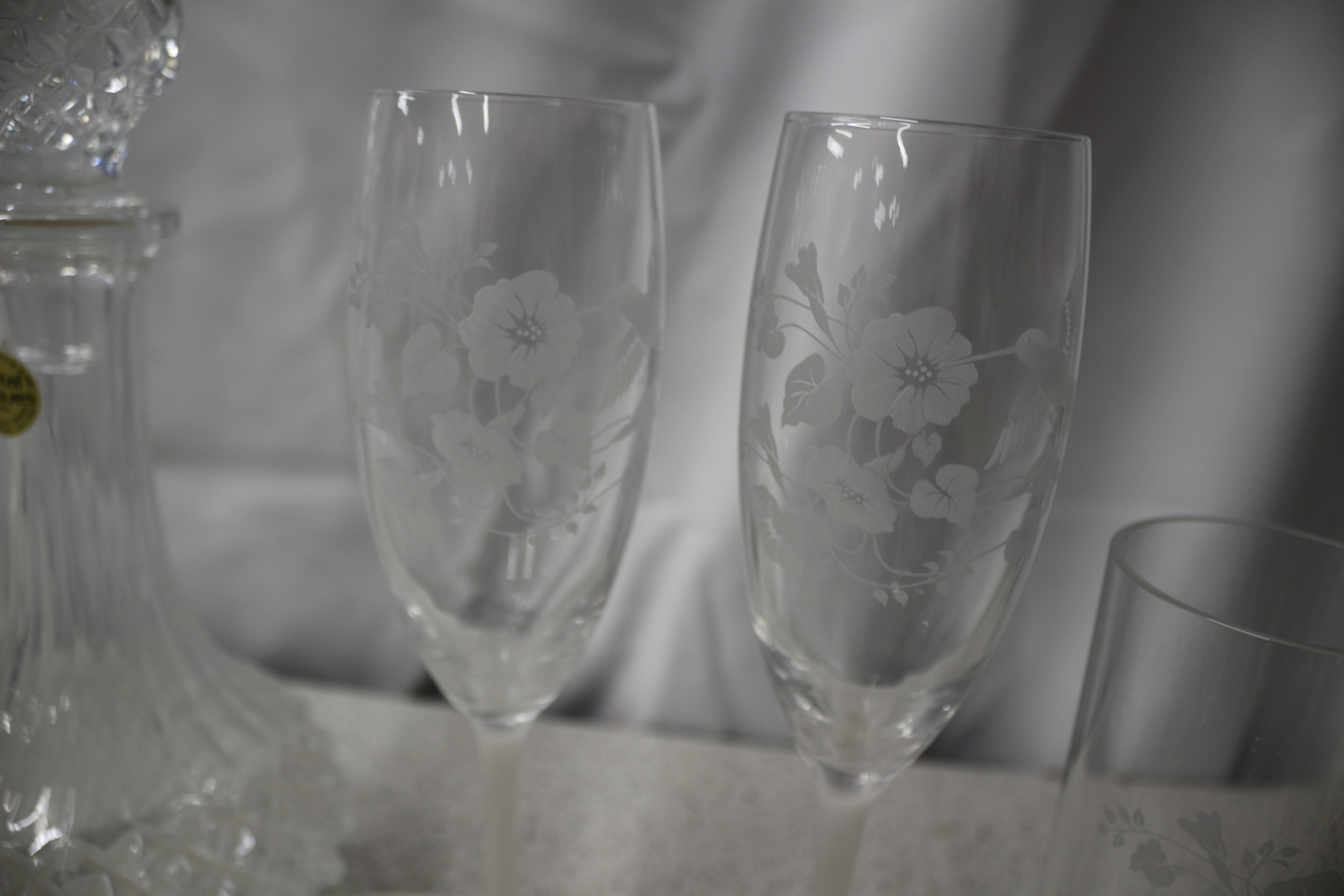 A collection of frosted etched glass pieces, including one Cristal d’Arques Genuine French Lead Crystal decanter, one bud vase, two wine glasses, two champagne flutes, two tumblers, and two small bowls, all featuring bird and floral etched designs.